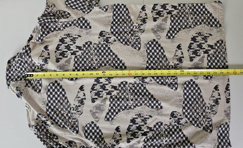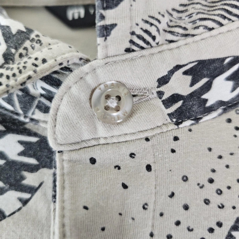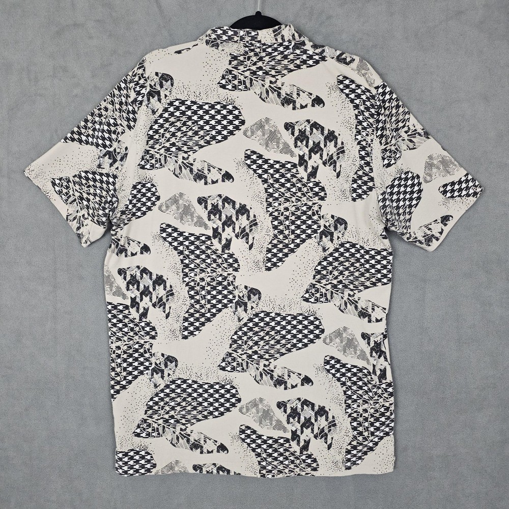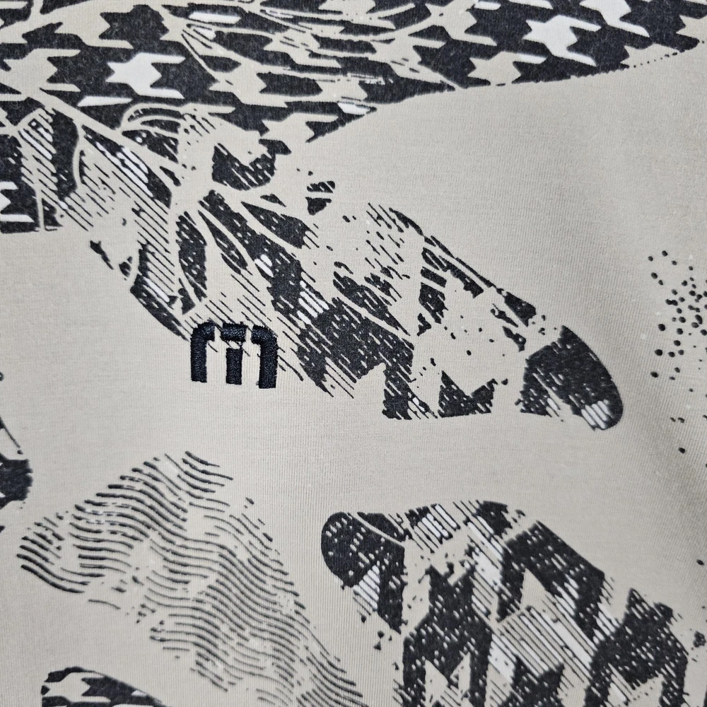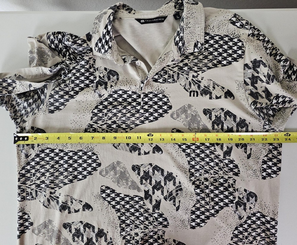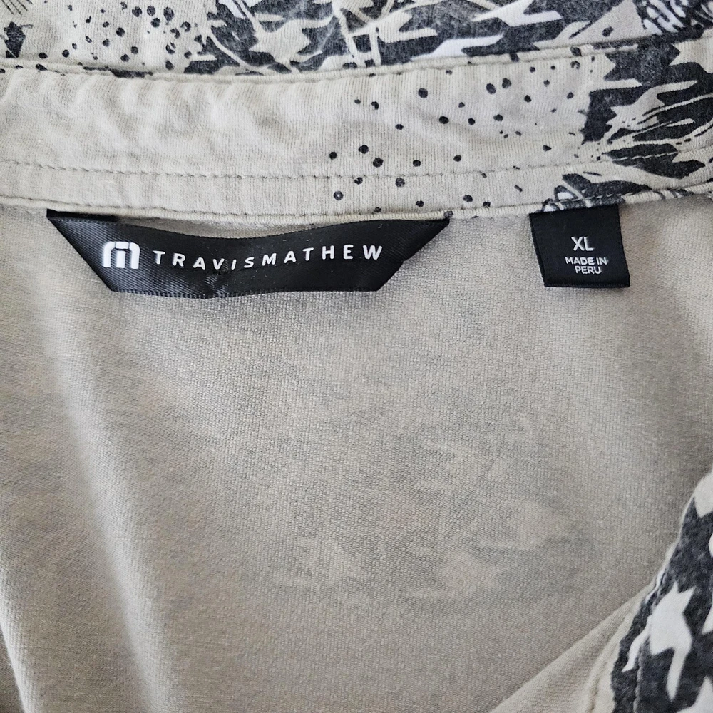 Travis Mathew Polo Shirt Mens XL Beige Abstract Graphic Golf Performance Casual Pre-owned with gentle overall wear and light wrinkling from wash and storage. Fabric, collar, placket, buttons, and hems are clean, intact, and fully functional. All-over graphic print and embroidered chest logo are sharp without cracking, fading, stains, or holes. Brand: TravisMathew. Style: Mens short sleeve polo golf shirt with a casual performance-inspired design. Color and pattern: Beige base with black and gray abstract graphic print featuring mixed houndstooth-style shapes throughout. Gender: Mens. Tag size: XL. Fabric and texture: Soft lightweight jersey knit fabric with comfortable stretch suitable for activewear and everyday wear. Neckline and collar: Classic point collar with a three-button front placket. Sleeves: Short sleeves with standard turned hems. Logo and branding details: Small embroidered TravisMathew "m" logo at the front, branded button at the placket, and woven TravisMathew neck label. Occasion and use: Designed for golf, activewear, and casual outings in spring and summer seasons. Country of manufacture: Made in Peru, as stated on the interior size tag. Special note: Listing is for the polo shirt only. MShirt16