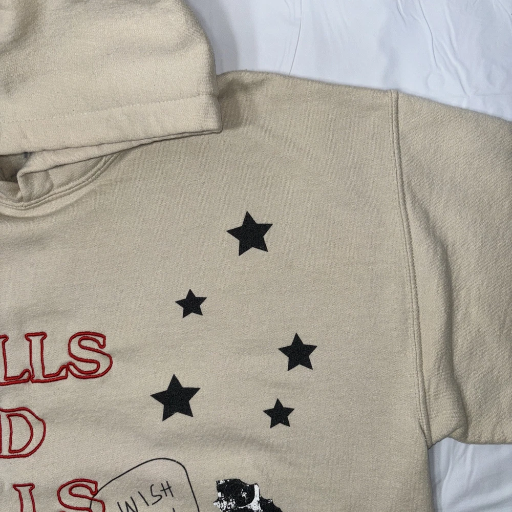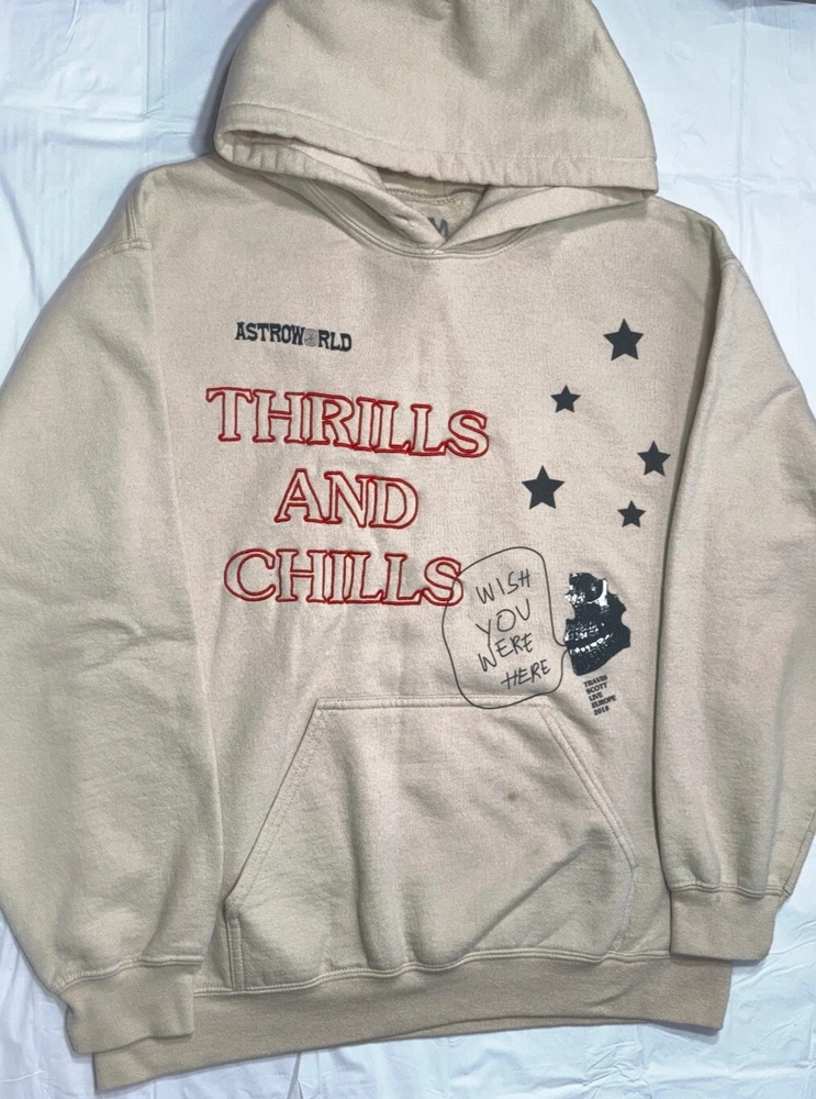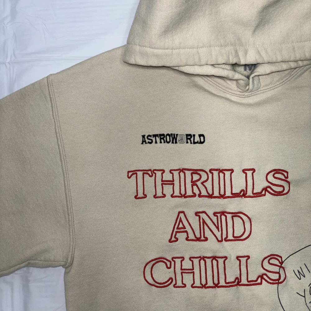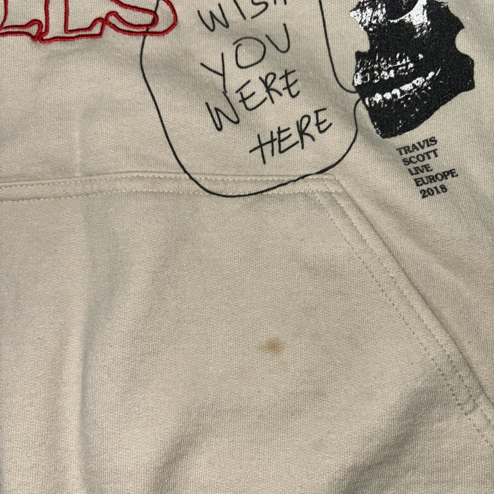 The hoodie is a size M and is perfect for men who want to show off their love for Travis Scott. It is ideal for casual wear and is sure to turn heads wherever you go. So, if you want to stay warm and stylish while showing off your love for one of the most popular rappers in the world, this hoodie is the perfect choice. The hoodie is used comes in size M ..we tried to put everything in the picture so everything can be visible ..they are some small marks and spot but still the hoodie is in good condition to any fan or collector …and very warm also ☺️ Please before purchase feel free to reach out to us for any questions or to post more pictures 🙂