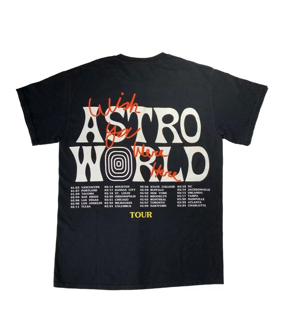 Travis Scott Astroworld Wish You Were Here Reprint T-Shirt Tour About The unisex heavy cotton tee is the basic staple of any wardrobe. It is the foundation upon which casual fashion grows. All it needs is a personalized design to elevate things to profitability. The specially spun fibers provide a smooth surface for premium printing vividity and sharpness. No side seams mean there are no itchy interruptions under the arms. The shoulders have tape for improved durability. Key features Shoulder tape Twill tape covers the shoulder seams to stabilize the back of the garment and prevent stretching Fiber composition Solid colors are 100% cotton; Heather colors are 50% cotton, 50% polyester (Sport Grey and Antique colors are 90% cotton, 10% polyester. Ash is 99% cotton, 1% polyester) Without side seams Knitted in one piece using tubular knit, it reduces fabric waste and makes the garment more attractive Ribbed knit collar without seam Ribbed knit makes the collar highly elastic and helps retain its shape Fabric Made from specially spun fibers that make a very strong and smooth fabric that is perfect for printing. The "Natural" color is made with unprocessed cotton, which results in small black flecks throughout the fabric Care instructions Machine wash: warm (max 40C or 105F); Non-chlorine: bleach as needed; Tumble dry: medium; Do not iron; Do not dryclean.