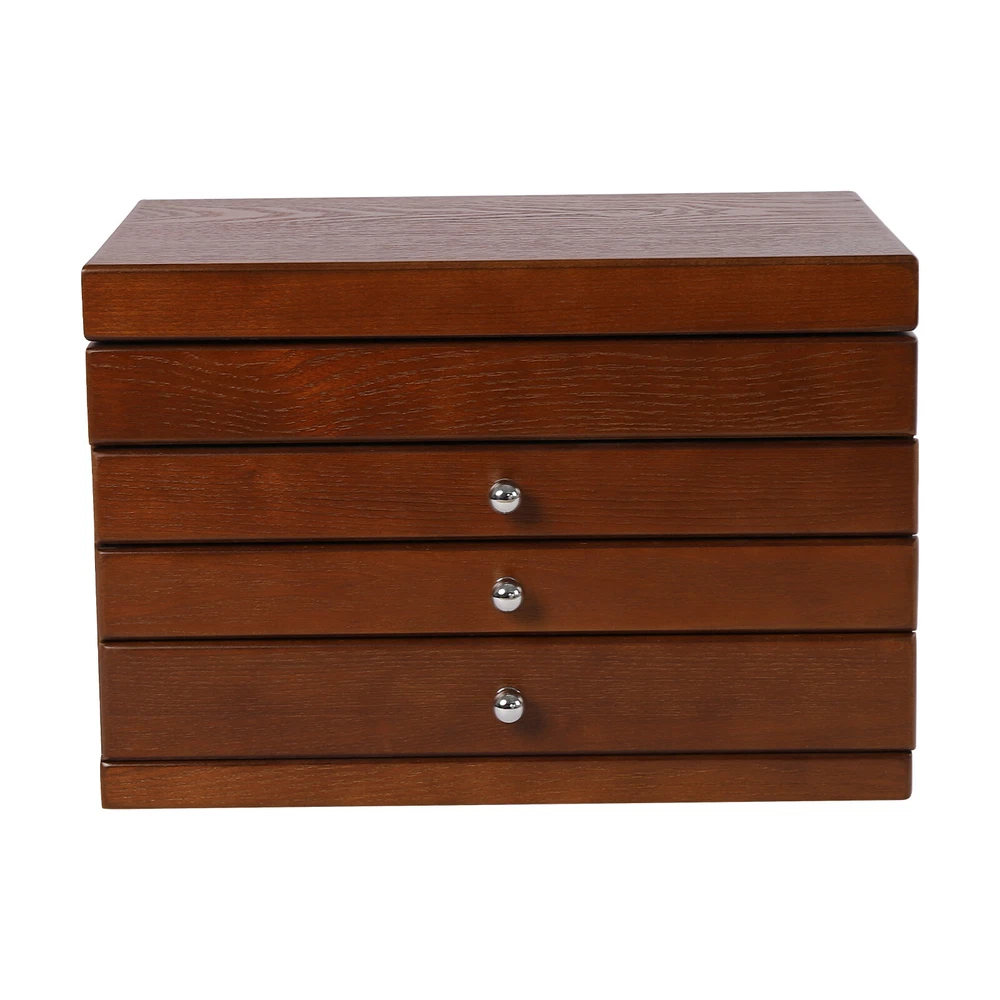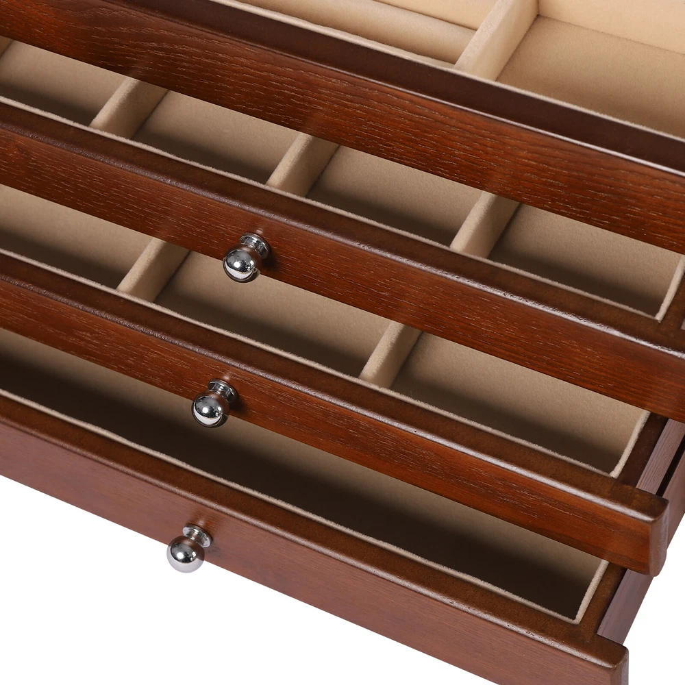 Treasure Jewelry Chest Organizer 4 Tier Vintage Wooden Storage Box With Mirror Description Are you afraid of being late for your next appointment? Don't waste another second! This 4-tier wooden jewellery box can help you save precious time in the morning before you go to your day's work because it comes with a large mirror. It has 4 tiers to ensure its enough storage capacity. The durable construction and high-quality velvet interior protect your treasures from scratches and dust. Specification Material: MDF Color: Original Wood Finish Type: Odorless Paint Shape: Rectangular Special Feature: Large Capacity, Jewelry Organizer Number of Drawers: 3 Style: Classic Package Size: 36.5*26.5*36.5cm/14.37*10.43*14.37in Product Size: 30.1*20*20.6cm/11.8*7.9*8.1in Gross Weight: 5.5kg/12.13lbs Net Weight: 5kg/11.02lbs Key Features Large Capacity : It has 4 tiers to ensure its enough storage capacity. It provides more space for your cufflinks, rings, ties clips, necklaces or watches, etc. Sorted Storage : 3 pull-out drawers can sort and store some jewelry. Your frequently worn earrings, rings and other jewelry can be stored in the top open-lid jewelry tray which is designed with special sections for rings and watches. Humanized Design : The closed way can effectively prevent dust and prevent your items from losing their luster. In addition, the soft velvet lining protects your beloved jewelry from scratches and damage. Meanwhile, the built-in large mirror provides convenience when dressing. Elegant Look : The wood grain texture and soft premium velvet lining create a classic and luxurious feel. Using it to store your accessories will give them a sophisticated look. High Quality : It is made of high-quality MDF and coated with clean paint, so it is not only very strong, wearable, and durable but also odorless and safe. Easy to Clean : The painted surface is very smooth, so you only need to wipe it with a rag to make it look new. Ideal Gift : This 4-tier wooden jewellery box has a sophisticated look and practical features that every girl needs, so it's a great choice for your girlfriend or any female friend. Customer Service : We aim to provide quality products and services. If you have any problems, please feel free to contact us. We will reply and solve the problem for you as soon as possible. Details Metal Handle : Each drawer comes with a delicate metal handle that is beautiful and easy to open at the same time. Rounded Corners : All the corners are rounded to prevent you from scratching your hands when you take the items, which is a very thoughtful design. Application It can be used in bedrooms as well as large shopping malls and accessory stores to organize rings, jewelry, hair accessories, etc. Package Included 1*4-Tier Wooden Jewellery Box Notes Please allow the slight color difference caused by the shooting light and 1-3 cm error due to manual measurement, and make sure you do not mind before ordering. Payment Delivery details Terms of sales About us Contact us Payment We accept ebay payment 。 Fees such as import duties, taxes are not included in the item price or shipping costs. These charges are the buyer's responsibility. Delivery details Shipping: 2-9 working days to: USA Terms of sales We maintain high standards of excellence and strive for hundred percent customer satisfaction. Feedback is very important to us. We hope that you contact us immediately before you give neutral or negative feedback, so that we can address your concerns. It is impossible to address issues if we do not know about them! About us Your satis faction is our ultimate goal. We work hard to earn your trust and future business. Our certified technicians have tested each item before shipping. The unit comes with 1 year limited warranty on all manufacturing defects. a) If you receive a defective item, you may return it or ask for a discount. Please contact us within 14 days after you receive the package. b) What you returned must be intact and in its original packaging as re? u. Customer is responsible for shipping costs of the returned item. c) We will cover the cost of shipping back t with the shipping rate indicated in the registration page. We will send you a new unit or refund the full payment you paid. Thank you. Contact us Business Hour Business Hour: Monday To Friday: 8:30 AM to 5:00 PM (Beijing China time) Due to time zones, our reply to your questions may not be immediately. But within above working time, we will reply your email within 24 hours. If it's non-workdays, please kindly be patient and wait till Monday. Please contact us with ebay message. Please feel free to contact us if you have any questions. Monday To Friday: 8:30 AM to 5:00 PM (Beijing China time) Due to time zones, our reply to your questions may not be immediately. But within above working time, we will reply your email within 24 hours. If it's non-workdays, please kindly be patient and wait till Monday. Please contact us with ebay message. Please feel free to contact us if you have any questions.