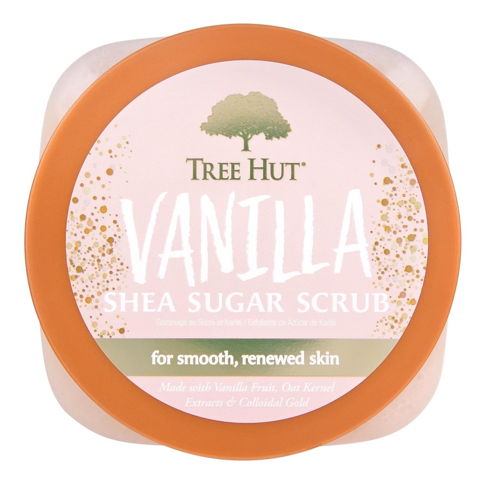 Reveal glowing skin with Tree Hut Sugar Body Scrub in the creamy, classic scent of Vanilla. Made with Sugar, Shea Butter, Vanilla, Colloidal Gold and an array of natural oils like Evening Primrose, Avocado, Macadamia, Sweet Almond, Safflower and Orange Oils. ELEVATE YOUR SHOWER ROUTINE: We formulate with high concentrations of skin-loving, plant-based ingredients that leave your skin feeling healthy and strong. Our assortment boost any shower routine with natural ingredients perfect for all skin types. Tree Hut Shea Sugar Scrub is perfect to use as a prep for shaving, tanning, or restoring youthful shine. REAL SHEA, REAL RESULTS: 100% all-natural premium shea butter delivers deep moisturization that nourishes and softens dry skin while helping promote elasticity and hydrate without stripping moisture. Our Shea Sugar Scrub is proudly vegan, paraben-free, sulfate-free, alcohol-free, with no formaldehyde donors, and always cruelty free! REVEAL VIBRANT SKIN: Apply a generous amount of Tree Hut Body Scrub to damp or dry skin. Buff in circular motions for even coverage and effective exfoliation. Rinse well and enjoy silky-smooth skin. Our specially formulated array of sugar and natural oils gently polishes away dead skin to reveal a beautiful, radiant glow. AMAZING SCENTS: Indulge in the smooth scent of creamy vanilla bean with key notes of warm sandalwood and coconut cream. Colloidal Gold is known to plump skin and help improve skin elasticity Vanilla contains antioxidant properties and is known to hydrate skin Product Dimensions 3.69 x 3.69 x 2.84 inches; 1.13 Pounds Item model number 700294 UPC 075371002946 Manufacturer Naterra International, Inc. Country of Origin USA Brand Tree Hut Skin Type All Product Benefits Hydrating, Exfoliating, Replenishing, Nourishing, Softening Item Form Scrub Active Ingredients Shea Butter 6853521