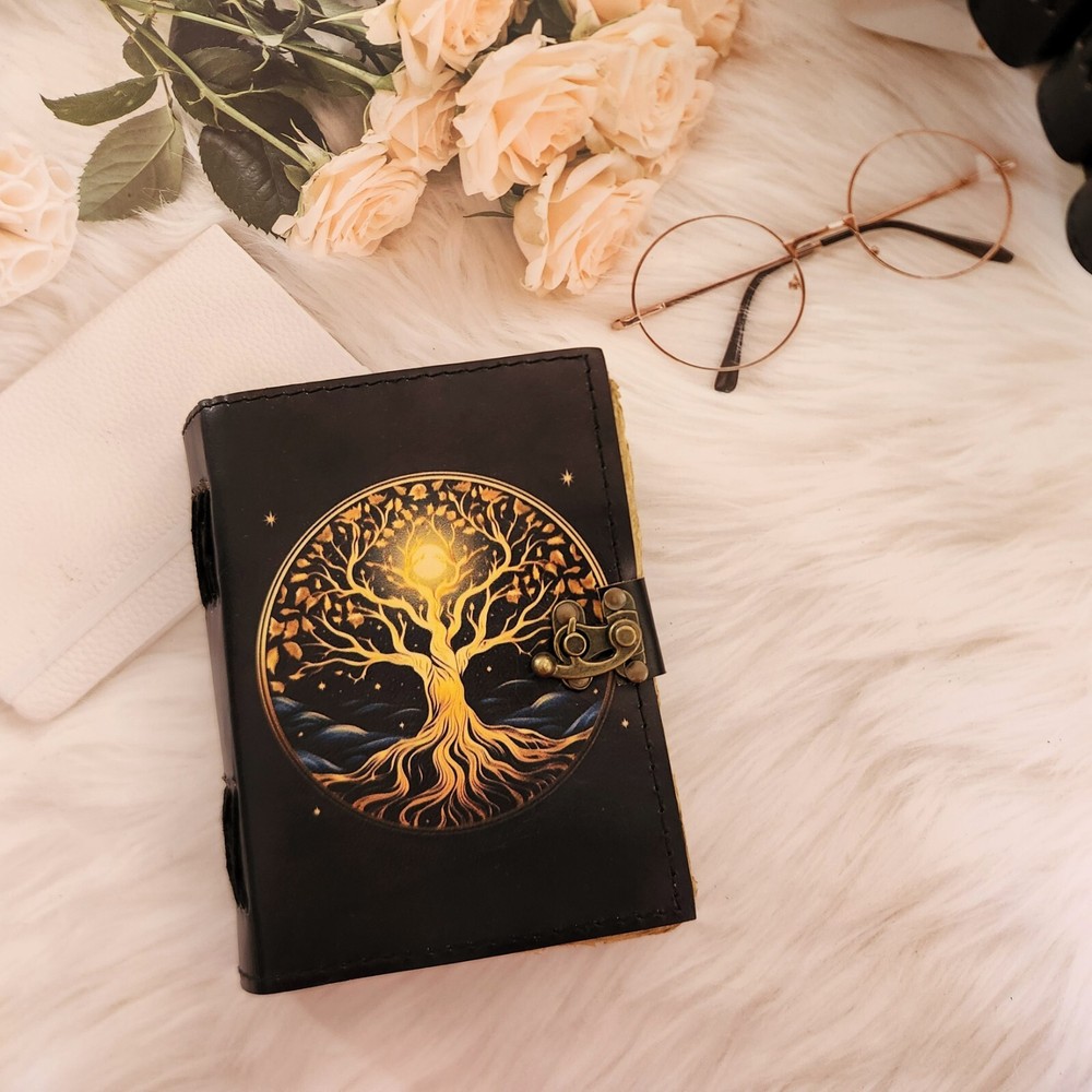 Tree & Moon Leather Journal – Handmade Leather Notebook with Lock Closure Features: ✔ Premium Leather Cover – Crafted from high-quality genuine leather with a rustic. ✔ Unique Tree & Moon Design – Embossed details add a mystical touch, making it a perfect keepsake. ✔ Deckle Edge Pages – 200 handcrafted, unlined pages with a natural deckle finish for a timeless feel. ✔ Secure Lock Closure – Keeps thoughts, sketches, and memories safe. ✔ Multipurpose Use – Ideal for writing, sketching, journaling, or gifting. Available Sizes: 📖 7x5 inches – Perfect for travel and everyday journaling. 📖 10x7 inches – A balanced size for creative writing or sketching. 📖 13x10 inches – Large and spacious for artwork, journaling, or guest book use. 🎁 Great for: Writers, artists, and dreamers Weddings, birthdays, and anniversaries Personalized gifts for loved ones Customization Available! Add initials or a special message for a unique touch. 📦 Fast & Secure Shipping – Delivered with care. ✨ Handmade with Love – Each journal is one of a kind.