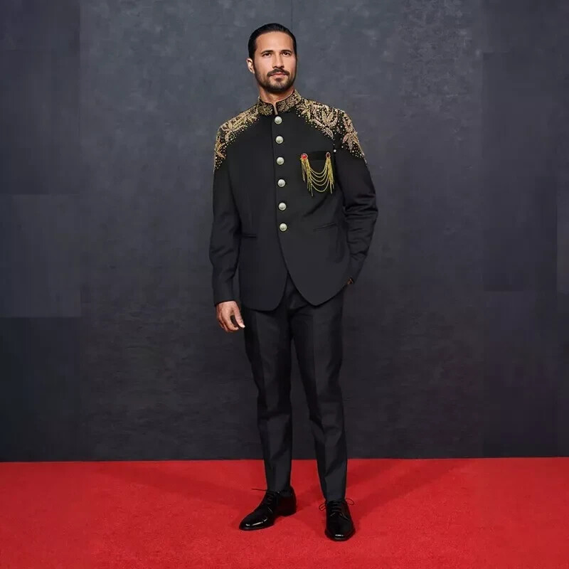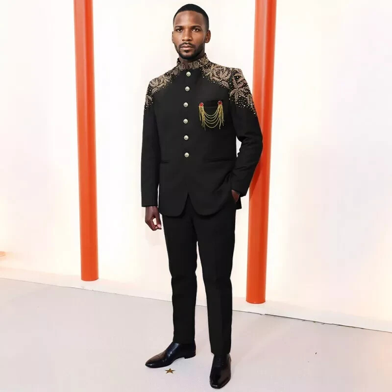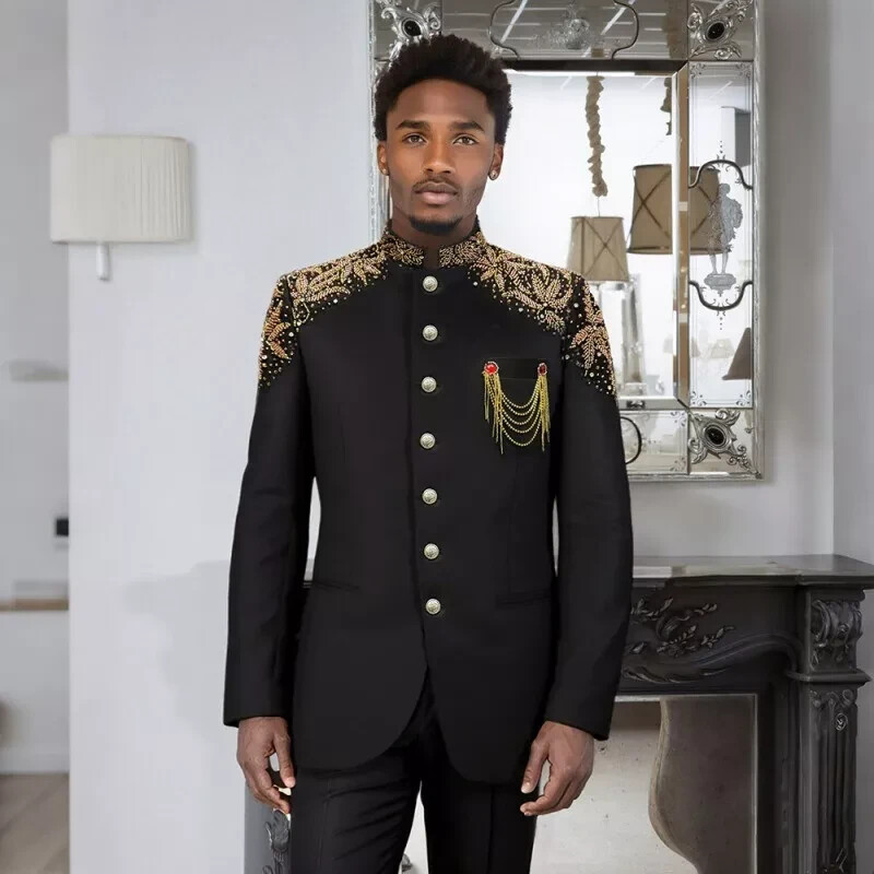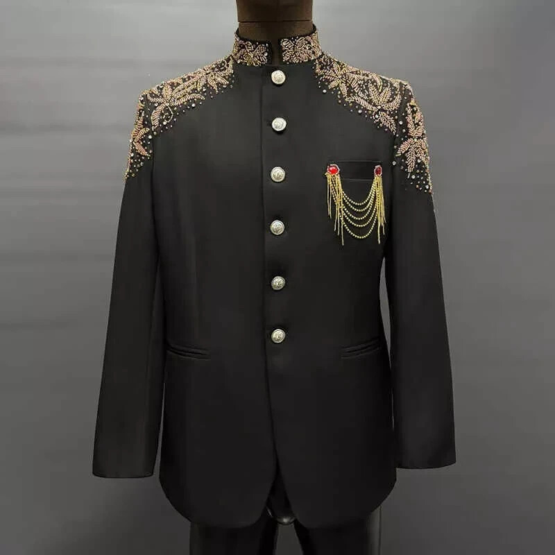Trendy High-Neck Diamond Men's Suit Jacket with Brooches Single Button Design