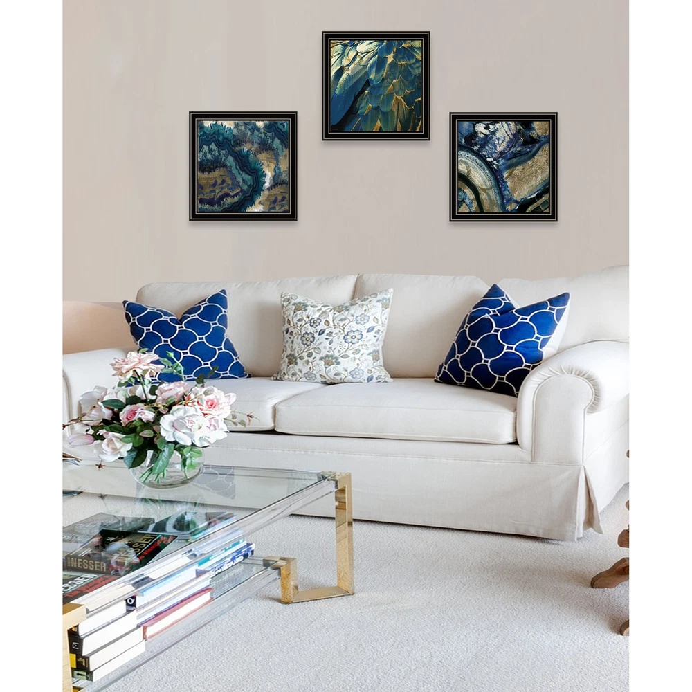 "Deep Blue" Vignette is by Artisan Sophie 6. This 3-14"X14" decorative black framed wall art. This image features a set of three beautiful abstract images that both have a variety of beautiful browns and blues Geode reef. Our products are proudly made by skilled American workers. The surface of our framed art is textured with a fade resistant coating, so no glass is necessary. A vegetable-based glue is used in the production of our products, and our frames are crafted from 100% recycled material. In keeping with our environmentally friendly approach towards manufacturing. Arrives ready to hang. Framed wall art, Decorative wall art, living room wall art Print has fade resistant surface texture, no glass is necessary Woman Owned Business (WBE) Arrives ready to hang, no additional Free Shipping Over $49.99* Details TrendyDecor4U "Deep Blue" Framed Print Wall Art by Sophie 6 - Coastal Product Description: "Deep Blue" Vignette is by Artisan Sophie 6. This 3-14"X14" decorative black framed wall art. This image features a set of three beautiful abstract images that both have a variety of beautiful browns and blues Geode reef. Our products are proudly made by skilled American workers. The surface of our framed art is textured with a fade resistant coating, so no glass is necessary. A vegetable-based glue is used in the production of our products, and our frames are crafted from 100% recycled material. In keeping with our environmentally friendly approach towards manufacturing. Arrives ready to hang. Framed wall art, Decorative wall art, living room wall art Print has fade resistant surface texture, no glass is necessary Woman Owned Business (WBE) Arrives ready to hang, no additional hardware needed on item individually hand crafted by skilled American workers Cleaning InstructionsClean with Soft Dry Cloth Only Made in U.S.A. Artwork by American Artist