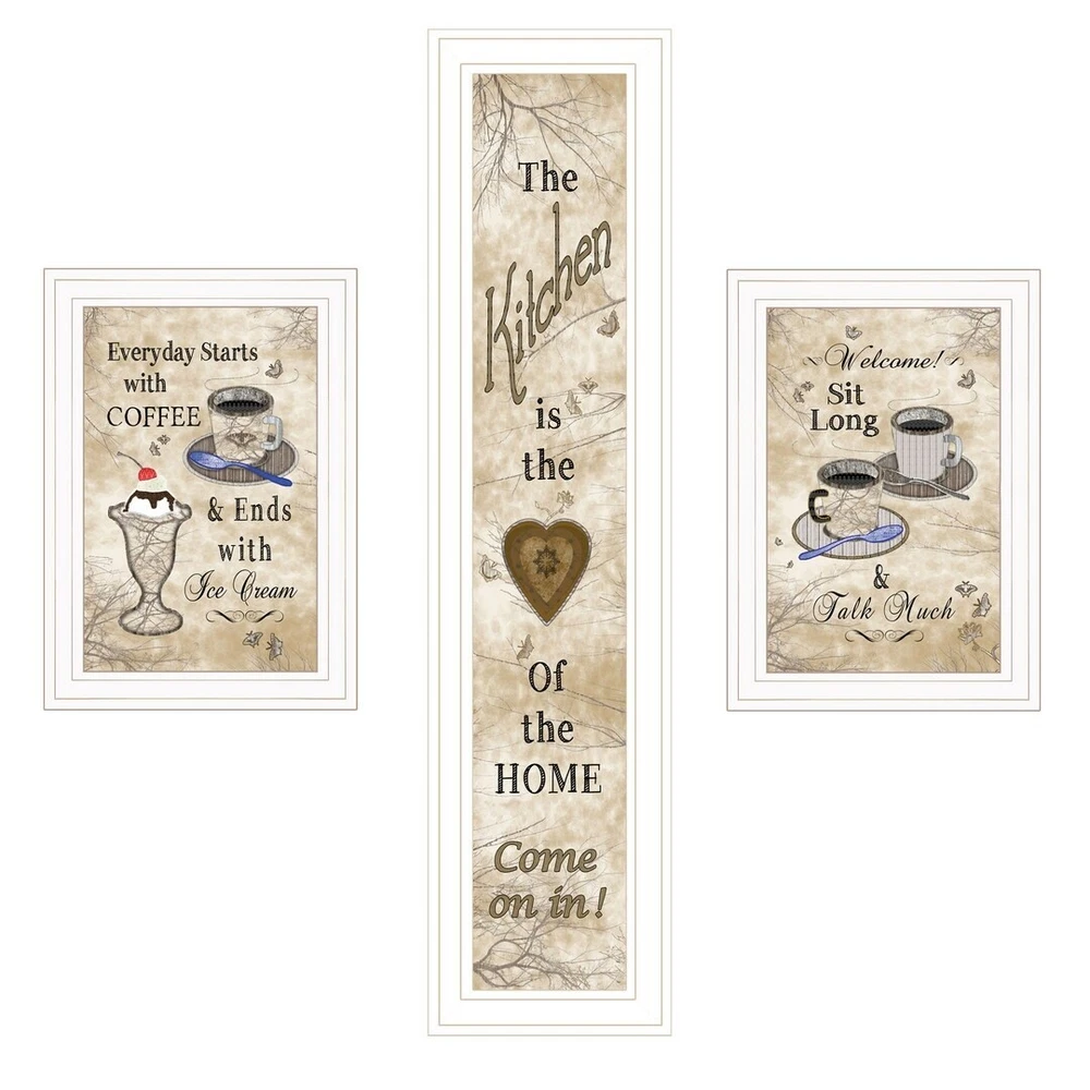 VME65LVC-226G "Love of Nature Kitchen" vignette by Trendy decor. This 3 piece horizonal white framed set(1- 33"x9" & 2-15x11")will decorate any kitchen; the horizonal framed print says "Kitchen is the Heart of the Home, Come on in!" light warm tan background with butterflies, flowers, and trees. The 2 smaller framed prints: Sit Long & Talk Much is(15x11) paired with another (15x11) framed print: "Everyday Starts with Coffee & Ends with Ice Cream" again in the light tan background. The surface of the print is textured with a fade resistant coating so no glass is necessary. Arrives ready to hang. Framed wall art, Decorative wall art, living room wall art Textured Artwork with a 'rolled on' acid free acrylic coating to create a canvas painting effect. No glass is necessary. Surface of the Free Shipping Over $49.99* Details TrendyDecor4U Farmhouse "Love of Nature Kitchen" 3-Piece Vignette - Earthtone Product Description: VME65LVC-226G "Love of Nature Kitchen" vignette by Trendy decor. This 3 piece horizonal white framed set(1- 33"x9" & 2-15x11")will decorate any kitchen; the horizonal framed print says "Kitchen is the Heart of the Home, Come on in!" light warm tan background with butterflies, flowers, and trees. The 2 smaller framed printsSit Long & Talk Much is(15x11) paired with another (15x11) framed print"Everyday Starts with Coffee & Ends with Ice Cream" again in the light tan background. The surface of the print is textured with a fade resistant coating so no glass is necessary. Arrives ready to hang. Framed wall art, Decorative wall art, living room wall art Textured Artwork with a 'rolled on' acid free acrylic coating to create a canvas painting effect. No glass is necessary. Surface of the print has a fade resistant coating. Arrives Ready to Hang Woman Owned Business (WBE) Decorative Moulding adds natural beauty to the framed art.
