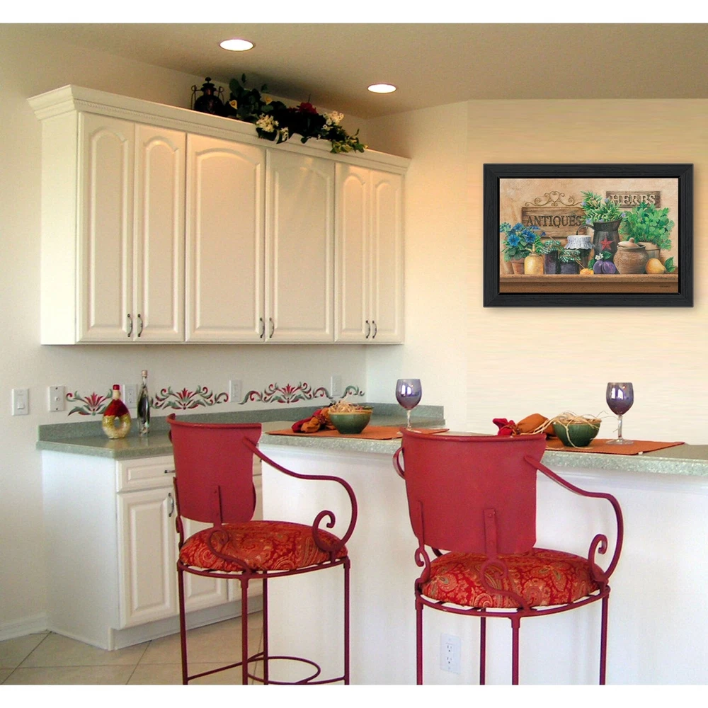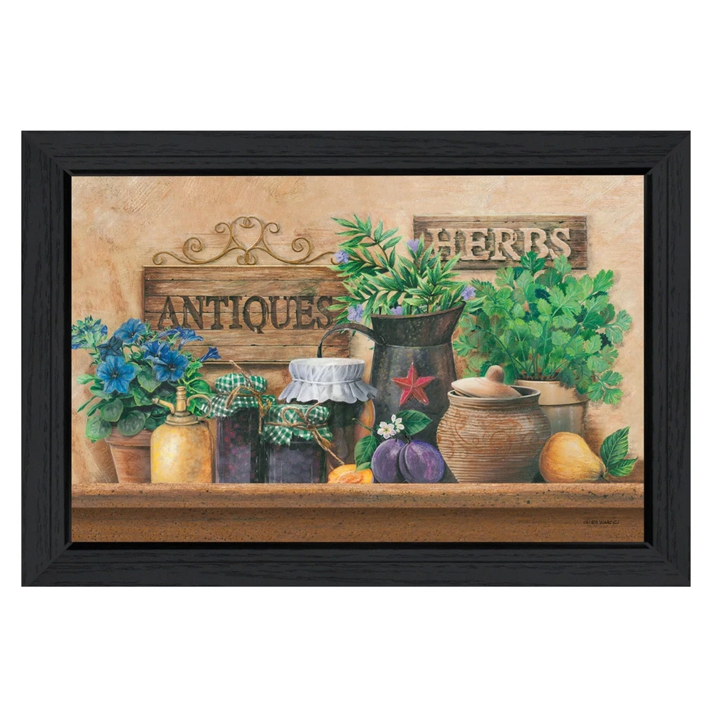 "Antiques and Herbs" is a 33"x19" black framed art print by Ed Wargo. This artwork features a tabletop with herbs, fruit, jars and crocks with two signs reading antiques and herbs. This totally American Made wall decor item features an decorative black frame. The framed art print has a protective, archival finish (glass is not needed) and arrives ready to hang. Decorative wall art, framed wall art, framed print Women Owned (WBE) Textured Artwork with a 'rolled on' acid free acrylic coating to create a canvas painting effect. No glass is necessary. UV protectant coating protects artwork from fading. Arrives Ready to Hang Free Shipping Over $49.99* Details TrendyDecor4U Traditional "Antiques and Herbs" Framed Print Wall Art by Ed Wargo Product Description: "Antiques and Herbs" is a 33"x19" black framed art print by Ed Wargo. This artwork features a tabletop with herbs, fruit, jars and crocks with two signs reading antiques and herbs. This totally American Made wall decor item features an decorative black frame. The framed art print has a protective, archival finish (glass is not needed) and arrives ready to hang. Decorative wall art, framed wall art, framed print Women Owned (WBE) Textured Artwork with a 'rolled on' acid free acrylic coating to create a canvas painting effect. No glass is necessary. UV protectant coating protects artwork from fading. Arrives Ready to Hang