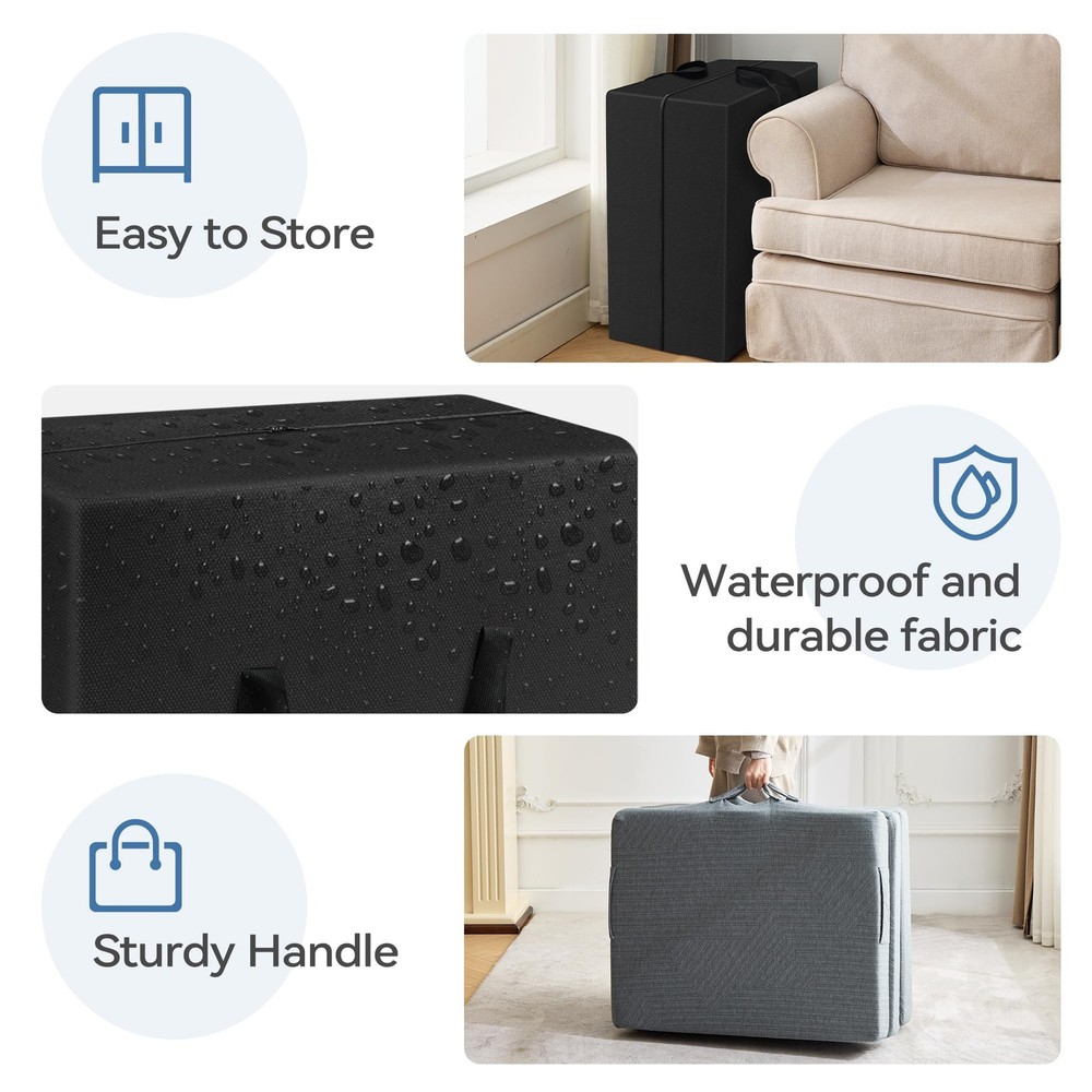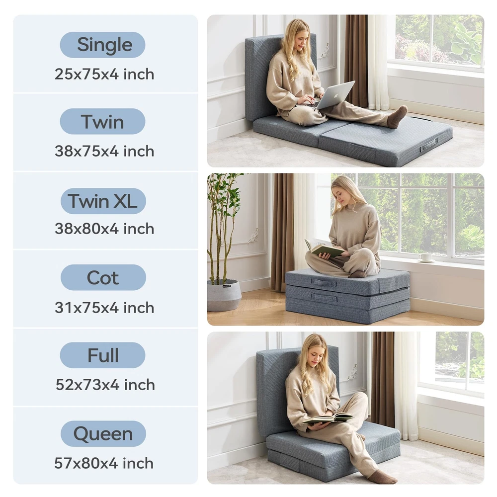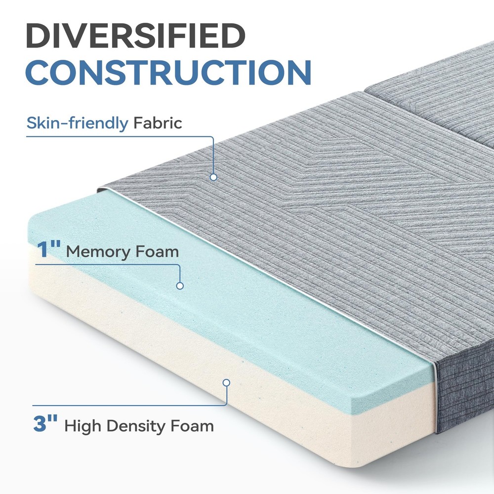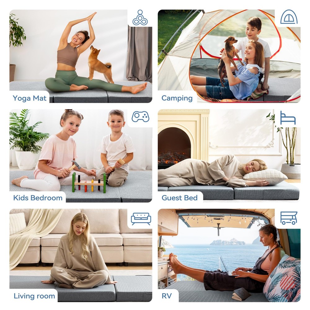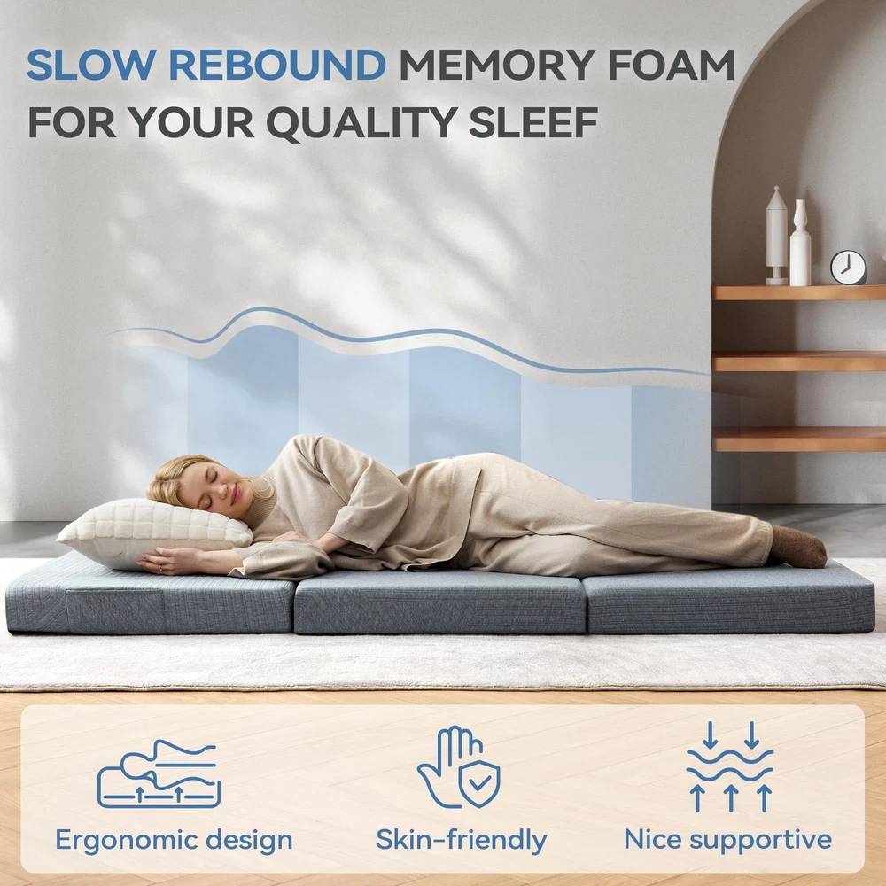 Tri-Fold Memory Foam Mattress combines a 1" cooling gel layer with 3" supportive foam to regulate temperature and prevent sinking. Its space-saving tri-fold design unfolds in seconds for travel, camping, RV, or guest use. Machine-washable cover ensures hygiene, while 4 flexible folds adapt to beds, sofas, or yoga mats. CertiPUR-US certified for safety and durability. Why It Stands Out: Cooling comfort + portability + multi-scene adaptability 【Advanced Cooling Gel Layer】 Crafted with 1" infused cold gel memory foam, this mattress adapts to body temperature to prevent overheating, while 3" high-density support foam ensures firmness and isolates moisture from the ground, delivering a cool, dry, and cloud-like sleep experience. 【Space-Saving Tri-Fold Design】 Perfect for tight spaces, the lightweight mattress folds into thirds for effortless portability. Ideal for travel, camping, RV trips, or as an instant guest bed—unfold it in seconds to create a full-size sleeping surface anywhere. 【4-in-1 Multi-Use Flexibility】 Transform the mattress into a sofa, floor cushion, yoga mat, or bed by adjusting its fold. The versatile design adapts to living rooms, tents, dorm rooms, or even car napping, maximizing functionality in any scenario. 【Removable & Machine-Washable Cover】 Featuring a hidden zipper and breathable fabric, the anti-slip cover wicks away sweat and resists odors. Easily remove it for quick cleaning, ensuring long-lasting freshness and hygiene. 【CertiPUR-US Certified Safety】 Made without harmful chemicals, the eco-friendly foam prioritizes health and durability. Its compact foldable design stores vertically in closets or under beds, saving 80% space compared to traditional mattresses.