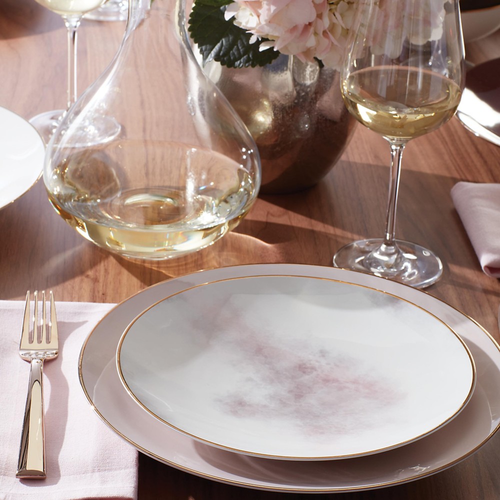 Accented with microwave-safe gold trim, the Trianna Blush Dinner Plate boasts a blush pink hue. This fashion-forward piece is made from dishwasher-safe, durable ceramic porcelain in a coupe shape. Width: 11.12" Material: Porcelain Dishwasher Safe Microwave Safe Gold *(See Detail Below) Chip Resistant Imported