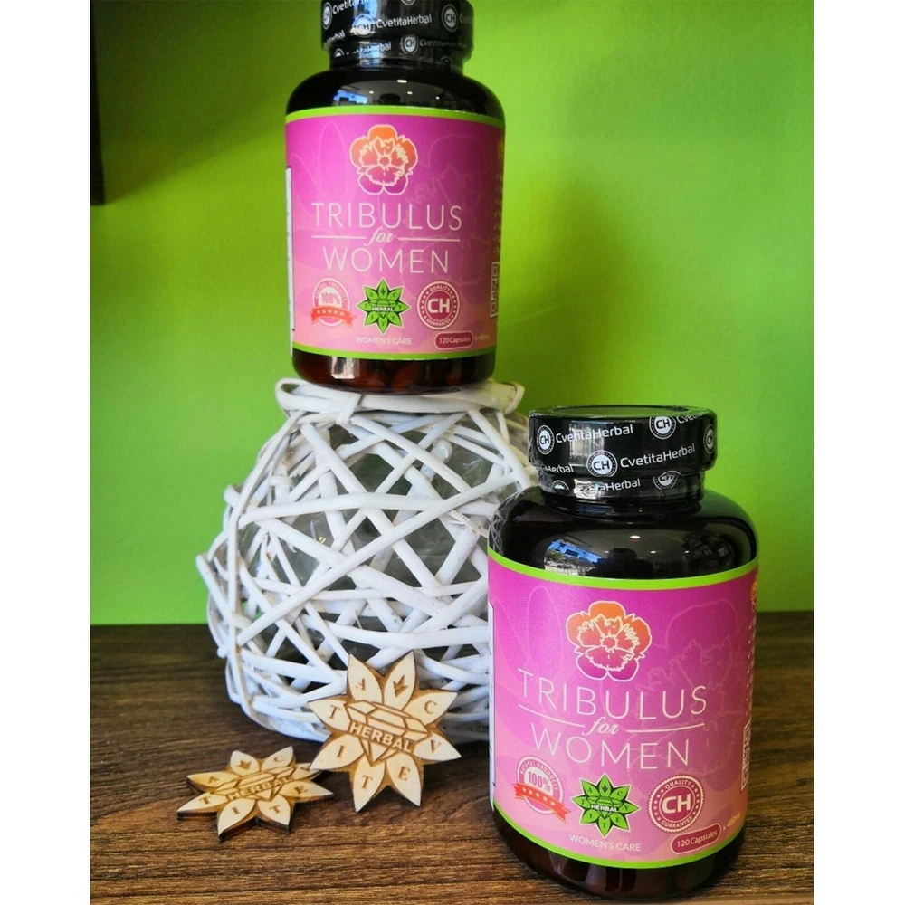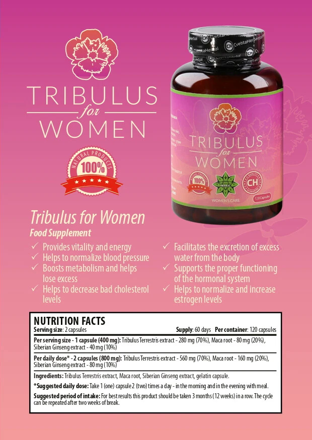 Tribulus for Women 120 capsules • • • FOOD SUPPLEMENT • • • Benefits of Tribulus for Women Helps the proper functioning of the hormonal system Helps to normalize and increase estrogen levels Increases fertility Regulates metabolism Helps to lose excess weight Provides vitality and energy Normalizes blood pressure Intake of Tribulus for Women Nutrition Facts Serving size: 2 capsules Per container : 120 capsules Supply: 60 days Suggested daily dose : Take 1 capsule Tribulus for Women in the morning after meal and take 1 capsule in the evening, no later than 2 hours before bedtime. Suggested intake period : For best results this product should be taken 3 months (12 weeks) in a row. The cycle can be repeated after two weeks of break. Ingredients : 100% Tribulus Terrestris extract (70%), Maca root (Lepidium meyenii) (20%), Siberian Ginseng extract (Eleutherococcus senticosus) (10%), gelatin capsule. Storage : Store in a dry, cool and protected from a direct sunlight place. Keep out of reach of children! Payment Methods - PayPal Delivery methods: Economy services - 7-14 working days Expedited delivery by DHL express worldwide - 3-5 working days (it depends the customer`s location)