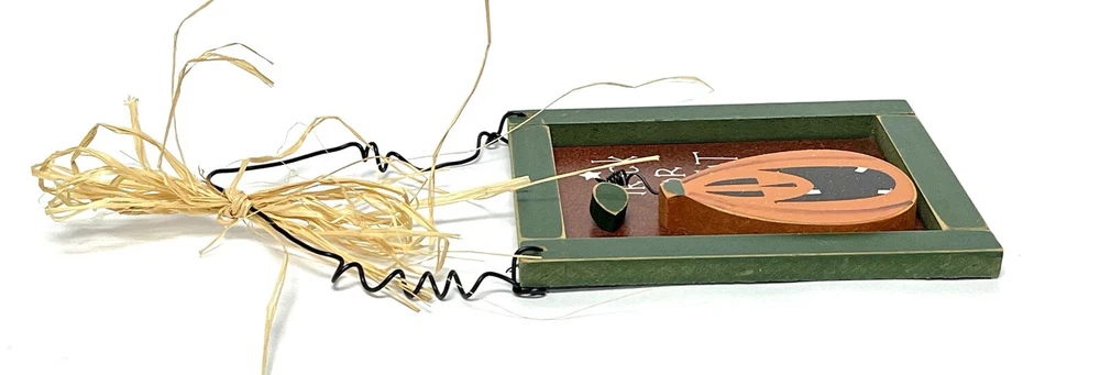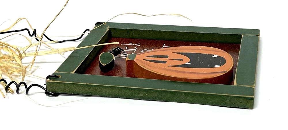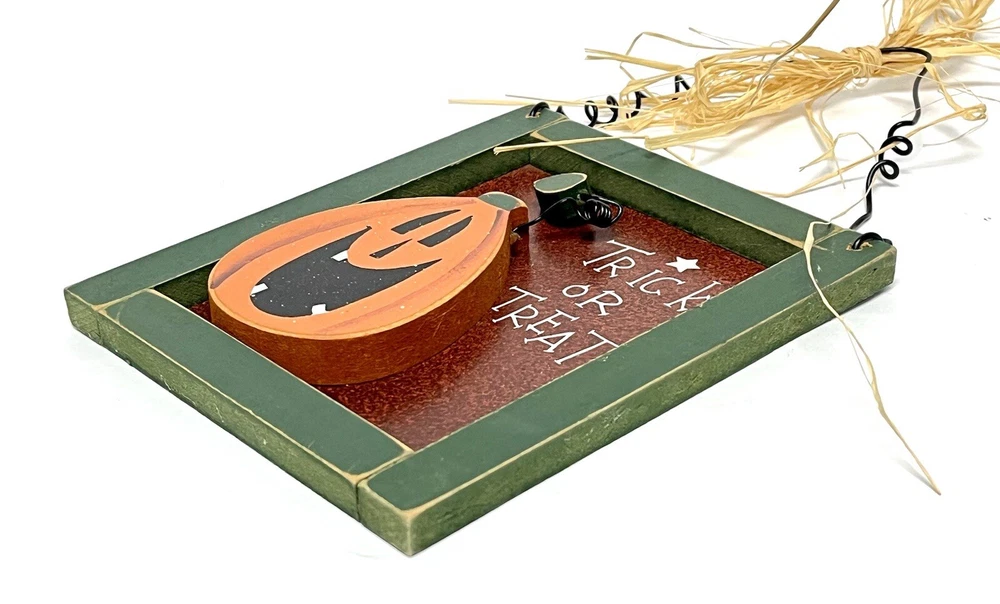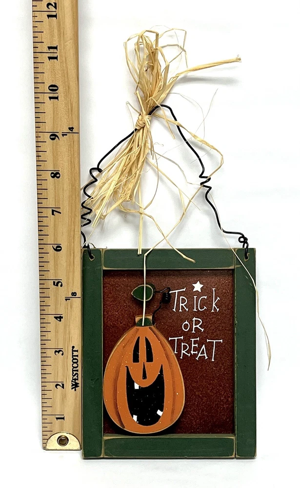 Add some spooky flair to your home decor this Halloween with this small, vertical sign featuring a jack o' lantern and the words "Trick Or Treat". Made of wood and tin, this decorative piece has a 3D effect and comes ready to hang with a straw ribbon. The sign has a bordered design and metal tin backing, making it a great addition to any room. Perfect for teens, adults, and kids alike, this Halloween-themed sign will add a touch of festive charm to your home. Use it to decorate your front door, living room, or any other space in need of a little Halloween spirit. Don't miss out on this unique and decorative piece! CONDITION Pre-owned Good condition See pictures for details Please contact us with any questions or concerns. Thanks!