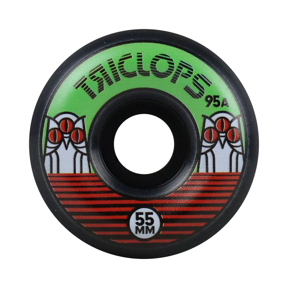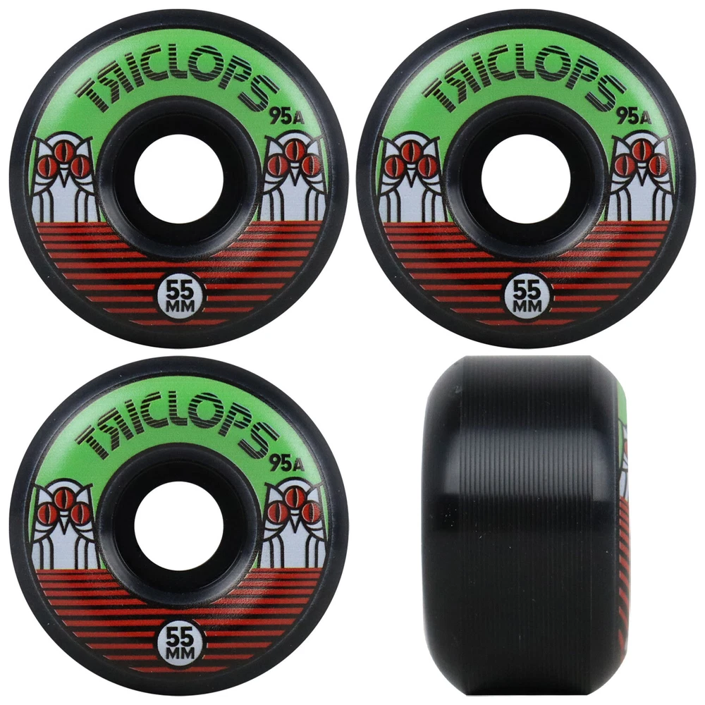Product Description Triclops Skateboard Wheels Night Riders 55mm 95A with Bones Reds Bearings This package includes 1 set of wheels (4wheels) and 8 bearings. Solid 55mm wheel from Triclops. All purpose wheels for streets, ramps, and parks. Custome formula black urethane - just a little softer for a super smooth ride. Bones REDS are manufactured to Bones Skate Rated specifications in a manufacturing facility dedicated to producing the highest quality skate bearings. They are inspected twice before being shipped to skaters and offer the greatest combination of performance, durability and low cost in the industry. Because they offer near Bones Swiss performance at a fraction of the cost, they have become the best selling bearings. BRAND Triclops MODEL Night Riders SIZE 55mm COLOR Black CONDITION Brand New The feeling of a new set of wheels is second to none. Well, maybe it’s second to saving a bunch of money. Get the best wheels at the best price from TGM Skateboards. We have hundreds of wheels available, no matter what you are looking for. Traditional skate wheels, cruiser wheels, longboard wheels…we’ve got them all at the absolute best prices available! Wheels are measured by Diameter (Width) and Durometer (Hardness). 50mm to 54mm with a hardness of 99A – 101A is the most common size wheel for street and park skaters, while 55mm to 64mm is typical for bowl and old school skaters. The larger the wheel, the longer the roll. The softer the wheel, the smoother the roll. Softer wheels are great for rough terrain and are also quieter (which is why filmers prefer large, soft wheels). Ultimately, it comes down to personal preference and the type of terrain the skateboard will be ridden on. 17 years being eBay's premier skateboard retailer with 350,000 positive feedback! With over 20,000 items in stock, we are experts on all aspects of skateboarding, longboarding, customer services, shipping speed and bang for your buck. Copyright ©2018 TGM Skateboards | All Rights Reserved