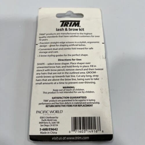 Trim Personal Care Lash & Brow Kit Mini Tweezer Salon Boards Nail File ~Proudly Sold and Shipped From the United States~ Description Trim Personal Care Lash & Brow Kit Mini Tweezer Salon Boards Nail File. Features Specifications SKU: 221207-007 Condition: New Condition Note: Height Width Depth Weight Shipping Package Length: 8.0 inches Package Width: 4.0 inches Package Height: 1.0 inches Package Weight: 0.125 pounds Item shipped from Utah (84043). Domestic packages under 1 lbs shipped via USPS Ground Advantage rate unless otherwise purchased by the buyer. Domestic packages 1 lbs or over normally shipped via USPS Priority rate unless otherwise purchased by the buyer. International packages are shipped eBay International Shipping only. We DO NOT charge any handling rates or other costs other than actual shipping charges.