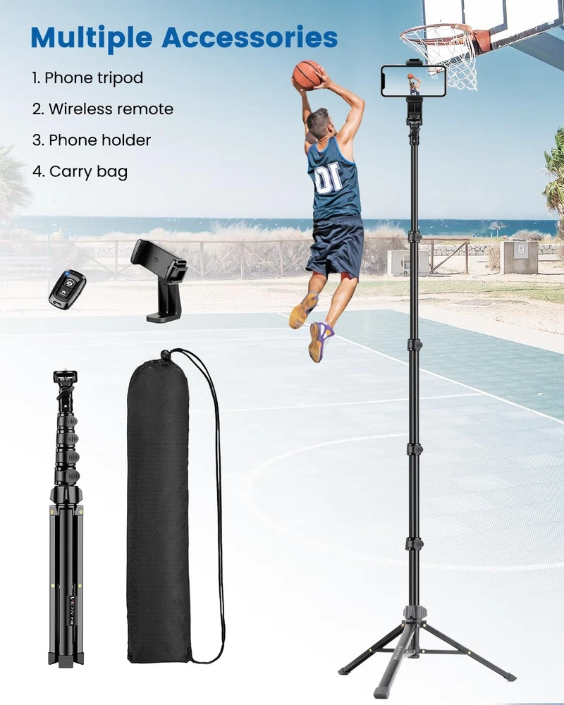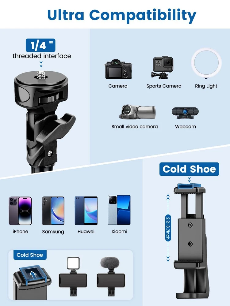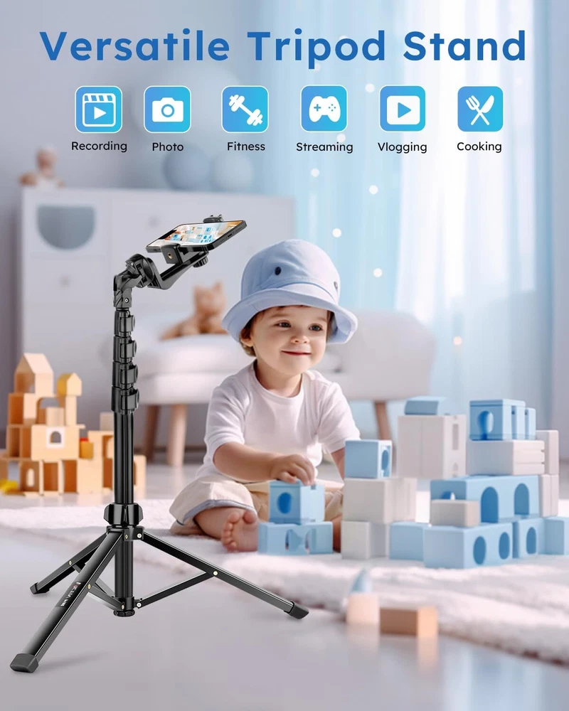 tripod Stable and Sturdy : P18E tripod has outstanding stability. Wider aluminum tripod legs, reinforced tripod base support system, and non-slip feet with larger cross section. It solves the problem of lack of stability of other cell tripods, ensuring a stable and safe shooting experience 72" Tall Tripod : This tripod stand is height adjustable. Stowed at just 19.3 inches, it comes with a carrying case for easy storage and portability. Quick-release plate clips allow for quick extension. The tripod reaches a maximum height of 72 in. It offers more shooting height for perfect shoots 1/4" Head and Versatile Holder : This Cell tripod with a 180-degree rotation head and 360-degree rotation universal cell clip (Adjust the angle without removing the ). NOTE : The cold shoe opening of the clip allows for an additional fill light or microphone Wide Compatibility : The adjustable cell clip (2.2"-3.7") is with most cell phones and provides versatility and . Also, this cell tripod can be used with other devices that have a 1/4 connector (digital cameras, sports cameras, ring lights, etc tripod with remote : Handy Remote Control: Our wireless remote is with most iOS and Android smartphones, with a range of up to 10m/33ft. It is perfect for capturing family photos, selfies, vlogging, and live streaming with ease What You Will Get : This package includes : 1X iphone Tripod, 1X Universal Cold Shoe Holder, 1X Wireless Remote, 1X Carrying Bag