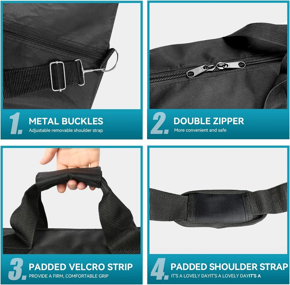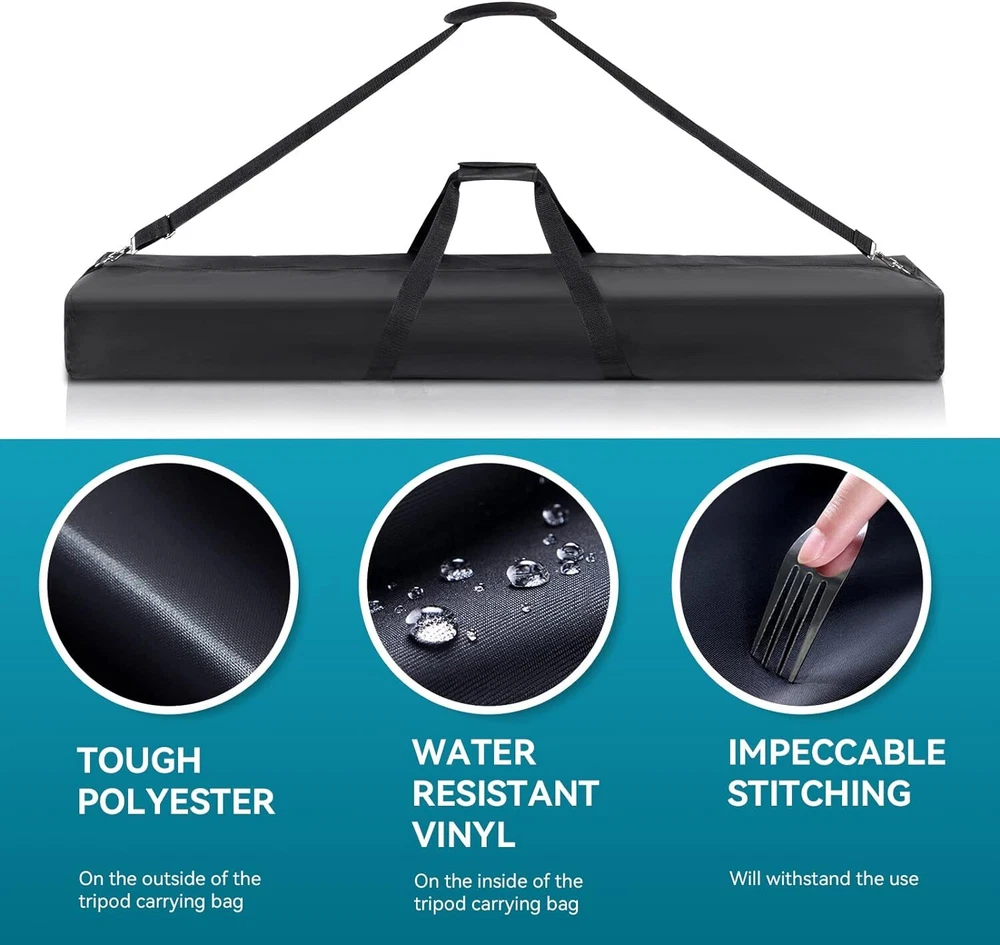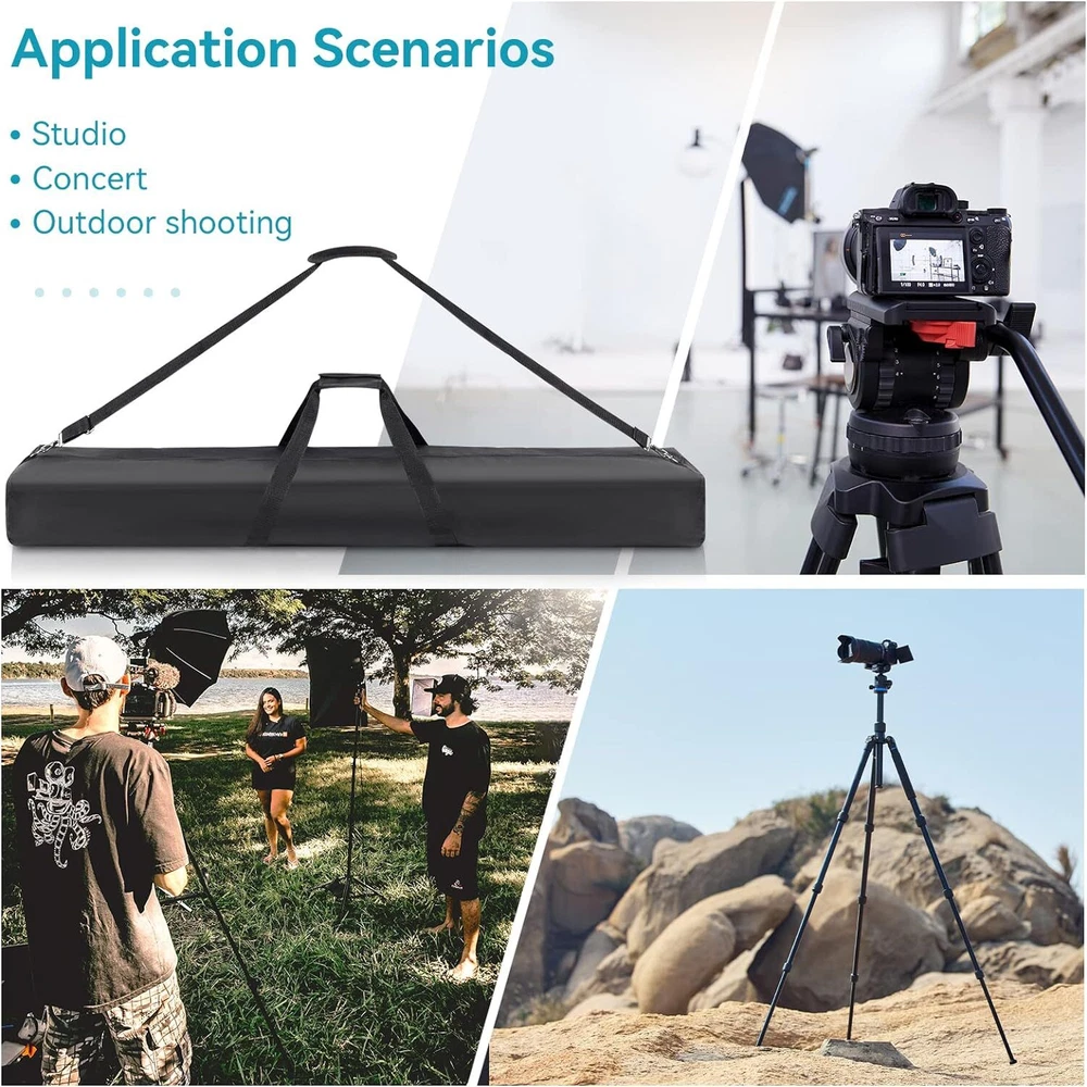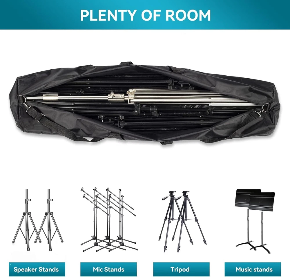 Tripod Carrying Bag, 48" Long Carry Case for Speaker Stands, Light/Lighting Stand, Mic/Microphone Poles - with Adjustable Shoulder Strap, Heavy Duty Handle and Double Zipper Item Description [Plenty of Room] Carrying case measures 4.75" H x 10" W x 48" L in size, roomy interior can accommodate 6 microphone stands or 2 speaker stands at a time. Besides, this tripod bag can also be used to hold light stands, detachable C stands, camping tent poles, beach accessories, guitar stands, music stands, etc [Quality Material] There are tough polyester on the outside and water resistant vinyl on the inside of the tripod carrying bag. Impeccable stitching will withstand the use and abuse it goes through from being transported with heavy objects in it [Comfortable to Carry] The bag have a double zipper down the middle on top and 2 handles that can be joined together with a padded Velcro strip. The padded handles provide a firm, comfortable grip, so it isn't uncomfortable to carry [3 Ways to Carry] There is an adjustable removable shoulder strap with metal buckles in the carry bag. The shoulder strap can be adjusted between 29.5" and 52". So the bag has 3 carrying ways: handheld, shoulder carrying or sloping shoulder carrying [Great Tool for Shipping] It can help you compact the stands into one case with less awkwardness and more maneuverability and convenience. You can carry multiple speaker stands or mic stands in one hand as you haul it to the venue. The stand bag can fold up into a small flat package when you're not using it to transport stands [Service Quality] We are committed to providing a fast, accurate and friendly service, so please feel free to contact us if you have any questions › See more product details for Speaker Stands, Light/Lighting Stand, Mic/Microphone Poles There is an adjustable removable shoulder strap in the carry bag. The shoulder strap can be adjusted between 29.5" and 52". The padded handles provide a firm, comfortable grip, so it isn't uncomfortable to carry. Payment We accept payment only through PAYPAL Shipping We ship products worldwide through standard express courier service, it will reach within 7 to 10 days to abroad buyers, we ship the product after recieved clear payment and give full information about shipment to the buyer Return We accept product return within 7 to 21 days from delivery date but product should be in original position and not in damaged condition,the return shipping charges will be buyer responsibility