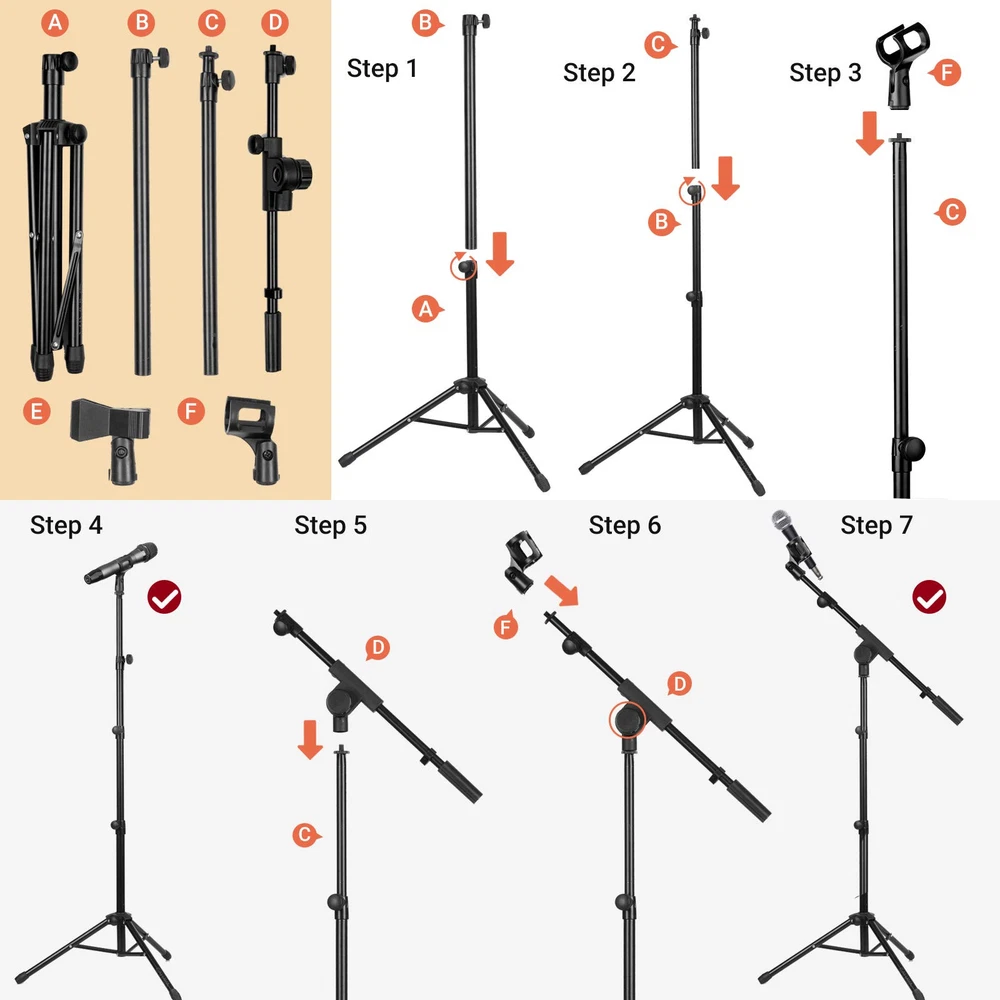 Stable Tripod Base: tripod boom microphone tripod legs extends further than others which can stand holds microphone securely in place. Non-slip foot cover prevent it from moving around. Carrying Bag & Universal Mic Clips: it comes with carrying bag and 2 mic clips: barrel style & clothespin style, fits for most types of microphones. Stand Height Adjustable: microphone stand height can be adjusted from 25.2”/64cm to 62.2”/158cm, perfect floor use mic stand for stage performance, speeches, meeting rooms, party, wedding, karaoke sing or live broadcasts etc. Extendable & Removable Boom Arm: boom arm extends freely within 16.9”-30.1” (43cm -76.5cm) and 360° angle rotatable through adjustment knobs which allows for easy positioning. Simply remove the boom arm and attach microphone clip to convert the mic stand into a traditional straight mic stand. Portable and Easy to Assemble: all parts could be stored in a provided carrying bag for convenient transport.
