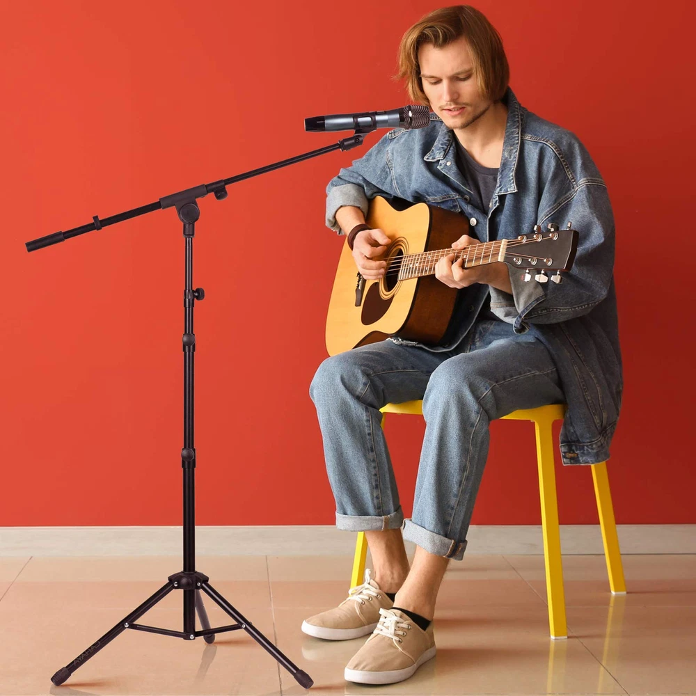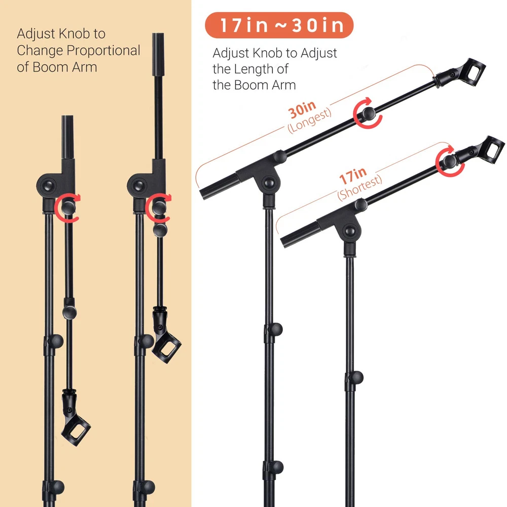 Stable Tripod Base: CAHAYA tripod boom microphone tripod legs extends further than others which can stand holds microphone securely in place. Non-slip foot cover prevent it from moving around. Carrying Bag & Universal Mic Clips: it comes with carrying bag and 2 mic clips: barrel style & clothespin style, fits for most types of microphones. Stand Height Adjustable: microphone stand height can be adjusted from 25.2”/64cm to 62.2”/158cm, perfect floor use mic stand for stage performance, speeches, meeting rooms, party, wedding, karaoke sing or live broadcasts etc. Extendable & Removable Boom Arm: boom arm extends freely within 16.9”-30.1” (43cm -76.5cm) and 360° angle rotatable through adjustment knobs which allows for easy positioning. Simply remove the boom arm and attach microphone clip to convert the mic stand into a traditional straight mic stand. Portable and Easy to Assemble: all parts could be stored in a provided carrying bag for convenient transport.