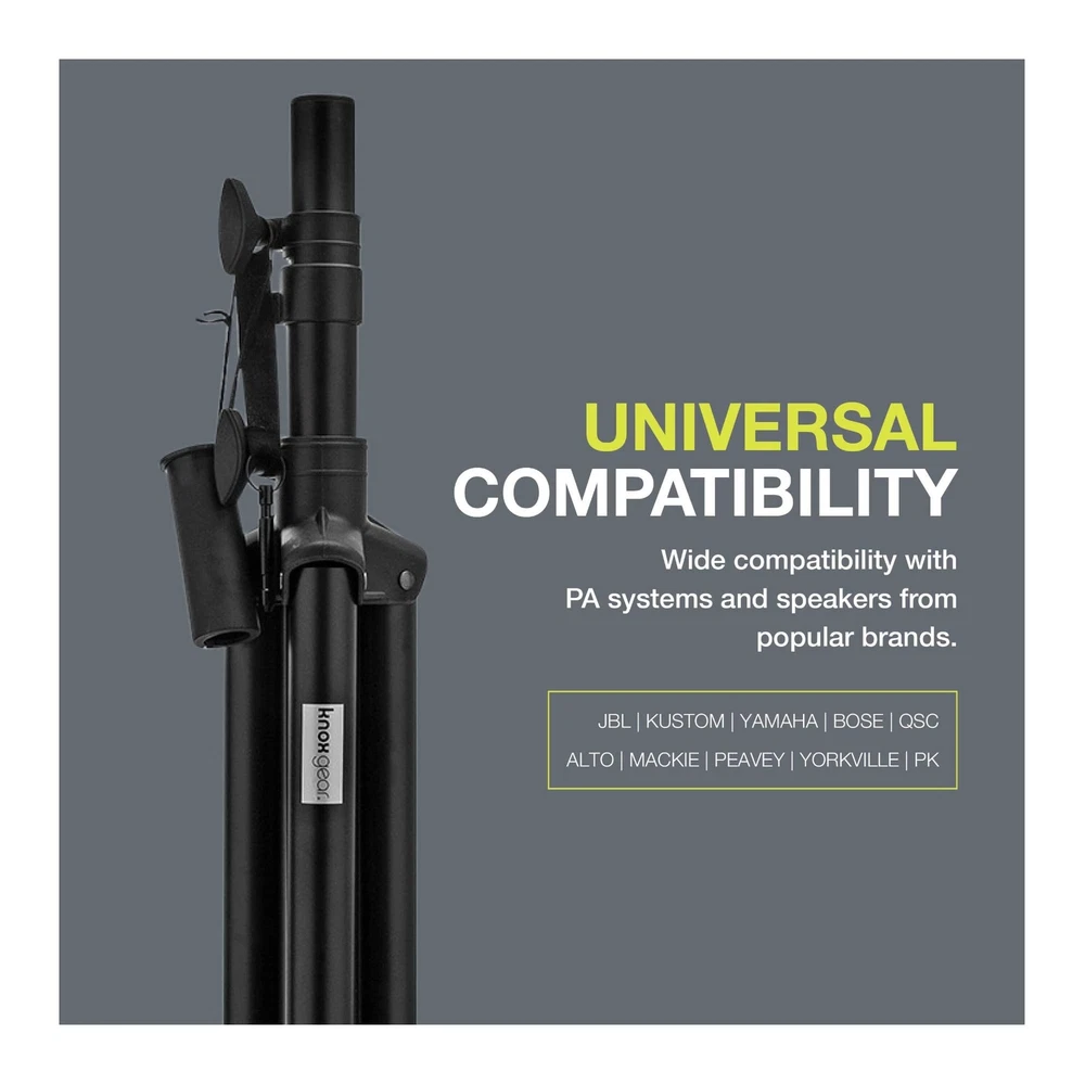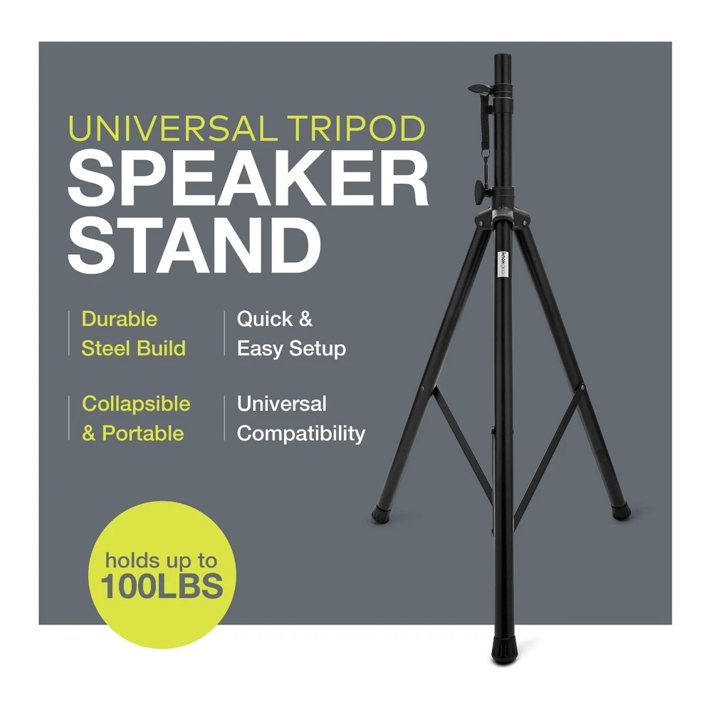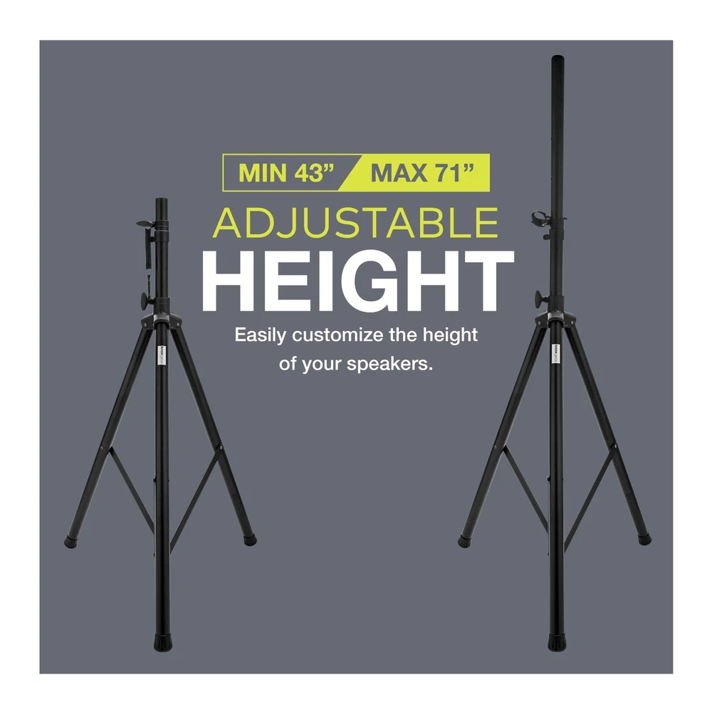 Get on the road and pump up the sound! With the Adjustable Height PA Speaker Stand from you can turn up the jams. This professional speaker stand features non-slip rubber feet. It works to keep speakers, loudspeakers, PA speakers or stage/studio monitors secure. It's adjustable and reaches over 6 feet tall so you can project quality sound clearly. Bring people together with the sound of clear music.Easy to Set Up and PortableTaking your show on the road is easy with professional sound equipment. Designed for travel, this stand is foldable and easily adjustable. You can carry and set up your speakers or monitor with ease. This stand is easy to set up. The knobs make it easy to move the pole up and down, and the locking pin helps keep it secure and in place so you can attach speakers. The tripod legs easily expand, and non-slip rubber feet provide stability. They have a locking pin for secure placement.Perfect for Sound and Audio PerformanceOur professional quality tools for sound systems make every performance an experience your audience will never forget. The Adjustable Tripod Speaker Stand is perfect for DJs, musicians, MCs, speakers and all other entertainers. Use it for parties, weddings, clubs, dances, and other large ceremonies and events. With this heavy-duty pole stand you can project loud sound in any venue ballroom or club.A Perfect PairingThe Tripod Speaker Stand is ideal for use with the KN-RPAS01 Rechargeable PA Sound System or the KN-PAS01 and KN-PAS02 Active Loudspeaker Combo Sets.-Year WarrantyChoose for better quality and more convenience. Every purchase is backed up with a 1-year so you are fully protected and always satisfied if anything goes wrong. Sturdy Stand For Your Speakers - Deliver quality sound throughout any room or venue with this steel tripod speaker stand from . The stand allows you to mount and raise the height of loudspeakers, PA speakers, or stage/studio monitors. Adjustable Height - With a high reach you can easily customize the height of your speakers to meet your needs. DJ speaker stand can be set up as low as 43” or as tall as 71” so you get the best position for your sound system. It can hold up to 100 lbs. Quick & Easy To Set Up - Set up your PA system for DJs, performances, or speeches in no time! 3 non-slip rubber feet are expandable and easy to lock in place using knobs and a locking pin. A universal floor-standing loudspeaker stand works with all speakers. Universal Compatibility - Wide compatibility with PA systems and speakers from brands like JBL, Kustom, Yamaha, Bose, QSC, Alto, Mackie, Peavey, Yorkville, PK, and Electro-Voice. Heavy duty and dependable for your expensive equipment. 1 Year - We want to ensure that you’re satisfied with our products. With our 1 year , we that it will work exactly as it should. This covers parts and labor so that you can enjoy using it worry-free!