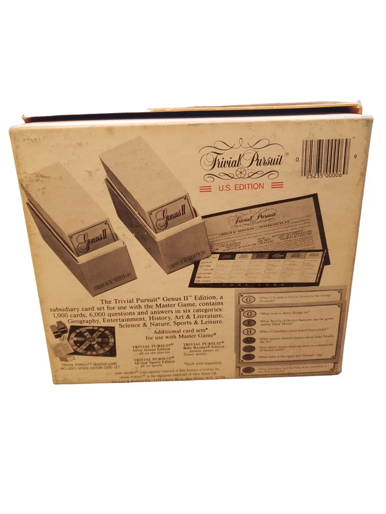 In the world of board games, Trivial Pursuit Genus II Edition stands as a beacon for trivia enthusiasts. This remarkable subsidiary card set, designed for use with the master game, brings a wealth of knowledge across various categories, challenging minds and sparking conversations. • Subsidiary card set • Requires master game • 6,000 questions • Six categories • U.S. Edition • For trivia enthusiasts Box has discoloration and slight wear on edges. Size: Unisex OS Box has some discoloration and slight wear on edges