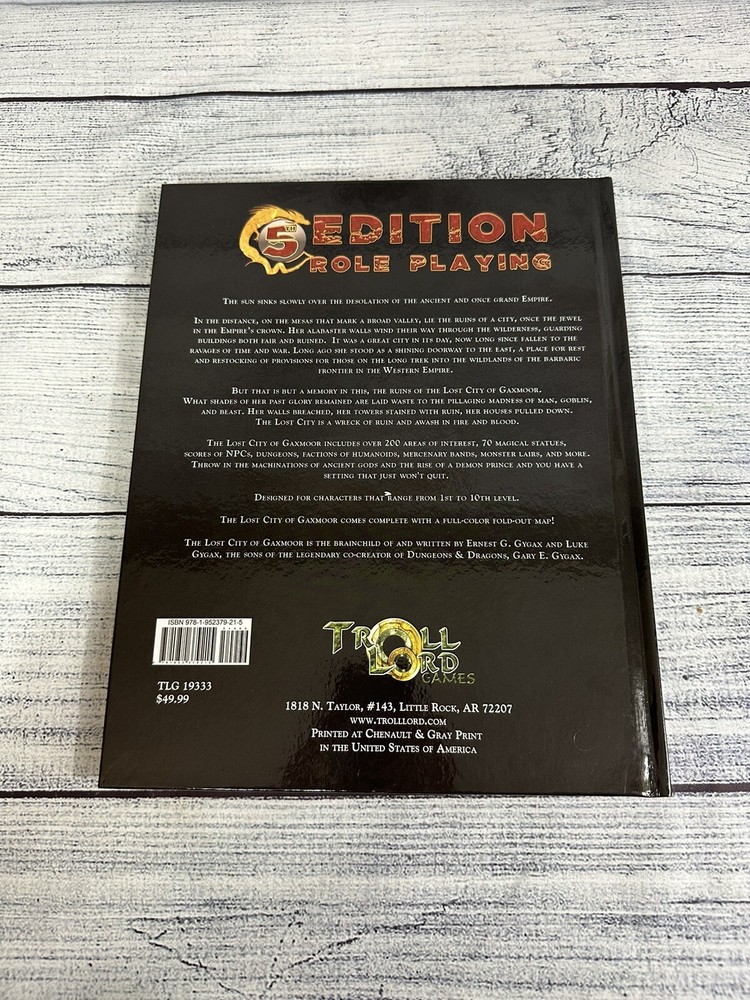 Clean Copy, Crisp Pages & Cover, Minimal signs of handling or shelving. No highlighting, marks or writing. Troll Lord Games The Lost City of Gaxmoor Luke Gygax 5th Edition 19333 RP.