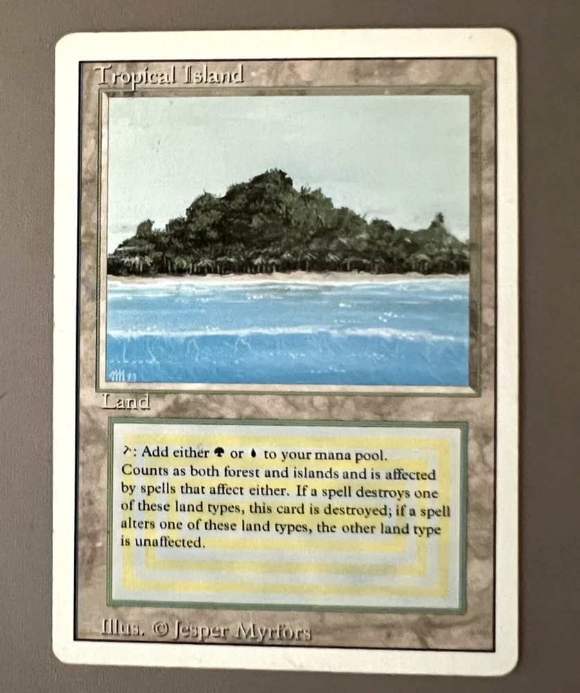 This ultra-rare Tropical Island card from the 1994 Magic: The Gathering Revised Edition set is a must-have for any serious collector or player. With its vibrant colors and intricate illustration by Jesper Myrfors, this dual land card is sure to add a touch of tropical paradise to your collection. The card is in excellent shape with minimal wear; check out the photos for a more detailed look. Don't miss your chance to add Tropical Island card to your collection!