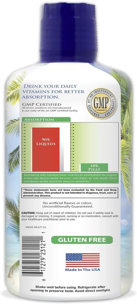 Premium Liquid Multivitamin for Men | Sugar Free Men’s Multi-Vitamin | 100+ Vitamins, Minerals & Amino Acids to Support Muscle, Heart, Brain Health & Energy | 98% Absorption Rate | Non-GMO | 32 Serv Brand Tropical Oasis Flavor Unflavored Primary Supplement Type Vitamin A, C, D3, E, B1, B2, B3, B6, B12, Folate, Biotin, Iron, PABA, Choline, CoQ10, Grape Seed Extract, Quercetin, Colloidal Minerals Vitamin A, C, D3, E, B1, B2, B3, B6, B12, Folate, Biotin, Iron, PABA, Choline, CoQ10, Grape Seed Extract, Quercetin, Colloidal Minerals Unit Count 32 Fl Oz Item Form Liquid Item Weight 32 Ounces Item dimensions L x W x H 3 x 3 x 8 inches Special Ingredients Vitamin A, C, D3, E, B1, B2, B3, B6, B12, Folate, Biotin, Iron, PABA, Choline, CoQ10, Grape Seed Extract, Quercetin, Colloidal Minerals Vitamin A, C, D3, E, B1, B2, B3, B6, B12, Folate, Biotin, Iron, PABA, Choline, CoQ10, Grape Seed Extract, Quercetin, Colloidal Minerals Diet Type Gluten Free Product Benefits Anti-Aging About this item ✅ Tropical Oasis New Men's Mega Liquid Multivitamin is specially formulated for Men with premium vitamins, minerals, herbs, amino acids, and nutrients that will keep you feeling young and living an active lifestyle ✅ Additional 1000mg herbal blend of Nettle Root, Ashwagandha Root and Saw Palmetto for optimal prosate health ✅ CoQ10 is a vital nutrient manufactured by your body that helps cells produce energy. As we age, our body loses its stores of CoQ10, particularly in the heart. Taking CoQ10 helps maintain your healthy CoQ10 levels and is also recommended for those suffering from high blood pressure ✅ Contains Double the Daily Recommended Value of Vitamin D for men! ✅ Liquid Vitamins are absorbed up to 98% by the body compared to 3-18% for pills/capsules - No artificial colors or flavoring.