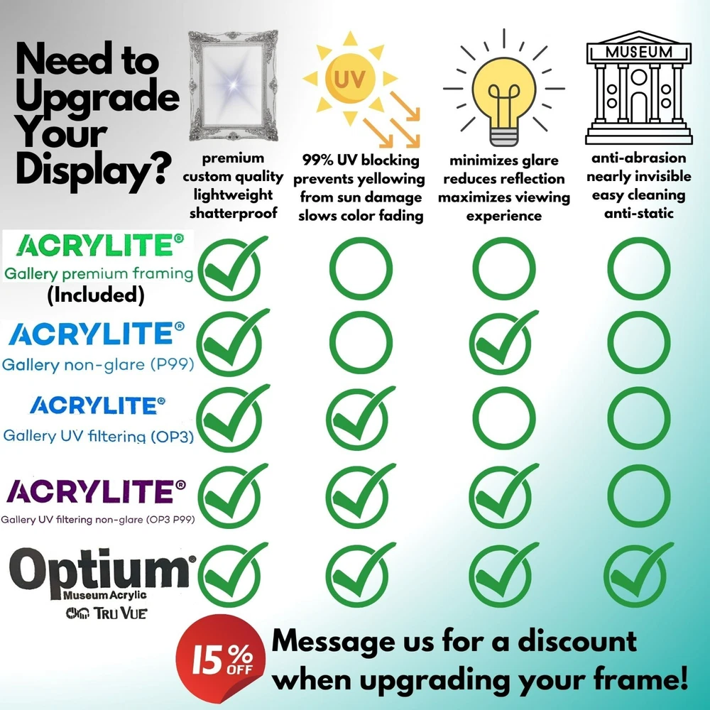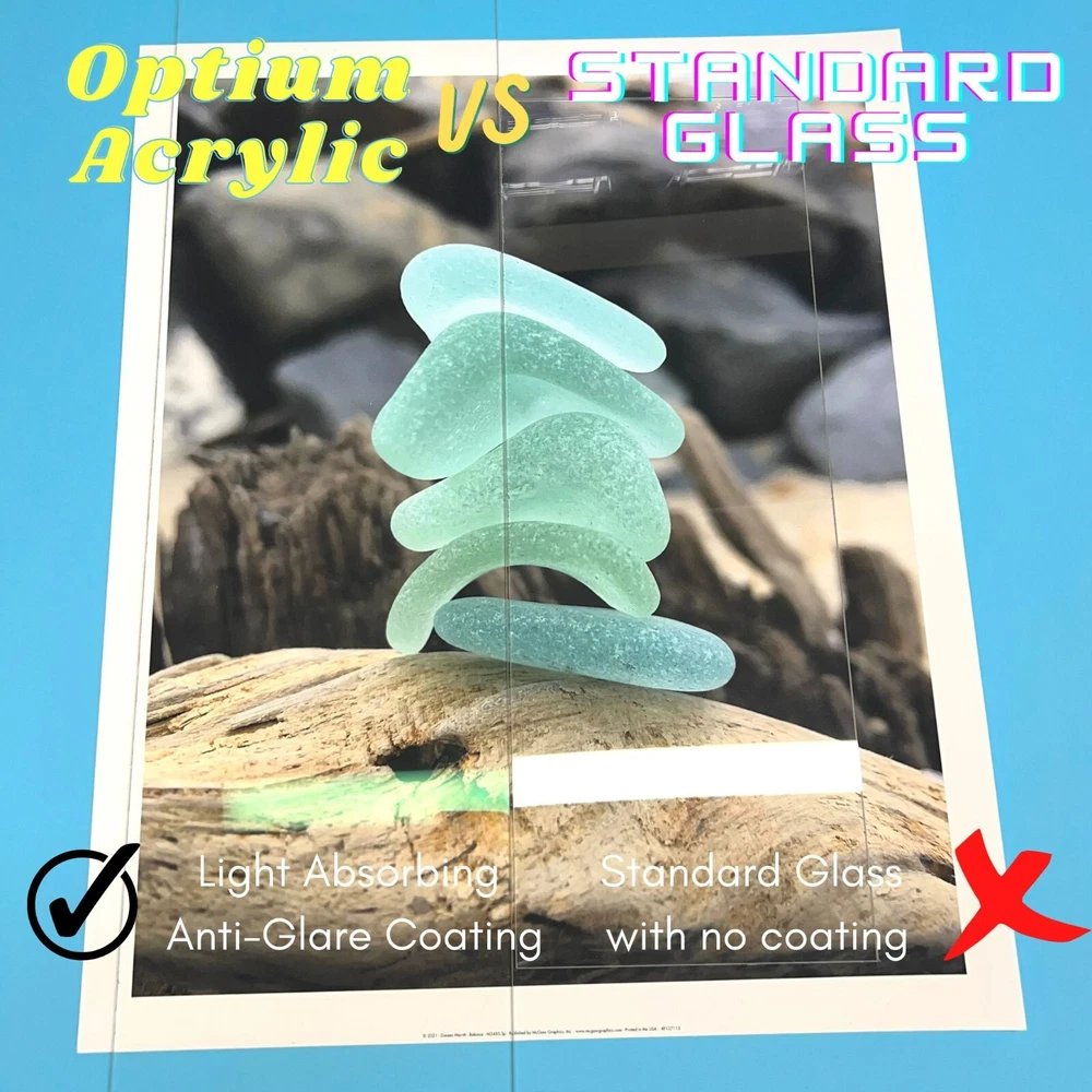 Tru Vue Optium Museum Acrylic virtually eliminates reflection and blocks up to 99% of UV rays. Optical light transmission brightens colors. Lightweight, durable, shatter resistant, and anti-static - ideal for shipping, large installations, and valuable works of art. Give your artwork the best chance in standing the test of time with the highest quality Acrylic on the market! **Note** Select this option if looking to upgrade your glass with your order with The Modern Wall Framing Co. Directions: 1. Determine the size of frame you are ordering 2. Select the same size glass in the drop down menu above. 3. If you have a custom frame size and you do not see it in the drop down menu, tell us the exact size of your frame and we will cut the glass to the correct size. Please let us know if you have any questions. We will respond quickly and get you the solutions you need!