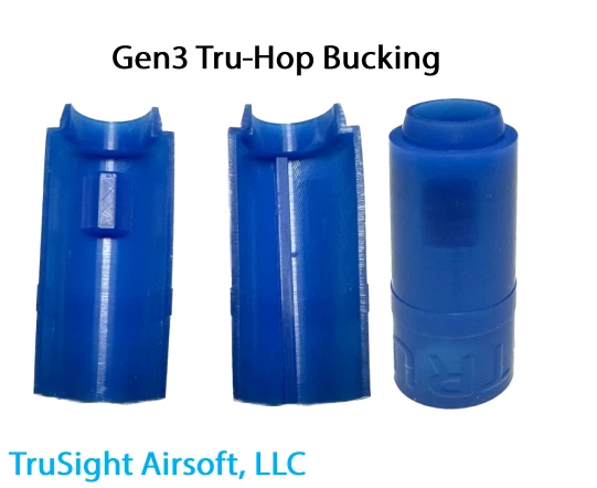 TruSight Airsoft Gen3 Tru-Hop Kit The Tru-HopTM is a high quality, high performance, all weather hop-up bucking designed to significantly boost range and accuracy in your AEG or AEG-compatible replica. This hop-up bucking is easily installed and requires zero† modification. Additionally, this bucking performs consistently in a broad temperature range (-50°C to 230°C/ -58°F to 446°F). You can expect the same range and accuracy regardless of playing in cold snow or in a hot desert. Lastly, the material used in this hop-up bucking has high durability and allows the Tru-HopTM to withstand hundreds of thousands of rounds.† Most inner barrels are compatible. Please refer to the “Compatibility” section below.Tru-HopTM contact patches have two main advantages:- Increased friction over the top of the BB, and- Muzzle energy retentionThis means you can over-hop virtually any weight BB without experiencing signification energy loss. The Tru-HopTM bucking does this by allowing the BB to pass more freely during firing since little hop-up pressure is required. The air loss at the nozzle-bucking interface is therefore reduced and more energy is retained during firing. This translates to farther range at your optimal flight path.Both generations were designed to boost the accuracy of your airsoft gun. Hours of trial-and-error testing ensures compatibility of the bucking with numerous BB brands. Other bucking features were thoroughly studied as well.Simply put, every aspect of Tru-HopTM was designed and tested to yield the maximum performance from your airsoft gun.Tru-Hop Concave SpacerTruSight Airsoft has also designed a companion hop-up spacer that replaces the stock rubber cylinder in a typical hop-up unit. Although this spacer is not required, the hop-up effect of the Tru-HopTM bucking will be maximized with full area contact. Like the bucking itself, this spacer was designed in-house and fine tuned through experimentation. The end result is a product that stands out as an individual contributor to performance. Installation Instructions Compatibility Due to the shape of the internal contact patch, there are some barrel requirements that must be met. This bucking was designed to be compatible across a large spectrum of barrel brands. However not all barrels will be compatible. To check for compatibility, please ensure that the barrel window meets the minimum dimensions shown below. Ideally the corners of the barrel window should be squared, however the TruSight Airsoft team has tested some rounded corner barrels with success. We recommend using a light film of silicone oil on the portion of the barrel shown above to aid in installation. Likewise, coating the Tru-HopTM bucking with a light film of silicone oil will make sliding the barrel and bucking assembly into the hop-up chamber easier. Tru-HopTM buckings have a 500 – 1000 round break-in period before maximum performance is achieved. TruSight Airsoft Gen3 Tru-Hop Kit The Tru-HopTM is a high quality, high performance, all weather hop-up bucking designed to significantly boost range and accuracy in your AEG or AEG-compatible replica. This hop-up bucking is easily installed and requires zero† modification. Additionally, this bucking performs consistently in a broad temperature range (-50°C to 230°C/ -58°F to 446°F). You can expect the same range and accuracy regardless of playing in cold snow or in a hot desert. Lastly, the material uséd in this hop-up bucking has high durability and allows the Tru-HopTM to withstand hundreds of thousands of rounds. † Most inner barrels are compatible. Please refer to the “Compatibility” section below. Tru-HopTM contact patches have two main advantages: - Increased friction over the top of the BB, and - Muzzle energy retention This means you can over-hop virtually any weight BB without experiencing signification energy loss. The Tru-HopTM bucking does this by allowing the BB to pass more freely during firing since little hop-up pressure is required. The air loss at the nozzle-bucking interface is therefore reduced and more energy is retained during firing. This translates to farther range at your optimal flight path. Both generations were designed to boost the accuracy of your airsoft gun. Hours of trial-and-error testing ensures compatibility of the bucking with numerous BB brands. Other bucking features were thoroughly studied as well. Simply put, every aspect of Tru-HopTM was designed and tested to yield the maximum performance from your airsoft gun. Tru-Hop Concave Spacer TruSight Airsoft has also designed a companion hop-up spacer that replaces the stock rubber cylinder in a typical hop-up unit. Although this spacer is not required, the hop-up effect of the Tru-HopTM bucking will be maximized with full area contact. Like the bucking itself, this spacer was designed in-house and fine tuned through experimentation. The end result is a product that stands out as an individual contributor to performance. Installation Instructions Compatibility Due to the shape of the internal contact patch, there are some barrel requirements that must be met. This bucking was designed to be compatible across a large spectrum of barrel brands. However not all barrels will be compatible. To check for compatibility, please ensure that the barrel window meets the minimum dimensions shown below. Ideally the corners of the barrel window should be squared, however the TruSight Airsoft team has tested some rounded corner barrels with success. We recommend using a light film of silicone oil on the portion of the barrel shown above to aid in installation. Likewise, coating the Tru-Hop TM bucking with a light film of silicone oil will make sliding the barrel and bucking assembly into the hop-up chamber easier. Tru-Hop TM buckings have a 500 – 1000 round break-in period before maximum performance is achieved. × × × × × Buy now and save! Shipping info Click the Shipping & Payments tab above the listing description