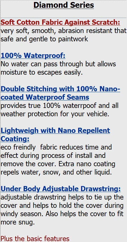 XTREMECOVERPRO PLATINUM SERIES WATERPROOF BREATHABLE CAR COVER XTREMECOVERPRO CAR COVER BASIC FEATURES 100% Breathable: Our cover is made by 100% breathable non-woven fabric that allows heat, moisture, dampness, and condensation to escape easily. Protection Against UV Rays: Completely blocks UV rays from sun that damages the vehicle's surface and interior. Protection Against all Dust Elements: Reduces and protects from natural pollutants, animal dropping, tree sap, industrial pollutants, airborne dust and dirt Smooth Fabric Against Scratch: Our fabric is very smooth, abrasion resistant that is safe and gentle to paintwork. Elastic Hems: Front and rear under body elastic hems. Under Body Clip Strap: Left to right under body strap helps to hold the cover during windy season. It made from same material of car cover that does not scratch paint. Fitment: XtremeCoverPro car cover has over 30 different sizes to ensure best fit to cars, SUVs, and pickup trucks ADDITIONAL FEATURES FOR DIFFERENT SERIES Pro Series Pro Plus Series Silver Series Black Fabric with Double Yellow Stitching: Beautiful black with yellow stitching car cover makes your car like in a show room vehicle Gray Fabric with Double Stitching: Gray color with same color double stitching seams provides an incredible strength and durability. Pro Series is not waterproof Plus the basic features Soft Cotton Fabric Against Scratch: Extra soft, smooth, abrasion resistant cotton lining that safe and gentle to paintwork Black Fabric with Double Yellow Stitching: Beautiful black with yellow stitching car cover makes your car like in a show room vehicle Gray Fabric with Double Stitching: Gray color with same color double stitching seams provides an incredible strength and durability. Pro Plus Series is not waterproof Plus the basic features 100% Waterproof: No water can pass through but allows moisture to escape easily. Double Stitching with 100% Leak-proof Heat Welded Seal Strong double sitiching with leak-proof heat welded seal provides true 100% waterproof and all weather protection for your vehicle. Under Body Adjustable Drawstring: adjustable drawstring helps to tie up the cover and helps to hold the cover during windy season. Also helps the cover to fit more snug. Silver Series is made by PVC vinyl. It is heavier material. Plus the basic features Gold Series Platinum Series Diamond Series 100% Waterproof: No water can pass through but allows moisture to escape easily. 100% Leak-proof Ultrasonic Heat Welded Seams provides true 100% waterproof and all weather protection for your vehicle. Lightweight: eco friendly non-woven fabric reduces time and effect during process of install and remove the cover. Under Body Adjustable Drawstring: adjustable drawstring helps to tie up the cover and helps to hold the cover during windy season. Also helps the cover to fit more snug. Plus the basic features Soft Cotton Fabric Against Scratch: very soft, smooth, abrasion resistant that safe and gentle to paintwork 100% Waterproof: No water can pass through but allows moisture to escape easily. 100% Leak-proof Ultrasonic Heat Welded Seams provides true 100% waterproof and all weather protection for your vehicle. Lightweight: eco friendly non-woven fabric reduces time and effect during process of install and remove the cover. Under Body Adjustable Drawstring: adjustable drawstring helps to tie up the cover and helps to hold the cover during windy season. Also helps the cover to fit more snug. Plus the basic features Soft Cotton Fabric Against Scratch: very soft, smooth, abrasion resistant that safe and gentle to paintwork 100% Waterproof: No water can pass through but allows moisture to escape easily. Double Stitching with 100% Nano-coated Waterproof Seams provides true 100% waterrpoof and all weather protection for your vehicle. Lightweight with Nano Repellent Coating: eco friendly fabric reduces time and effect during process of install and remove the cover. Extra nano coating repels water, snow, and other liquid. Under Body Adjustable Drawstring: adjustable drawstring helps to tie up the cover and helps to hold the cover during windy season. Also helps the cover to fit more snug. Plus the basic features PAYMENT INFORMATION We Accept the Following Payment: - PayPal - Credit Card About PayPal and Credit Cards: We are PayPal verified for 100% secure payments. PayPal allows you to send payment with VISA, MasterCard, Discover, American Express, bank account and PayPal balance. PayPal is our recommended payment method because it shortens the time required to wait for and process your payment. Additionally, we will receive all of your shipping information automatically when we receive your payment. If you do not have a PayPal account, please visit PayPay website for more details. Signing up for PayPal is 100% free and takes only few minutes to sign up. SHIPPING INFORMATION For Contiguous United States Shipping Information: - Economy Service (1-10 business days) For all contiguous U.S. packages take 1-10 business days depending on location. After your order shipped out, we will provide you with a tracking number that can be monitored at eBay order status. IMPORTANT: FedEx does NOT deliver to P.O. BOX. For AK, HI, VI, GU, PR, and Military Base Shipping Information: - USPS Priority Mail (2-5 business days, Military base might takes 20 business days) For Alaska, Hawaii, U.S. Virgin Islands, Guam, Puerto Rico, APO and AFO package is shipped by USPS with tracking number. After your order shipped out, we will provide you with a tracking number that can be monitored at USPS website For International Shipping Information: - USPS International Priority Mail All international package is shipped by USPS International Priority Mail. Normally it takes about 14-28 business days depends on location and custom inspection time. After your order shipped out, we will provide you with a tracking number that can be monitored at USPS website Import duty, tax, and charges are not inclu