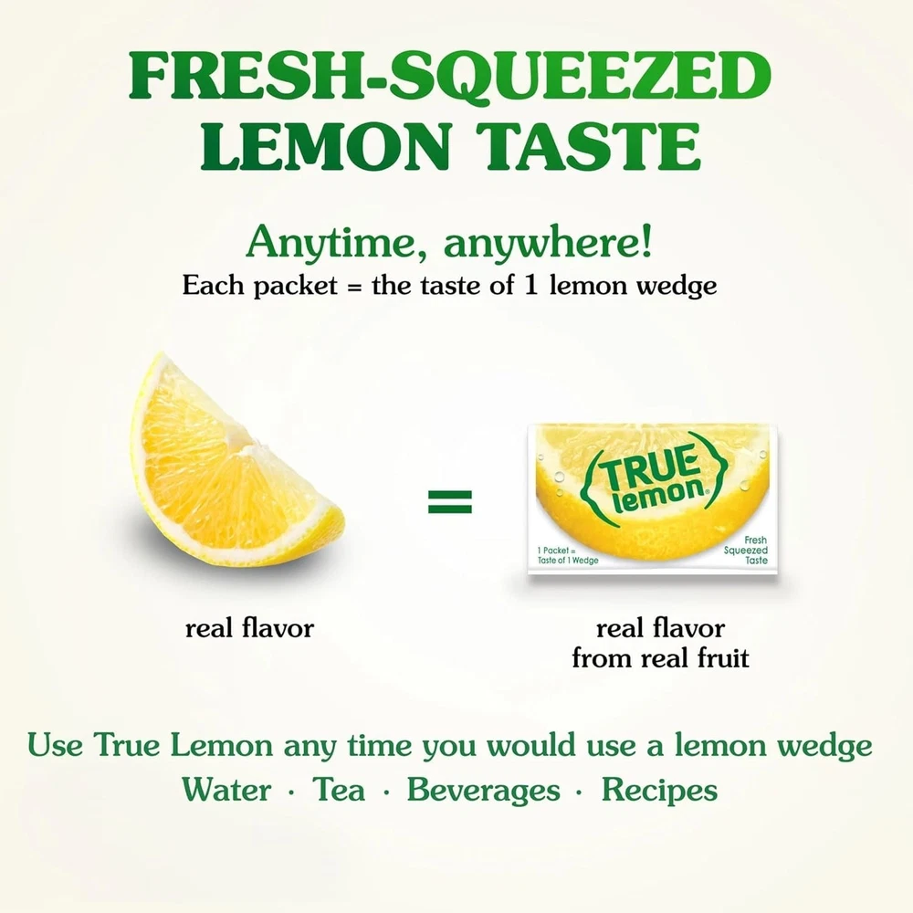 True Citrus TRUE LEMON Water Enhancer, Bulk 2.82 Ounce (Pack of 1), Red Description About True LemonWe believe in the power of hydration. Drinking enough water every day can make a big difference to your body, your brain, your mood, and yes, even your level of happiness. True Citrus is dedicated to making your water taste delicious so you can drink as much of it as you want. Whether you want to add just a burst of authentic, fresh-squeezed lemon to your water or you want to jazz up your water completely, we offer unsweetened, 0-calorie options, and 0-10 calorie sweetened choices (sweetened with stevia and a touch of sugar, but NO artificial sweeteners) so you drink water the way it makes you happy. Our water flavoring packets are perfect for making hydration enjoyable.Stay Happily Hydrated!All of our product lines are made with simple, non-GMO ingredients, including real citrus oils and juices so you can feel good about what you’re adding to your water and your body. From flavored water packets to sugar-free drink mix options, our products offer a variety of choices to suit your taste. Go ahead, add some True Citrus happy to your water with our drink packets for water! Features: Made with Simple, Non-GMO Ingredients: True Lemon is the easy way to add fresh squeezed lemon taste to everything. It's made with simple, non-GMO ingredients, including lemon oils and juices, is unsweetened, has zero sugar, and no artificial sweeteners Alternative to Lemon Wedges & Lemon Juice: 1 packet = the taste of 1 lemon wedge, 2 lemon packets = 1 tbsp of lemon juice, 6 packets = 1 squeezed lemon. True Lemon is shelf-stable and always provides consistent fresh squeezed lemon taste Convenient & Versatile: True Lemon is more than just a water flavoring. These zero-sugar, zero-calorie lemon powder packets are ready to freshen up any drink or recipe! Also, use True Lemon in teas, sodas, drinks, baking, cooking, and seasoning Easy Lemon Water, Great Value: True Lemon adds fresh, authentic lemon taste, so you can enjoy lemon water anytime, anywhere. These lemon powder packets are just pennies per serving compared to fresh fruit, flavored seltzer, and still or sparkling water Delicious Salt-Free Seasoning: True Lemon is an easy way to add zesty flavor to your favorite recipes—no salt needed! Combine with your favorite herbs or spices to create your own dressings, marinades, and seasonings. 0 calories, 0 g sugar and sodium Product Details: Handling We will ship all orders within 1 business day of payment. Delivery We Do Not Ship Outside of the Continental US. Return Policy All items qualify for returns within 30 days of receipt. Buyer is responsible for return shipping on any item that is not damaged. Feedback We take our reputation seriously, we buy and sell online, so we understand the value of trust. If you are unsatisfied with your order, please contact us and we will work with you to resolve it to your satisfaction.