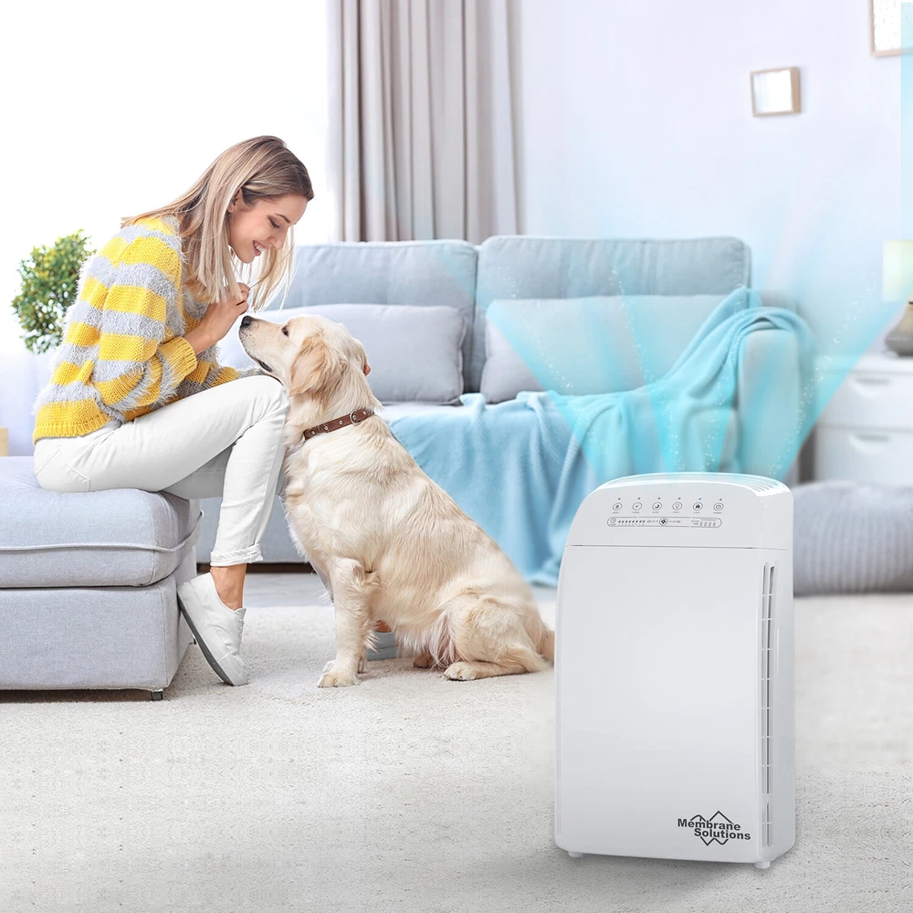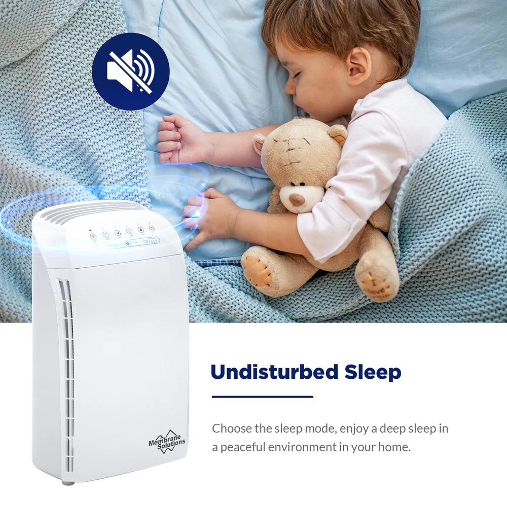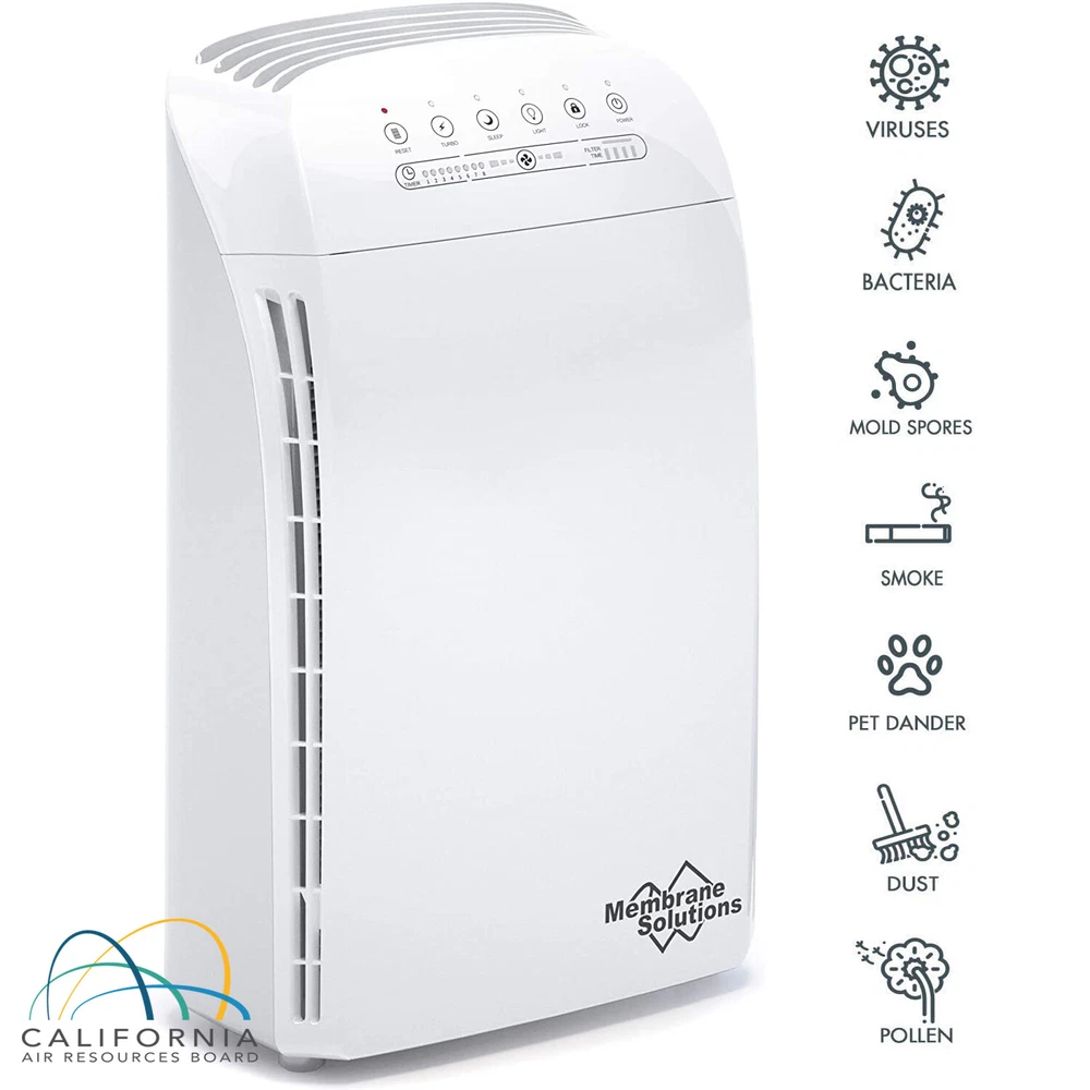 Membrane Solutions MSA3 Air Purifier Air Purifiers for Home, Air Purifier Air Cleaner For Smoke Pollen Dander Hair Smell Air Purifier with Sleep Mode Speed Control For Bedroom Office Living Room, - White (1)Powerful H13 HEPA filter (2)4 wind speed for more choice (3)CADR 850 CFM large coverage (4)Ultra-quiet night mode at 22dB (5)1/2/3/4/5/6/7/8H timer setting meet your need (6)Turbo engine circulates the air faster ✅Professional after-sales Service✅ 2 Year Warranty ✅ Free 60 Days Return Safety Certified by CARB Membrane Solutions Air Purifiers aim to improve the air quality in any room in your home or at work. HEPA air purifier circulates the air and makes it feels fresh, reduce airborne pollutants in your home. HEPA Filter Grade: H13 Product model: MSA3 Product size: 334×185×545mm Net weight: 6.2kg H13 HEPA Air purifiers With a upgraded 3 stage air filters to wipe out most of impurities from the air, Membrane Solutions air purifier will turn you a comfy and natural space. It's a good-looking compact air purifier for any space. It blends with the living space, and the design makes it look sleek in any modern style space. Powerful H13 HEPA filter 4 wind speed for more choice CADR 850 CFM large coverage Ultra-quiet night mode at 22dB 1/2/3/4/5/6/7/8H timer setting meet your need Turbo engine circulates the air faster More Features: Filter Time show the lifespan of the filter. Touch lock in case children or pets touch. Sleep Mode help you clean the air most silently. Filter replacement reminder tell you when to change the filter. Turbo mode will circulate the air in your room fastest. Note: The filter is wrapped in a plastic bag, please remove it before the first using of air purifier. Energy-Saving Low Power The operating power as low as 50W allows the purifier to save 30% on electricity bills than other air purifiers. Ultra-Quiet with Brushless Motor Thanks to the new brushless motor, the 22dB noise level is almost voiceless. It cleans your air, doesn't affect your work, study or sleep. Touch Lock Press the Lock key to turn on/off the touch lock. Once turn it on, all other buttons are unable to be used. Avoid children or pets touch ramdomly.