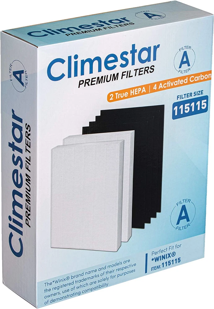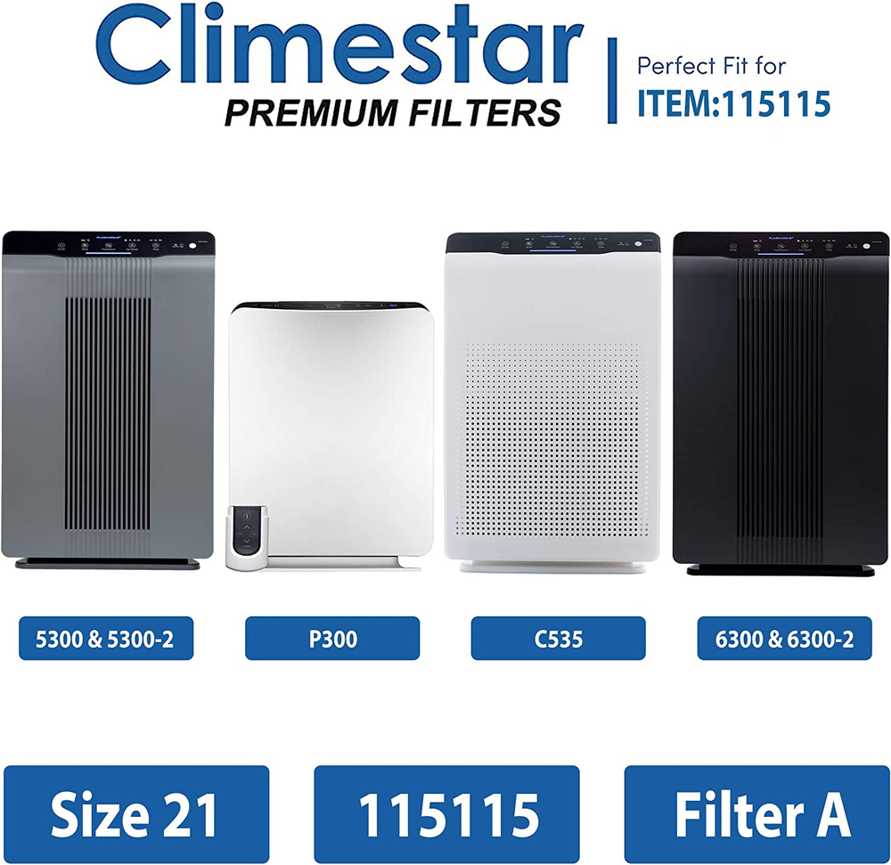 Climestar Premium Quality Filter A 115115 Size 21 HEPA Filter Compatible Replacement for Air Purifiers 6300 P300 5300 5500 5300-2 6300-2 C535. Climestar Pack of 2 HEPA Filters and 4 Prefilters: HEPA Filter dimensions are 16.6” x 12.9” x 1.4” and Pre-Filter dimensions are 16.2” x 12.10” x 0.4" Captures 99.97% of airborne particles Improves your air quality and provides clean breathable air. Brand New. Climestar Premium Quality Filter A 115115 Size 21 HEPA Filter Compatible Replacement for Air Purifiers 6300 P300 5300 5500 5300-2 6300-2 C535 Pack of 2 True HEPA Filters and 4 Prefilters: HEPA Filter dimensions: 16.6” x 12.9” x 1.4” and Pre-Filter dimensions: 16.2” x 12.10” x 0.4" Extra Pre-filter extends HEPA Filter Life Package contents: 1 HEPA filter, 4 pre-filter, Captures 99.97% of airborne particles Provides clean breathable air. Improve your air quality with Climestar filters Brand New