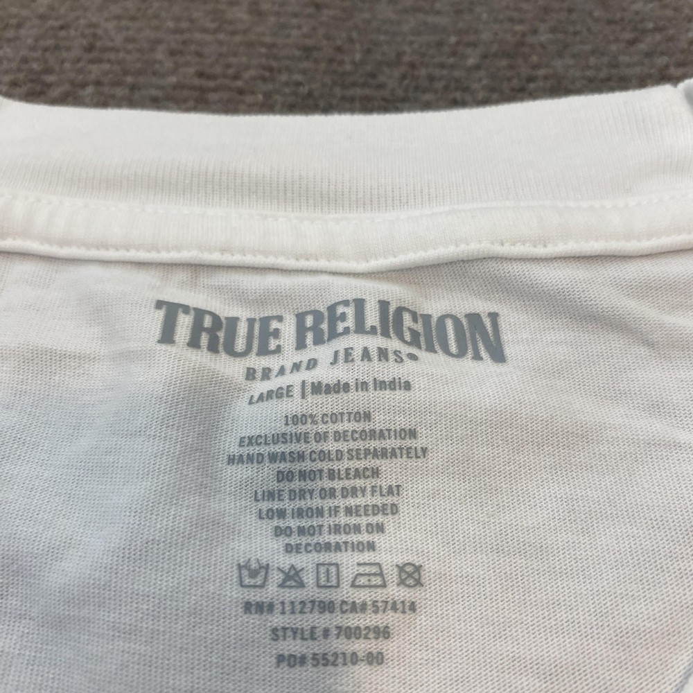 True Religion Shirt Mens Large White Tiger Graphic Fashion For The Senses Logo Tee Condition: Gently worn, no visible flaws. Shirt is in excellent pre-owned condition with no stains, holes, or significant signs of use. 100% cotton for comfort and breathability Large roaring tiger graphic with "True Religion Brand Jeans" and "Fashion For The Senses" text on front Printed brand neck label: True Religion Brand Jeans, Large, Made in India Style code: 700296 PO#: 55210-00 Main color: White with yellow, black, and red graphic details Tag size: Large (Mens) Approximate flat measurements (see photos for reference): - Pit to pit: about 21 inches - Back length (collar seam to hem): about 29 inches Care instructions: Hand wash cold separately, do not bleach, line dry or dry flat, low iron if needed (do not iron on decoration) Great streetwear graphic tee ready for casual wear or collection