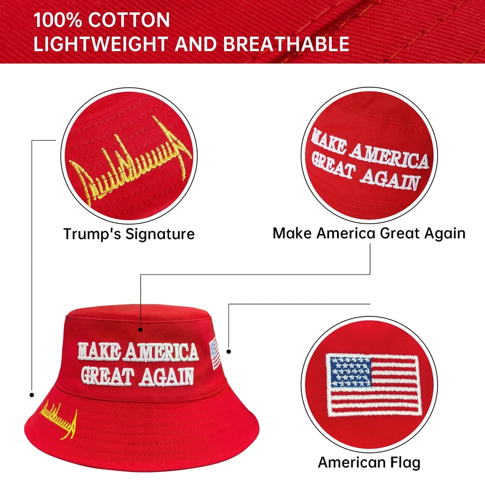 Description Maga Bucket Hat, Donald Trump Bucket Hat 2024 for Women Make America Great Again Flag Embroidery Summer Outdoor Sun Beach Hat MAKE A STATEMENT: Forget all those same old hats and upgrade your hat collection with this "Make America Great Again " 45-47 MAGA hat. If you are looking for an excellent combination of style and ergonomic design, this Trump 2024 bucket hat is the way to go.New Trump 2024 bucket hats for Trump fans.If you wear this Trump hat, you will be the center of attention HASSLE FREE WASHING: Made from high quality 100% cotton fabric, we can assure you that this Trump 2024 45-47 MAGA hat is designed to last. When it’s time for washing, simply toss it in the washing machine and let it do the rest,Simple as that GREAT FIT: We have designed this embroidered MAGA bucket hats for men women to have a perfect fit on any head size. One size fits most adult women and men BREATHABLE HEAD CAPS: This Trump maga sun hat has eyelets on its top for extra breathability. No more sweating, no more uncomfortable hats. The large 3-inch will protect you from sun rays. Prevent wind from blowing on your face as well BEST GIFT: If you are a Donald Trump's fans and looking for a patriotic and inspiring Donald Trump hat to wear on daily basis.We would like to recommend this Make America Great Again hat to you. The inspirational quote Slogan and the beautiful embroidered American flags on each side of the the adjustable MAGA baseball caps will be adored