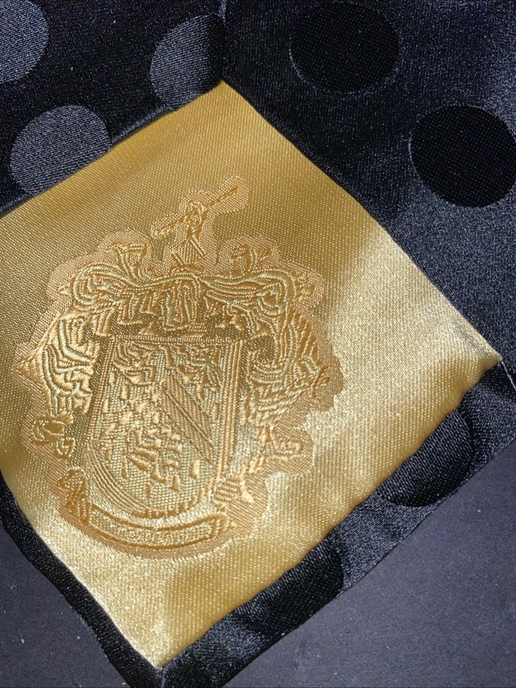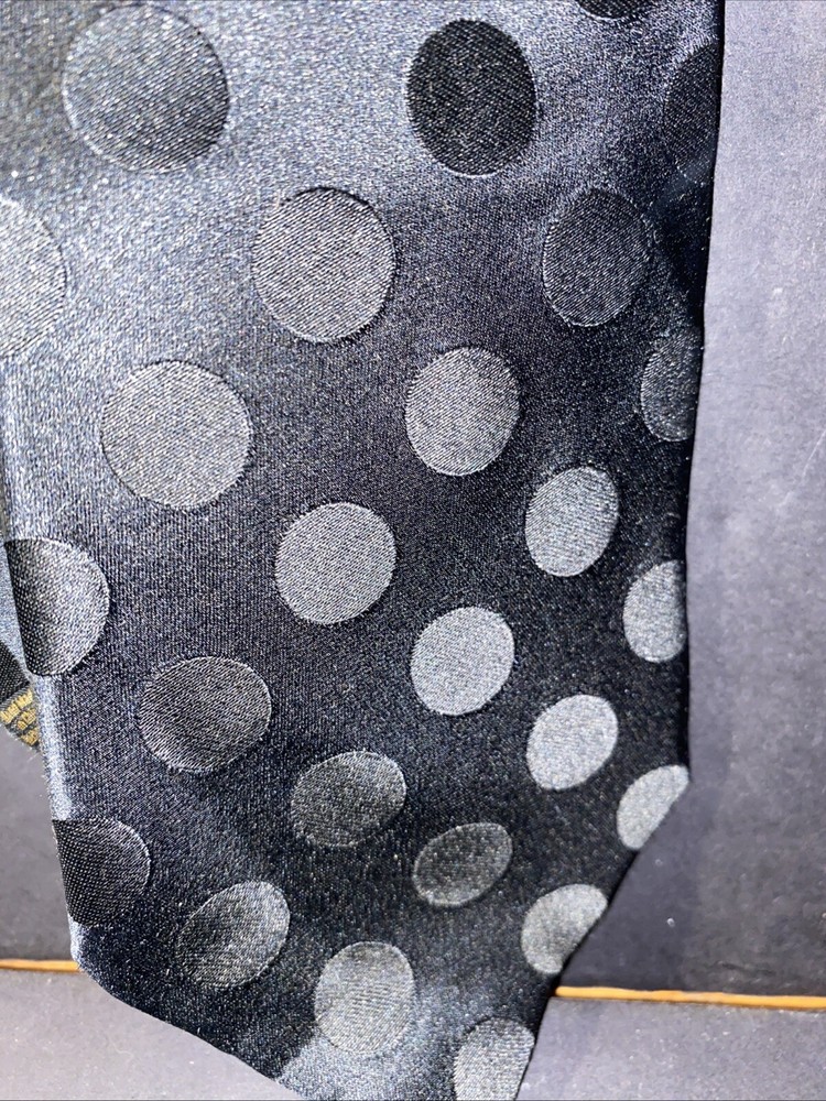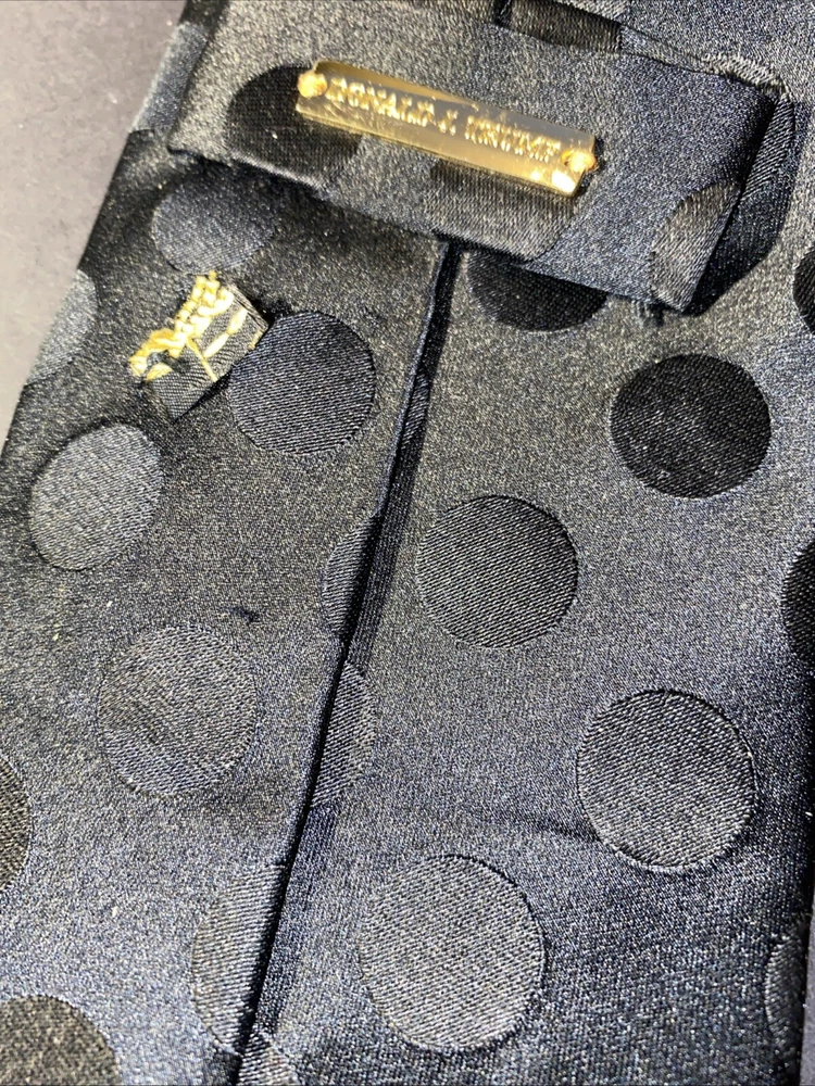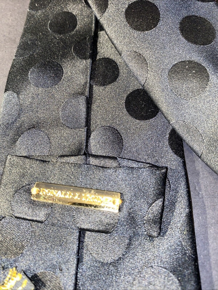 This is a black polka dot tie from the Donald J. Trump Signature Collection, made of 100% silk. It features a design associated with President Donald Trump and is of designer style. The tie is part of men's accessories and was manufactured in China.