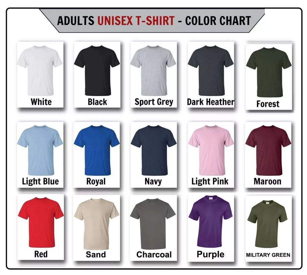 WELCOME TO OUR SHOP! ALL PRODUCTS ARE 100% MADE IN THE USA Shirt Colors Available: Black, White, Light Blue, Royal Blue, Navy Blue, Charcoal, Red, Grey, Maroon, Dark Heather, Pink, Sand, Green, Purple, Military Green, Ash Grey Printed and Shipped from the U.S. Gildan 5000 T-shirt (U.S. Sizes) Sizes: S, M, L, XL, 2XL, 3XL, 4XL, 5XL Material: 100% Heavy Cotton PLEASE LET US KNOW YOUR COLOR CHOICE AT CHECKOUT!