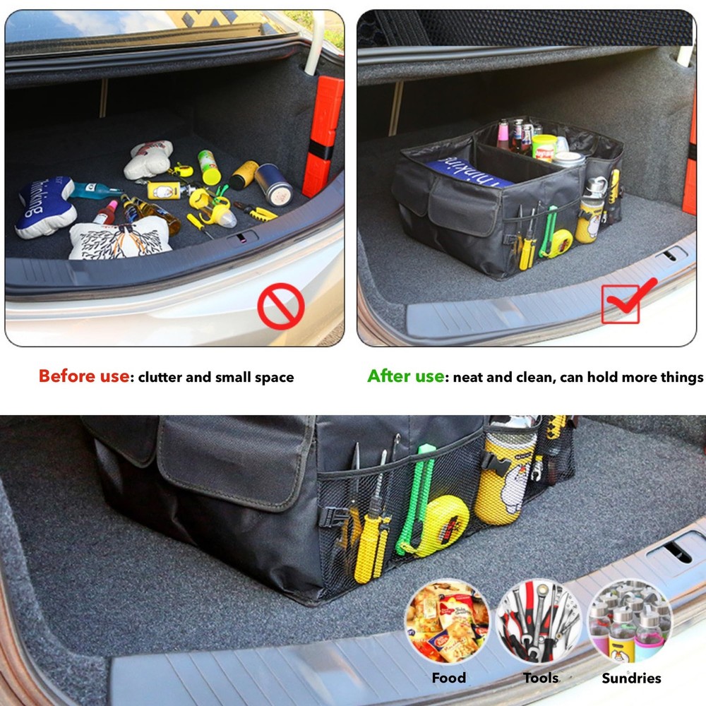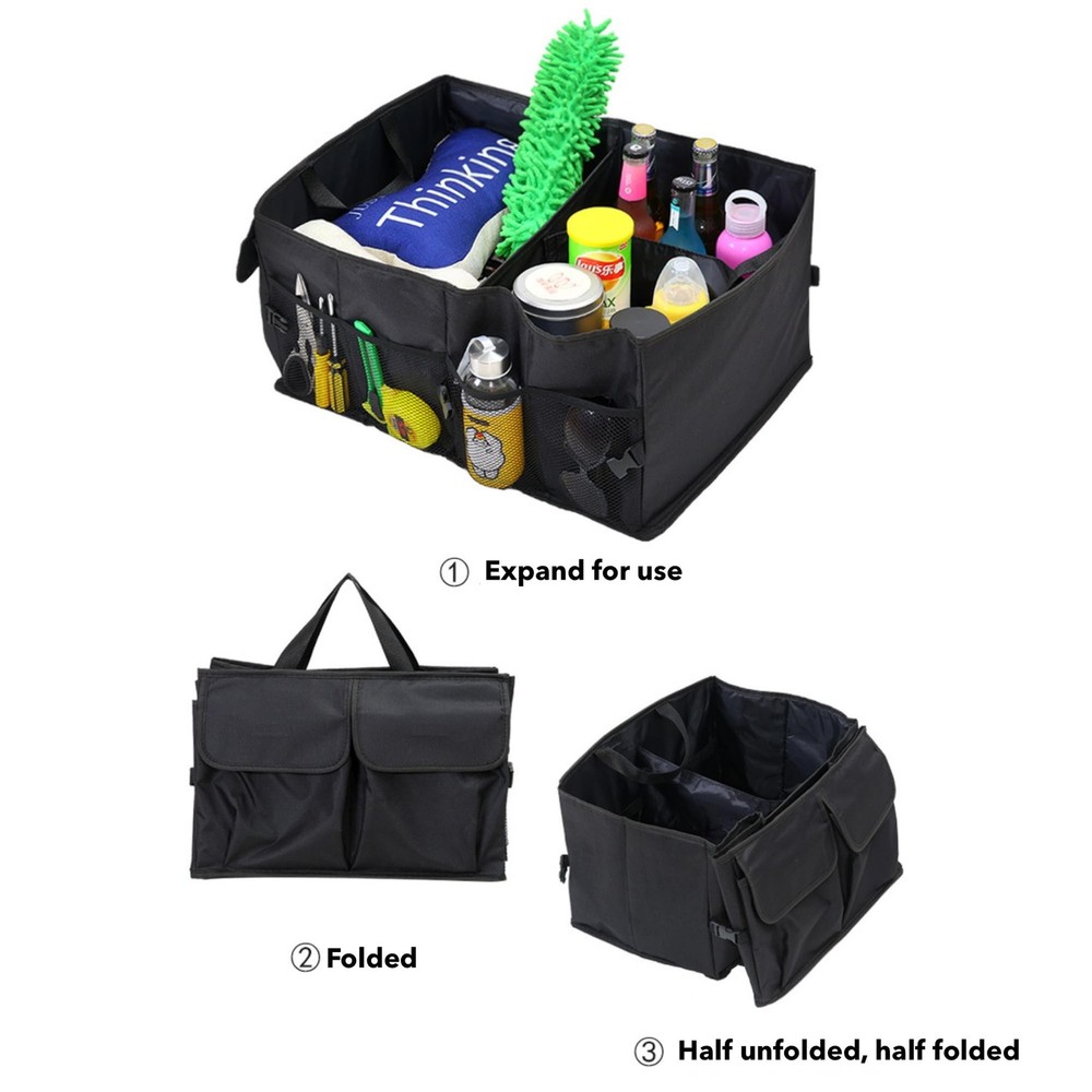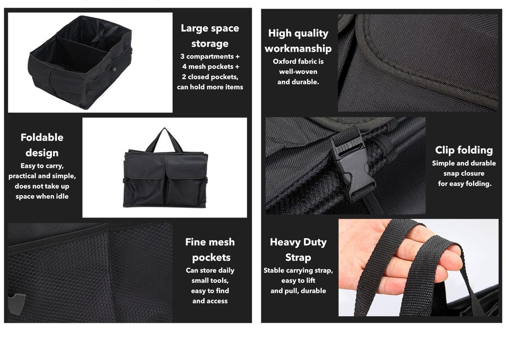 Trunk Organizer for Car - 52L Large Capacity Collapsible Multi Compartments Storage Organizer, Portable Car Storage Box for most Cars/Suv, Black Product Details Specific Uses For Product: Organizer Material: Polyester Special Feature: Foldable Color: Black Brand: GCFTIFF Finish Type: Unfinished Mounting Type: Tabletop Mount Product Dimensions: 15"D x 20.5"W x 10"H Item Weight: 1.1 Pounds Number of Compartments: 3 Specific Uses For Product: Organizer Material: Polyester Special Feature: Foldable Color: Black Brand: GCFTIFF Finish Type: Unfinished Product Dimensions: 15"D x 20.5"W x 10"H Capacity: 52 Liters Number of Items: 1 Manufacturer: GCFTIFF Item Weight: 1.1 pounds Item model number: ZC0402-TO01 Finish: Unfinished Special Features: Foldable Included Components: Trunk Organizer Batteries Included?: No Batteries Required?: No Date First Available: April 2, 2024 Durable Materialsthe foldable car trunk organizer is manufactured with the strongest and most durable oxford polyester fabric with reinforced stitching on areas that receive the most wear which can withstand the heavy use and pass the test of time with repeated use Collapsible Design Car Storage OrganizerIt has 3 compartments and sidewalls with removable divider can be resized to fit large or small vehicle spaces and conveniently folds away when not in use,Large space storage,3 compartments , 4 mesh pockets , a2 closed pockets, can hold more items and quick access items Easy to install & Use It is super easy to install and fold this storage box. You can just fold it to store it when not in use. It takes up less space. Just take this organizer with you when you are going shopping or having a picnic. When the surface is dirty, it is so easy to clean the surface with a damp cloth Versatile Use Trunk Organizer For Car is the best solution to keep your car tidy. It fits all vehicles ( truck, suv, van, jeep, car etc.)great for carrying and organizing groceries, toys, sporting equipment, tools etc in your trunk, solve the chaotic scene of the trunk with this organizer.the trunk organizers are not limited to just car use; they can also be employed in various settings, such as at home or in the office. Waterproof & Non-SlipIt is water resistant and abrasion resistant, easy to install and cleanThe non-slip bases of these organizers ensure that they stay in place while driving, reducing the risk of spills or items rolling around in the trunkNow, Try it , Gone are the days of a messy car.
