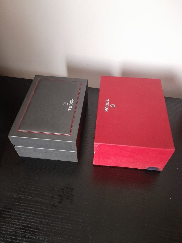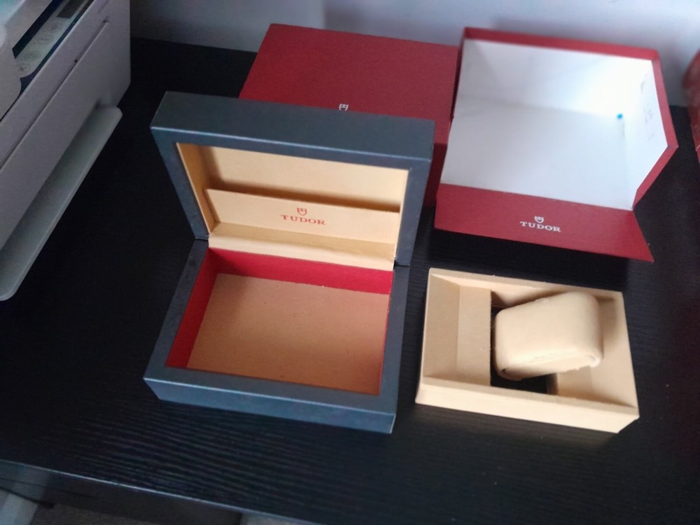 Original grey Tudor box complete with outer red box. The box design is likely from the 2000s. Good condition. There is a blue ink stain on the red paper box. Please see photos. Thanks.