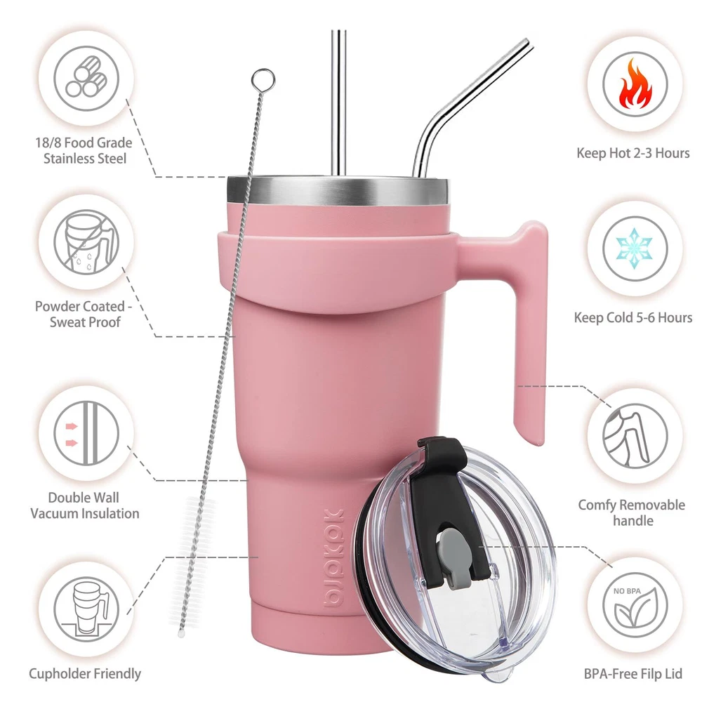 20oz Tumbler With Handle, Stainless Steel Insulated Tumbler Cup With Lids And Straw,Light Pink Stainless Steel Tumblers With Straw: Made Of Premium 18/8 Food Grade Metal, Durable, Adopt Double Walled Vacuum Insulation Keeps Your Beverages Hot Or Cold For Hours Cupholder Friendly Travel Mugs With Handle: The Insulated Cups Has a Narrow Bottom And A Wide Mouth Fits Most Cup Holder In Car, With Detchable Handle And Reusable Straw To Use More Portable, You Can Stay Sipping From Your Essential Hydration Companion, Even On Your Busiest Days BPA-Free Lids: The Sip Design Lid Allow You To Sip, Drink Or Gulp, Choose Your Own Way For Drinking (Note: The Insulated Tumbler Cup Come With Two Lids, Flip Lid Leakproof And Another Slider Lid Not Leakproof) Dishwasher Safe Insulated Coffee Tumbler: Spend Less Time To Cleaning Your Tumbler And Lids, Just Pop Them Into The Dishwasher Thermal Cup Is Designed For Everyday Use, Travel, Work, Sports, Swimming, Camping, Parties Etc; These Tumblers Cups Are Also Wonderful Gifts Options For Friends Or Family
