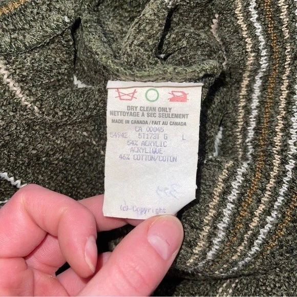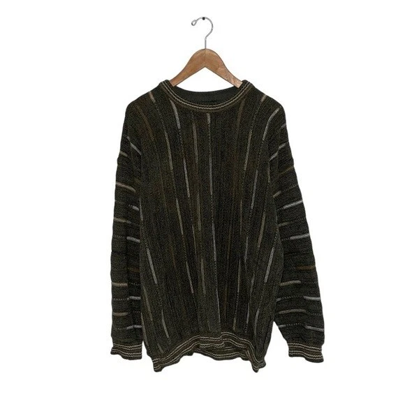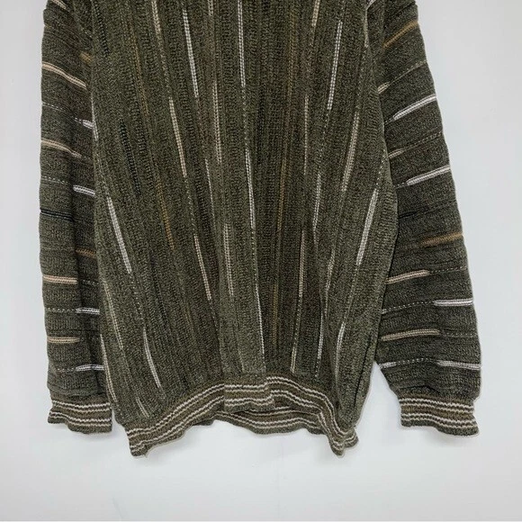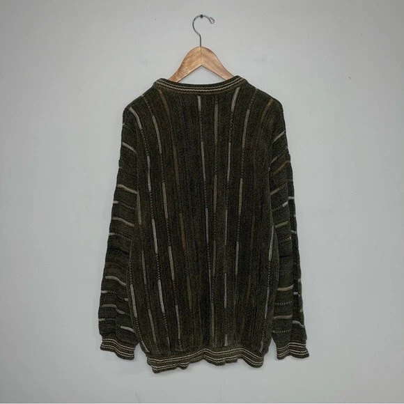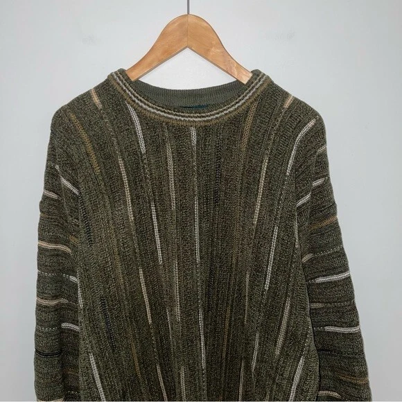 Tundra Canada Vintage Sweater Men's size large Excellent vintage condition, minor wear Colour: Green with brown/tan/ivory details DETAILS This cool vintage sweater has all the Coogi vintage 90s vibes! The green, brown, tan and ivory tones are the perfect blend for your neutral wardrobe. The velour fabric has depth and softness and begs to be touched. The close-ups highlight the artistry of this beautiful sweater. Round neckline Cuffed hem & sleeve hems Really cool textured knit Cotton/acrylic blend Approx measurements (flat): Pit-to-pit: 23.5" Shoulder-to-hem length: 29"
