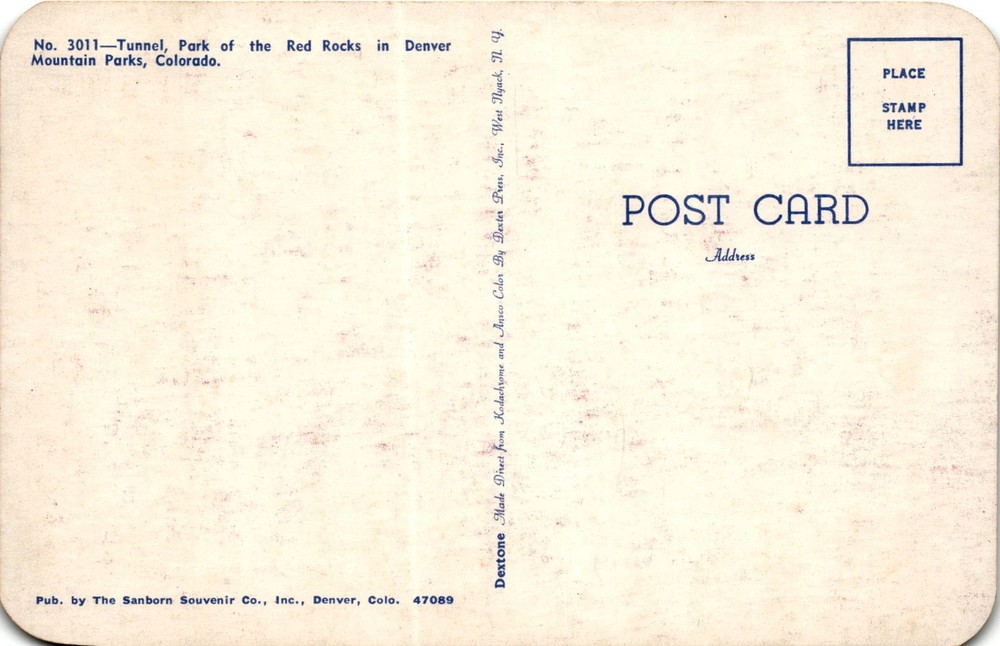 MAKE AN OFFER. THE MORE YOU BUY THE BETTER DEAL I WILL ACCEPT The postcard features a view of a tunnel in the Park of the Red Rocks in Denver, Colorado, part of the Mountain Parks system. The image showcases the natural beauty and unique rock formations found in the park. The postcard was published by The Sanborn Souvenir Co., Inc. in Denver, Colorado.