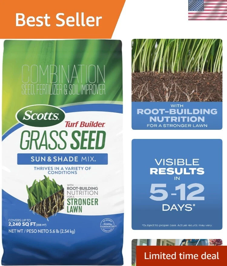 Turf Builder Grass Seed Sun & Shade Mix with Fertilizer and Soil Improver, Thrives in Many Conditions, lbs. Turf Builder Grass Seed Sun & Shade Mix is a versatile mix that stays green even in extreme conditions of dense shade or scorching sun, and aggressively spreads to repair bare and thin spots This grass seed mix is designed for full sun and dense shade, and has a fine bladed texture with medium to high drought resistance Use this lawn care product in the spring or fall to seed a new lawn or overseed an existing lawn Each seed is wrapped in a unique WaterSmart Coating to absorb 2X more water and keep seed moist 2X longer than uncoated seed One lb. bag of Turf Builder Grass Seed Sun & Shade Mix has a new lawn coverage of 745 sq. ft. and an overseeding coverage of 2,240 sq. ft. ® Turf Builder® Grass Seed Sun & Shade Mix® thrives in a variety of conditions. This mix contains Root-Building Nutrition, a combination of ingredients that is expertly crafted to help establish deep roots to grow thick, green turf so that you can build a better, stronger lawn from the roots up. ® Turf Builder® Grass Seed Sun & Shade Mix® is designed for full sun and dense shade, and has medium drought resistance with medium to high durability. It can be used to seed a new lawn or overseed an existing lawn. For best results, apply in the spring or fall when daily average soil temperatures are consistently between 55°F and 70°F or air temperatures are between 60°F and 80°F. We recommend using a ® spreader to apply this product (please refer to spreader settings on product label). Water daily or as needed to keep the soil surface moist until the seedlings reach at least 2 inches tall. One lb. bag of ® Turf Builder® Grass Seed Sun & Shade Mix® has a new lawn coverage of 745 sq. ft. and an overseeding coverage of 2,240 sq. ft.