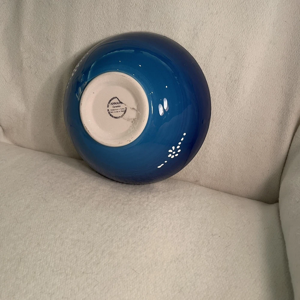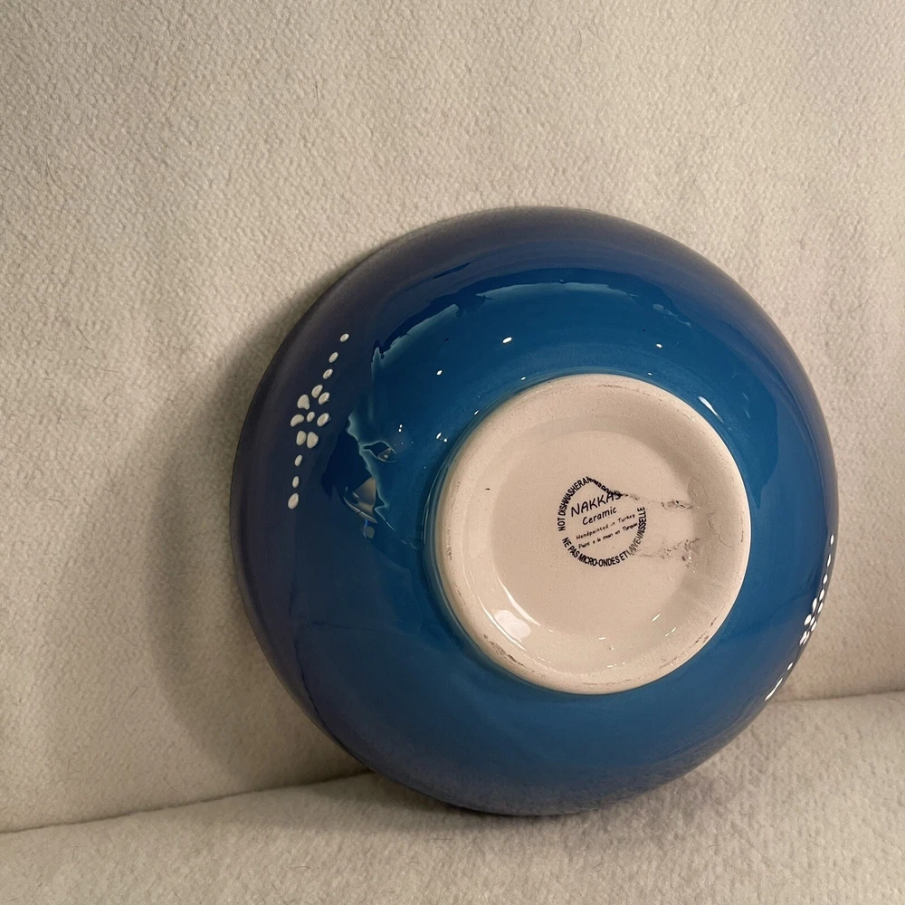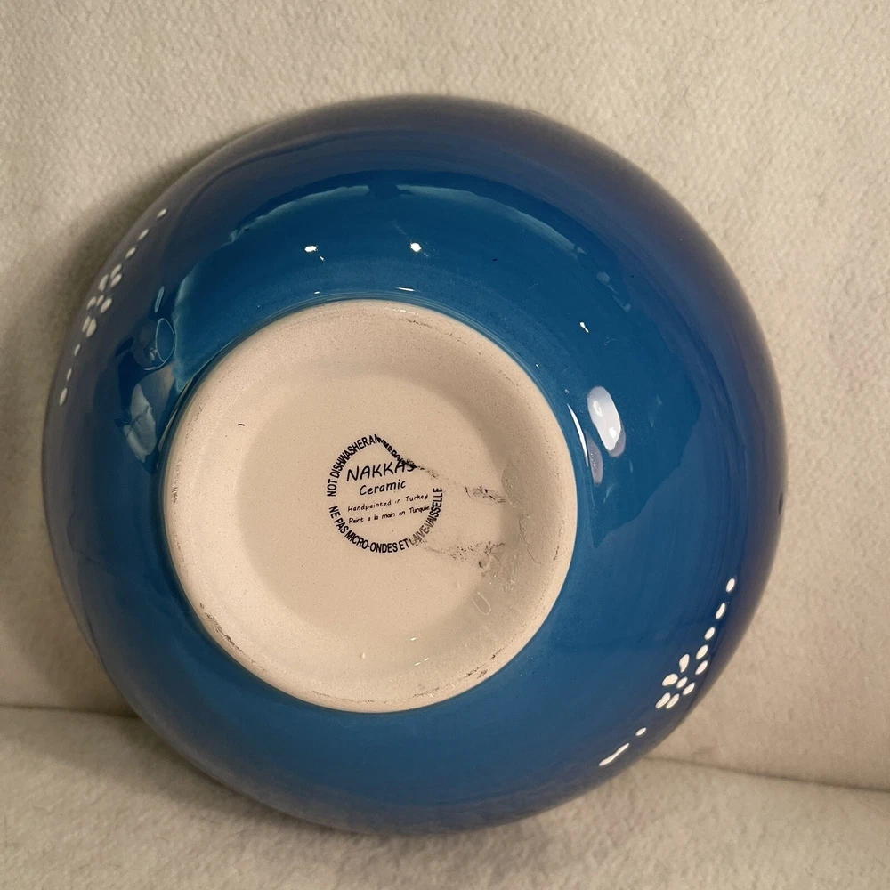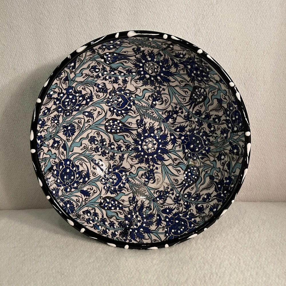 This Turkish ceramic serving bowl features a hand-painted floral motif in blue, white, and black colors. The round bowl has a diameter of 8.25 inches and a height of 3 inches, making it a decorative and functional piece for serving food. With a vintage style and contemporary design, this art pottery piece from the 1990s is a unique addition to any table setting, showcasing traditional Turkish craftsmanship and a floral theme. The brand is Turkish, and the bowl is made of ceramic, weighing 1.5 lbs. Excellent condition. No chips or cracks.