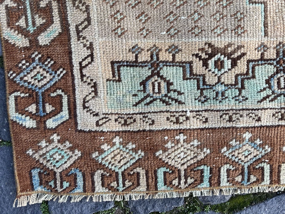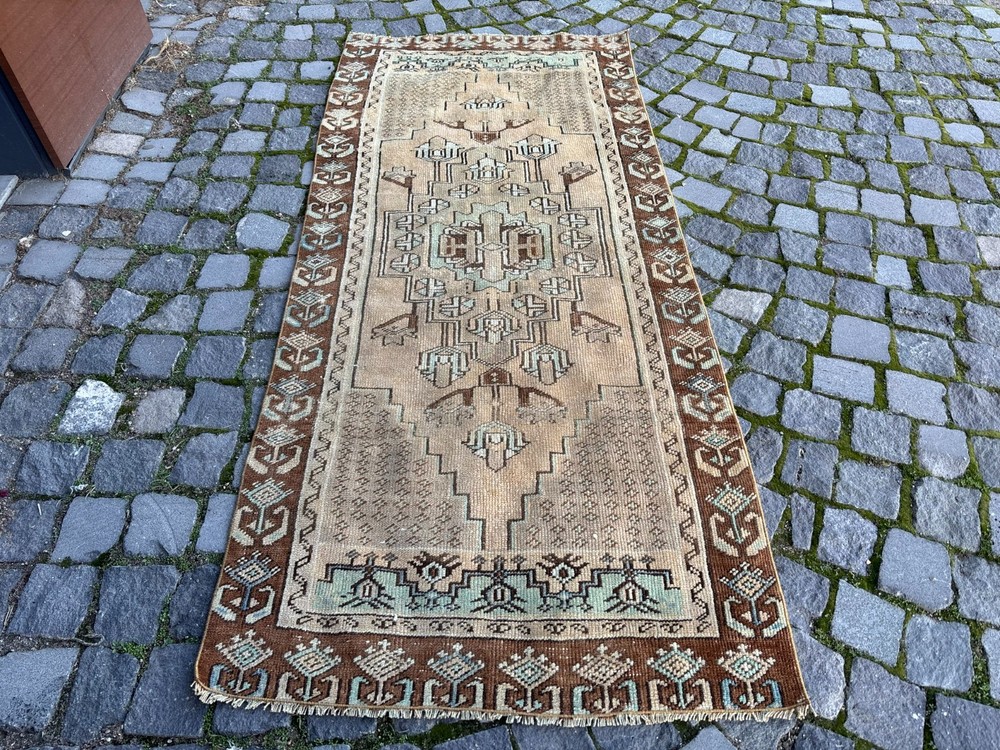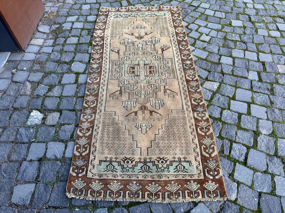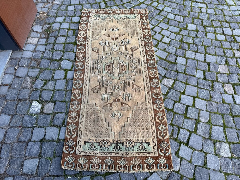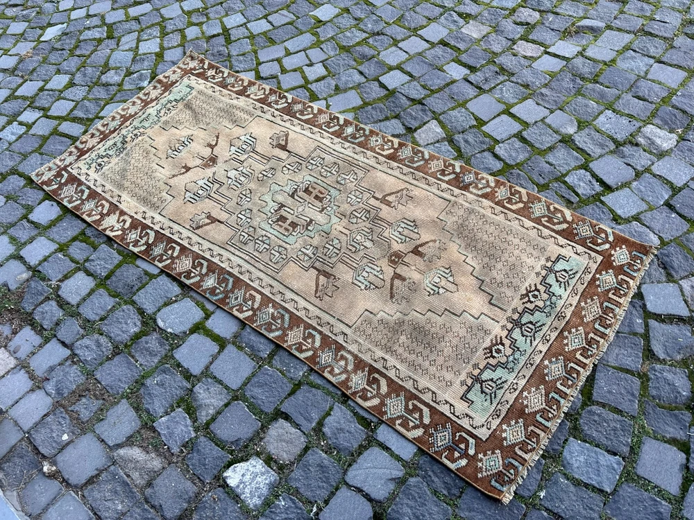 An old (approximately 45-60 years old) hand knotted / hand woven Turkish rug from the Middle Anatolian Region and made of genuine, high quality wool, in natural colors. Our distinguished Antiques and Vintage rugs, each with its own unique story, have been carefully selected from every corner of Turkey. RUG DETAILS * One-of-a-kind vintage rug * Dimensions: 2,7 x 6,2 ft = 33 x 75 inc = 85 x 191 cm * Low pile: approximately 0.2"(0.5 cm) * Dyed with natural dyes * Product code : AA 1499 SHIPPING * Free shipping on all items. * Usually shipped via FedEx or UPS. * Item will be ready for shipment within * Estimated delivery 3-5 business days 1-3 business days with a tracking number. All of our rugs have been professionally cleaned and ready to ship before being listed. These unique vintage rugs have normal wear related to their age. We believe this adds to the authenticity of these hand-woven beauties. We inspect all rugs carefully before Shipping, but in the unlikely event that due to our fault, the goods are not fit for purpose, damaged/defective, or we ship the wrong item, we will issue a 100% refund. We are a team of experienced professionals who are dedicated to ensuring your items arrive safely. Please note that our photos accurately represent the colors of the rug, however it may look different in the light in your home or against different colored floors. We are so excited to share the beauty and art of rugs with you and to see how your personal spaces transform! I do my best to build a great experience in online rug shopping for you, just look at the reviews. Please feel free to write me over conversation if you have any questions about the rug or price. I will be happy to answer to you. Thank you, Yusuf.