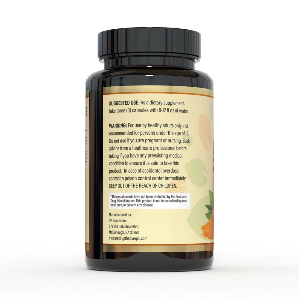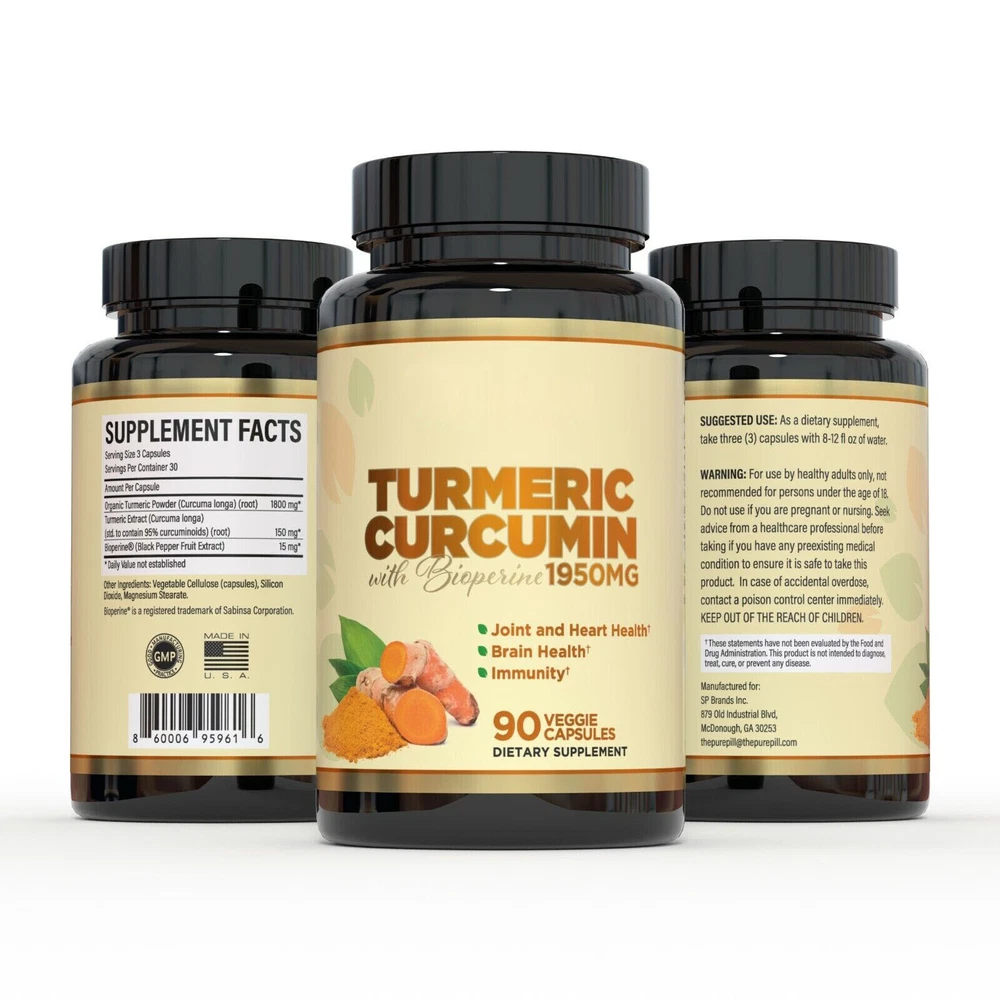 Condition:New: A brand-new, unused, unopened, undamaged item (including handmade items). See the seller's ... Main Purpose:Anti-Inflammatory, Antioxidants, Arthritis, Immune Support Administration:Oral Ingredients:Curcumin Dosage:1950mg Brand:Bioperine Active Ingredients:Turmeric Type:Extract Formulation:Capsule Type of Diet:Herbal, Natural, Vegetarian Body Area:Body Features:Food Grade, Natural, Organic Scent:black pepper, Curcumin, turmeric, curcuminoids, Herbal Country/Region of Manufacture:United States Item Weight:3.5 oz eBay The Pure Pill focuses on providing innovative and affordable dietary supplements which are meant to promote a healthy, active lifestyle without compromising on your comfort or wellbeing. We make it a rule from working only with premium grade ingredients and state of the art facilities which obey all international standards of quality and safety. Should you not be entirely pleased with your purchase, our customer care department is entirely at your disposal! Turmeric Curcumin with Bioperine – Excellent Joint and Immune Support On A Daily Basis The Pure Pill turmeric supplement is definitely a must in your diet, supporting joint health and having excellent anti-inflammatory and antioxidant properties which give your immune system a proper boost. Made with organic ingredients, with a pure and high concentration of active ingredients, superior bioavailability and absorption, this turmeric curcumin with black pepper is easy to digest and comes in a convenient 90-capsule bottle, for 30 servings. Still not convinced? Here are some of the amazing features of this product: · Made in USA; · GMP sealed facility; · Third party tested; · Joint support, immune support; · Promotes healthy heart and brain; · 1950mg highly potent formula; · No dangerous fillers and preservatives; · 95% curcuminoids; · For men and women of all ages. Reap all the benefits this premium anti-inflammatory supplement has to offer!