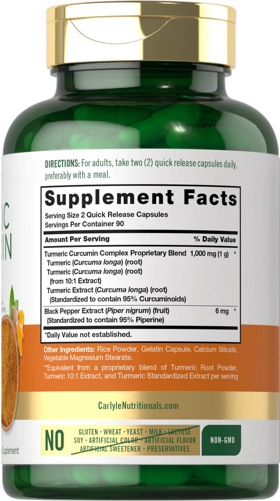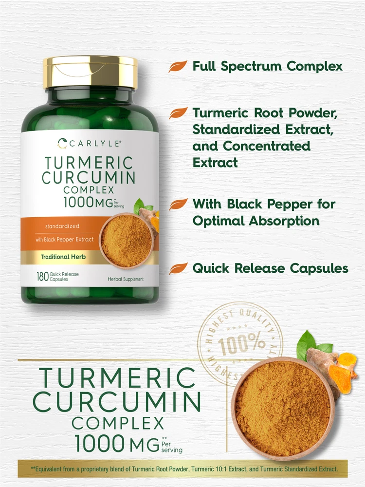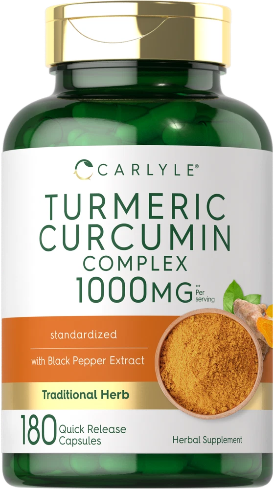 Nature’s Golden Herb: Commonly known as the "Golden Herb," Turmeric (Curcumin) is a classic culinary spice that has been used for centuries in herbal traditions. It is especially popular in Ayurvedic practices, offering naturally occurring beneficial compounds known as Curcuminoids derived from its roots. An herbal supplement such as powder, liquid, tablets, and capsules is the best way to get the benefits of this golden herb for your daily routine! Carlyle Turmeric Curcumin: At Carlyle, our Standardized Turmeric Curcumin supplement features 1000 mg of a premium Turmeric Curcumin Complex Proprietary Blend per serving enhanced with Black Pepper extract for maximum support. We put our herbs to the test, ensuring exceptional purity and potency, always giving you the best quality you deserve. Discover the secret of this golden herb with our gluten-free and non-GMO formula today! Rooted in Wellness: Our expertise in sourcing the purest ingredients combined with advanced technologies makes us proud to deliver premium, honest supplements at the best value. Carlyle Turmeric Curcumin is a testament to our commitment to excellence, made with powerful ingredients rooted in wellness. Thanks for choosing us in your pursuit of living healthy! **Equivalent from a proprietary blend of Turmeric Root Powder, Turmeric 10:1 Extract, and Turmeric Standardized Extract.