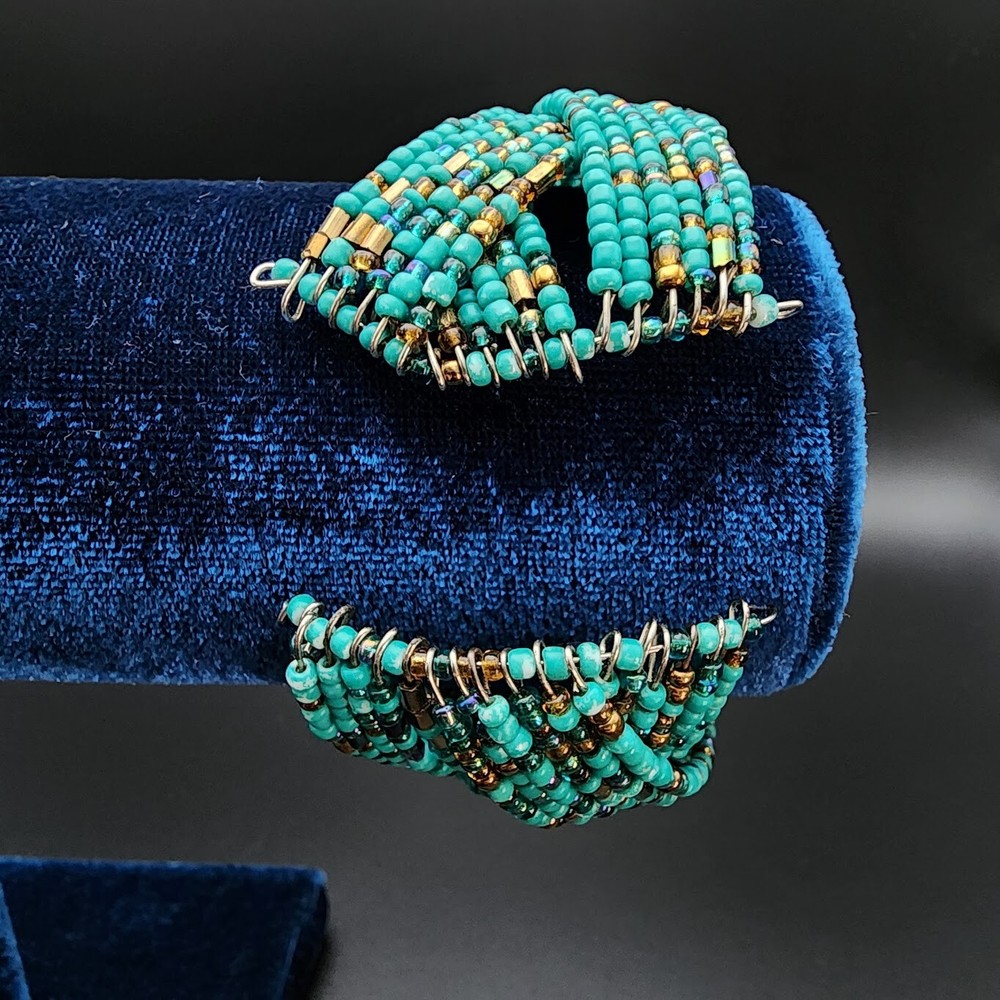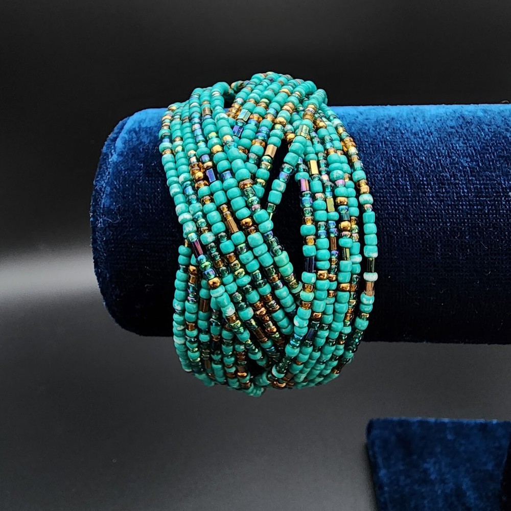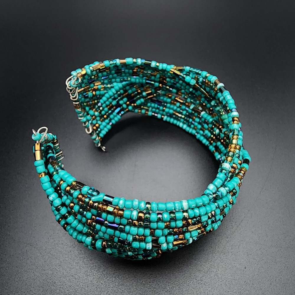 Item Length:7.5 inSecondary Stone:No StoneSetting Style:.Theme:Beach, Beaded, BohemianMain Stone Treatment:UnknownCharm Type:BeadCountry of Origin:UnknownMain Stone Color:BronzeCut Grade:.Modified Item:NoClasp Type:CuffStyle:Beaded, CuffCountry/Region of Manufacture:UnknownSeller Notes:“Great Condition. See pics for details.”Closure:.Material:Glass BeadsMain Stone:Not ApplicableHandmade:YesColor:TurquoiseChain Type:WireBrand:HandmadeVintage:YesMetal:UnknownMain Stone Creation:UnknownType:BraceletNumber of Gemstones:0