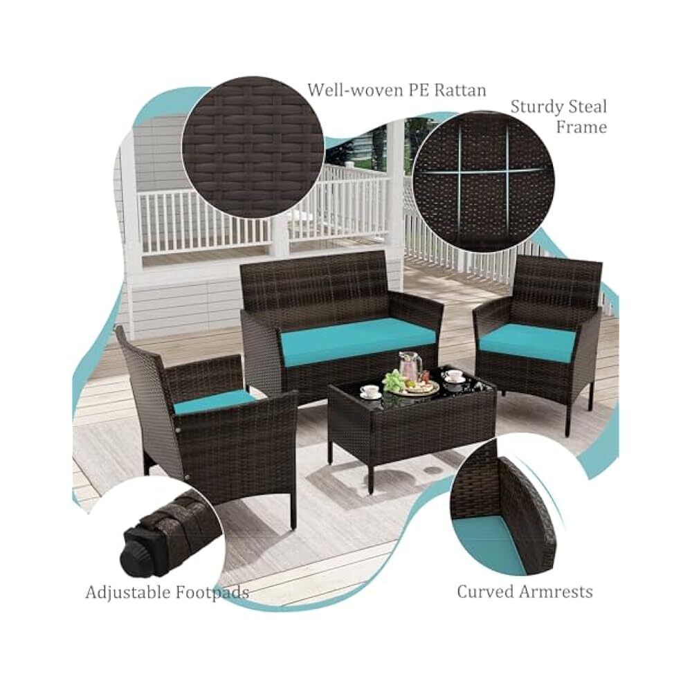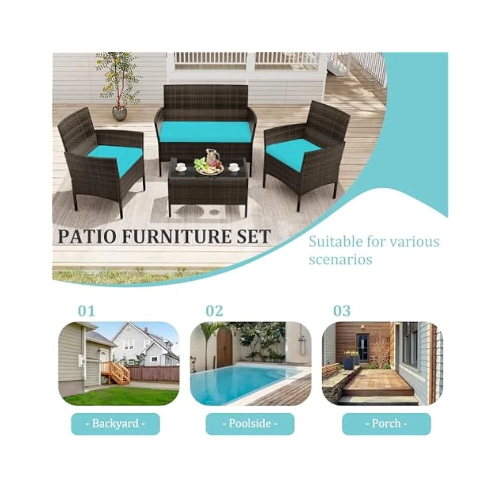 STORE NEW ARRIVALS ADD TO FAVORITE VIEW FEEDBACK Stylish Turquoise Patio Set, Rattan Loveseat, Chairs & Glass Coffee Table Description 4-Piece Patio Furniture Set – Create Lasting Family Memories Outdoors! This 4-piece patio furniture set provides a comfortable and stylish outdoor space for your family to relax and connect. Featuring a loveseat, wicker chairs, and a tempered glass coffee table, this set is perfect for backyards, porches, or any outdoor area. Crafted with durable rattan, this set offers long-lasting enjoyment for years to come. As a father and son caregiver, I understand the value of quality time, and this set provides the perfect setting for those precious moments. Enjoy conversations, family meals, or simply unwind in the fresh air. This set is designed for easy maintenance, allowing you to spend more time enjoying your outdoor space and less time on upkeep. It’s a value-for-money investment that will enhance your outdoor living experience and become a cherished part of your family’s routine. Create a welcoming atmosphere for family and friends with this beautiful and functional patio set. This set offers a reliable and comfortable outdoor experience for your family and guests. Enjoy the sunshine and create lasting memories with this durable and stylish furniture set. Product Features Comfortable and stylish outdoor space Includes a loveseat, wicker chairs, and a tempered glass coffee table Crafted with durable rattan Easy maintenance Value-for-money investment Creates a welcoming atmosphere Reliable and comfortable outdoor experience Technical Specifications Set Pieces 4 Components Loveseat, Wicker Chairs, Coffee Table Material Rattan, Tempered Glass ABOUT US We offer the best prices around on high quality products. Our E-store includes media such as books, movies, music and games while offering electronics, toys, sporting apparel, clothing, tools, general home, garden items and more. SHIPPING We are always working hard to ensure your package arrives as soon as possible. Please understand that some factors like weather, high postal traffic, and the performance of shipping companies are outside of our control. For shipping outside of the continental USA, we only use eBay's Global Shipping Program.The item is shipped to KY and then sent to the rest of the world. International customers are responsible for all duties and taxes. Continue to check out in order to calculate costs for shipping the item to your country. Messages regarding eBay's Global Shipping Program MUST be directed at eBay EXCLUSIVELY. RETURNS We offer a 30-Day Return Policy on items which you are not completely satisfied with. You have the option for a full-refund or an exchange of the item. No returns are available on items shipped outside of the USA. CUSTOMER SATISFACTION We try our very best to make sure every customer is completely satisfied. If there's a problem, message us! We're happy to help. WE ACCEPT Copyright © 2021 AutoDS. | All Rights Reserved