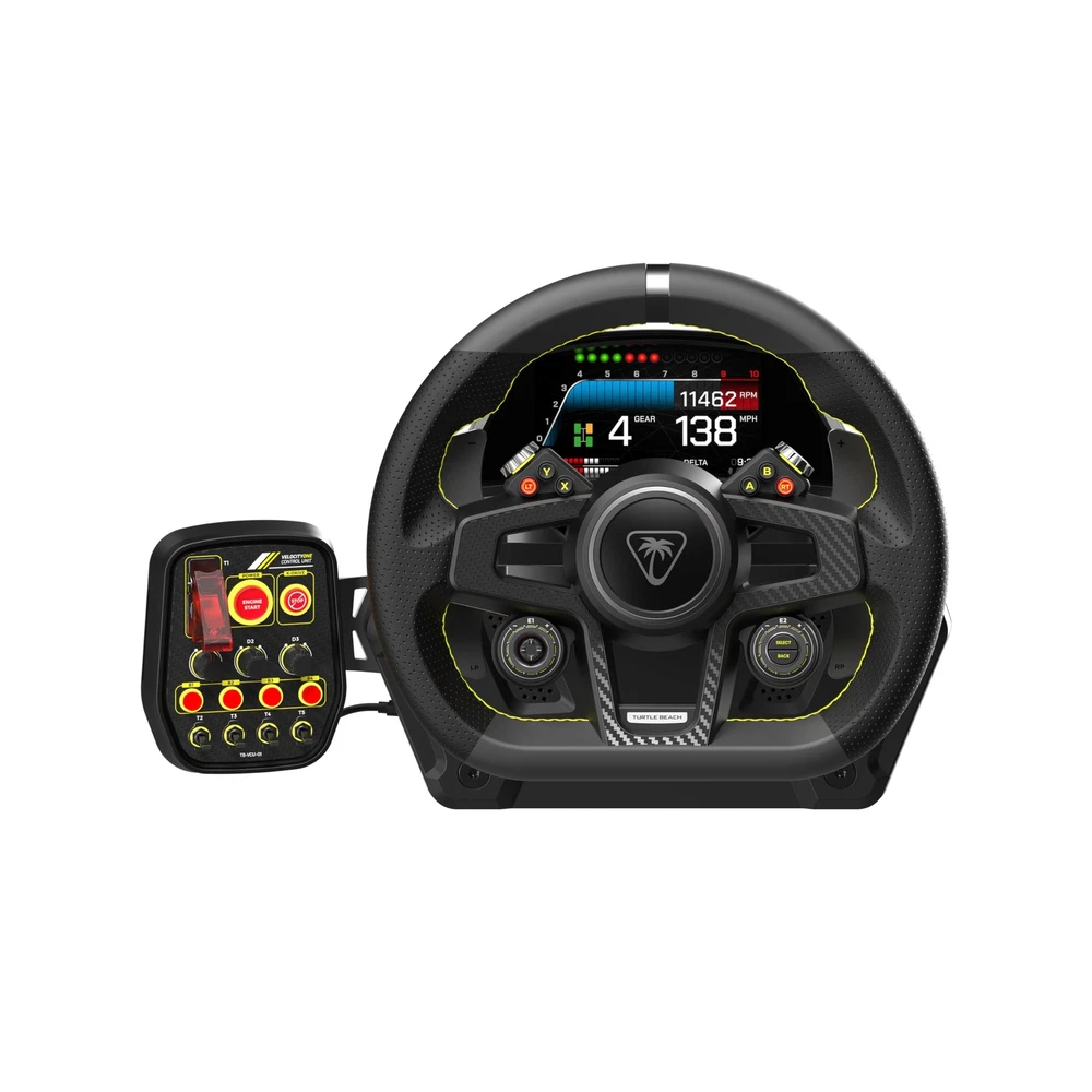 Turtle Beach VelocityOne Race Wheel & Pedal System Licensed for Xbox Series X|S, Xbox One, Windows PCs – 7.2Nm Direct Drive Force Feedback, 3 Pedals & Magnetic Paddle Shifters, Hall Effect Sensors Description Ultra-Realistic ImmersionShift into a new level of realism with the Turtle Beach VelocityOne Race Wheel & Pedal system engineered for high-fidelity racing simulation performance on Xbox Series X|S, Xbox One & Windows 10 & 11 PCs. High-fidelity direct-drive 7.2Nm force feedback is delivered by our custom K: Drive motor. Providing powerful response while maintaining smooth steering and detailed reactions to in-race events at low latency. The wheel rotation is set to 900 degrees by default out of the box but is fully adjustable in ten-degree increments from a minimum rotation of 90 degrees, all the way up to a maximum of 2,600 degrees of rotation. A hand-stitched, removable leather wheel enhances realism and improves your grip. Bang through the gears in a classic muscle car or glide in a modern supercar with the magnetic paddle shifters, offering reliable, consistent shifts every time. And for even more customization and ease of access, two additional analog paddles with magnetic hall effect sensors provide precise clutch and handbrake control.Race Management DisplayAn advanced digital dashboard gives you quick access to real-time telemetry and other critical vehicle performance data and full customization and integration with popular racing titles to maximize immersion. Direct data output can also be displayed in real-time based on authentic dashboard displays with supported racing titles. Tune every aspect of your driving experience including force feedback levels, braking, throttle & clutch response, control mapping and more. And with the VelocityOne Tuner companion app available on Xbox, PC and for iOS & Android devices, you can make product adjustments, control mappings, and do live product updates.Advanced Aluminum Pedal SetA fully adjustable aluminum pedal set can be adapted to the type of car you are using, or for personal preference. The Dynamic Brake Tek load-cell braking system provides up to 50kg/f of force for ultra-realistic braking performance with authentic response based on the force you apply to the pedal, just like in a real car. And with left-to-right adjustment of the pedal, you can position it just right based on your preference. An integrated clutch pedal is ideal for stick shift driving, or if you prefer to use the clutch paddles on the wheel, the clutch pedal can be lowered to give more space for brake and throttle control.Race-Inspired ControlsThe VelocityOne Race Control Unit was built with inspiration from real-life controls and provides easy access to critical car systems and setting adjustments. The VCU Includes 6 buttons, 5 latched toggle switches, and 3 rotary dials, and features a modular design with USB-C connection so you can mount the unit by itself, or on either side of the wheel.Versatile DesignThe VelocityOne Race has a modular design, made for future product upgrades & updates and for maximum versatility in your permanent or temporary home racing setup. Mount the VelocityOne Race to most sim racing stands using the pre-drilled holes with included screws or the included low-profile clamp. Both are designed to handle the force feedback of the wheel, while not getting in the way underneath. The pedals also feature pre-drilled holes and screws, plus adhesive rubber pads for multi-surface floor mounting.Authentic, Complete Setup: For drivers that want to lead the pack, the VelocityOne Race system delivers superb performance with an authentic design.Ultra-Realistic, K: Drive Force Feedback Motor: Feel every moment of a race with a custom 7.2Nm direct- drive force feedback motor tuned for high-fidelity kinetic response, with up to 2,600 degrees of rotation.Smooth, Magnetic shift Paddles: Two Magnetic Shift paddle shifters allow you to glide through the gears in any vehicle, with smooth, reliable shifting. Plus, two additional analog paddles provide precise clutch and handbrake control.Race Management Display: Advanced digital dashboard for real-time race telemetry, full customization, and integration with popular racing titles to maximize immersion and improve performance. Game support dependent on developer integration. See compatibility list for regular updates.Customizable Pedal Set: Experience ultimate racing immersion with a fully adjustable throttle, brake, and clutch pedal set that you can dial-in to your exact preferences.Tuned, Load-Cell Braking System: Dynamic Brake Tek load-cell braking system provides up to 50kg/f of force, with braking performance measured by the force you apply to the pedal, and not the distance the pedal travels.VelocityOne Control Unit: The detachable VelocityOne Control Unit (VCU) is built with a modular design and provides easy access to critical car systems and setting adjustments.Premium, Racing- Grade Materials: A removable hand-stitched leather steering wheel, aluminum throttle, clutch and brake pedal assembly, and performance car-inspired controls bring the racetrack realism to your home setup.VelocityOne Tuner Companion App: Download the Tuner app to your Xbox console, PC, iOS, or Android smartphone to adjust product performance, make updates, and download any future expansion content.Versatile Mounting Solutions: A low-profile mounting clamp or pre-drilled holes and screws keeps your wheel secure at full torque, and adhesive rubber pads ensure the pedals stay firmly planted on any floor surface.Turtle Beach Audio Tuning: Select from five different audio presets including Superhuman Hearing or create and save your own custom preset to dial in audio to your exact preference.Multi-platform Compatibility: VelocityOne Race is officially licensed for Xbox Series X|S & Xbox One and works great with your favorite racing titles on Windows 10 & 11 PCs. Features: Authentic, Complete Racing Setup for Xbox & PC Ultra-Reali