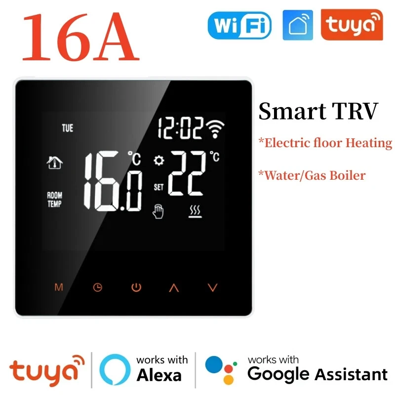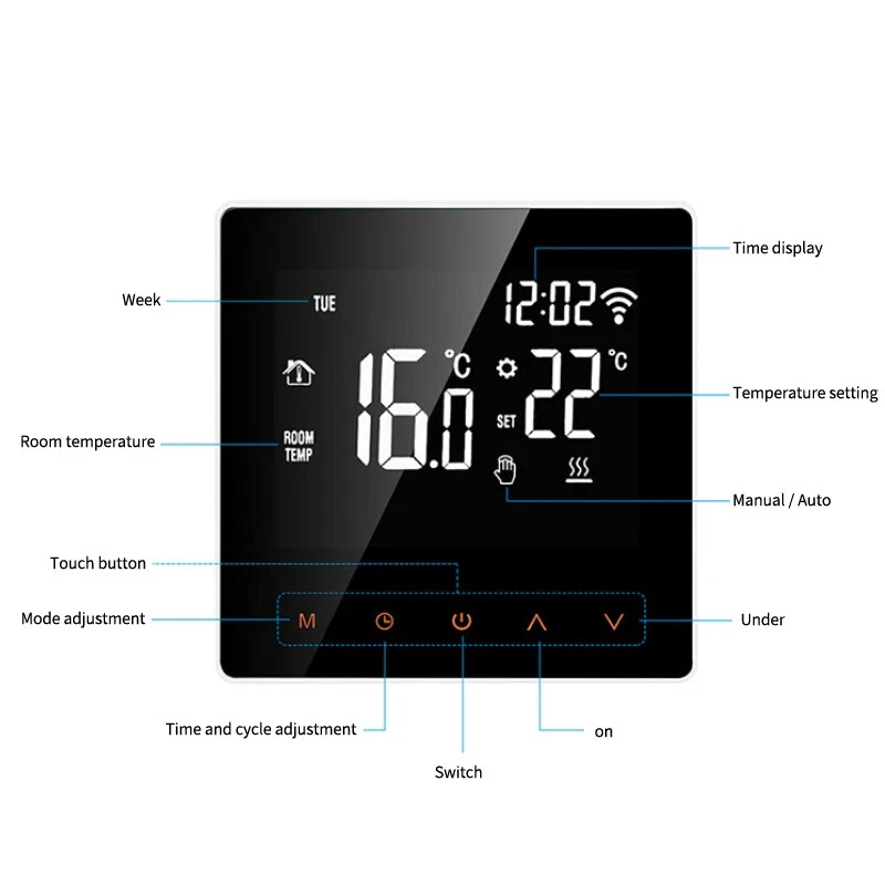 Description: [ LCD Touch Display ] - Elegant appearance, one face design, anti-scratch. Large LCD touch screen display with back light, easy to read. [ APP /Voice Control ] - Smart thermostat that can be controlled by your phone before you come back home. (APP: Tuya / Smart life. voice control by Goolge home alexa) [ Manual/ Auto Mode] - Free to choose manual mode or auto mode for different purposes. [ Accurate Temperature ] - Internal sensor floor sensor, perceptive ambient temperature and the floor's temperature. Automatically obtain the temperature, 1°C accuracy. [ Weekly Programmable ] - The thermostat supports different temperature setting accordingly with 6 time-modes daily. [ Memory Function ] - No need to worry about power failure, data memory when power is off. [ Children Lock ] - Keypad locking function is designed to prevent children from operating by mistake. [ Application ] - Suitable for electric heating/water gas boiler/water heating.Perfect for home, office, shopping mall, hotel, etc. Specifications: -- Type: Wi-Fi smart thermostat -- Material:anti-flammable PC -- Voltage:110-230V AC,50/60HZ -- Max. Current Load: 16A/3A -- Temperature Accuracy: 1℃ -- Temperature Setting: 5-95℃ -- Key: Touch Key -- Item Size: 86 * 86 * 40mm / 3.4 * 3.4 * 1.6in Package Included: 1*EU Toucn Switch 1*User Manual