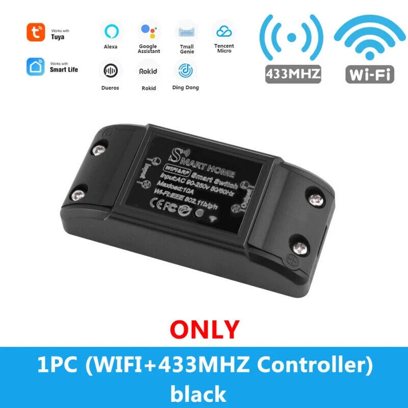 Tuya Wifi Smart Switch RF 433Mhz Wireless Remote Control Relay Timer Voice Control Smart Home with Alexa Home Description: 【WiFi+433】WiFi connection, you can remote control by mobile phone APP + voice speaker control. 433 function, you can buy 433 freely sticky panel by yourself, you can control the same electrical appliance in different places in the house. 【Four control methods】APP+voice control+433 MHZ RF wireless switch+Controller module switch 【APP remote control】 Tuya or smart life APP can be used to remotely control the switch on and off. You can see the open or closed state of the curtains from the APP when you are away. 【Link with other smart devices】It can be connected to other smart devices to realize a convenient smart life together. A home mode can be created and linked with other smart devices to automatically open the curtains as soon as you go home. 【Support voice speaker control】 The switch is compatible with Alexa and Home Assistant, allowing you to use the voice control smart switch to turn on/off. 【Timing】 The smart switch is automatically turned on and off at a given time through the timer function. Choose the time you want to wake up, automatically open the curtains, so you can easily enter the day; choose the time you want to close the curtains. 【Share】The control switch can be shared with family members. Specifications: Working voltage:AC90-250V 60HZ/50Hz Wifi:IEEE 802.11b/g/h RF working frequency:433.92MHZ Size:87*39*23mm Maximum current:10A Package Included: 1*Smart Switch Module